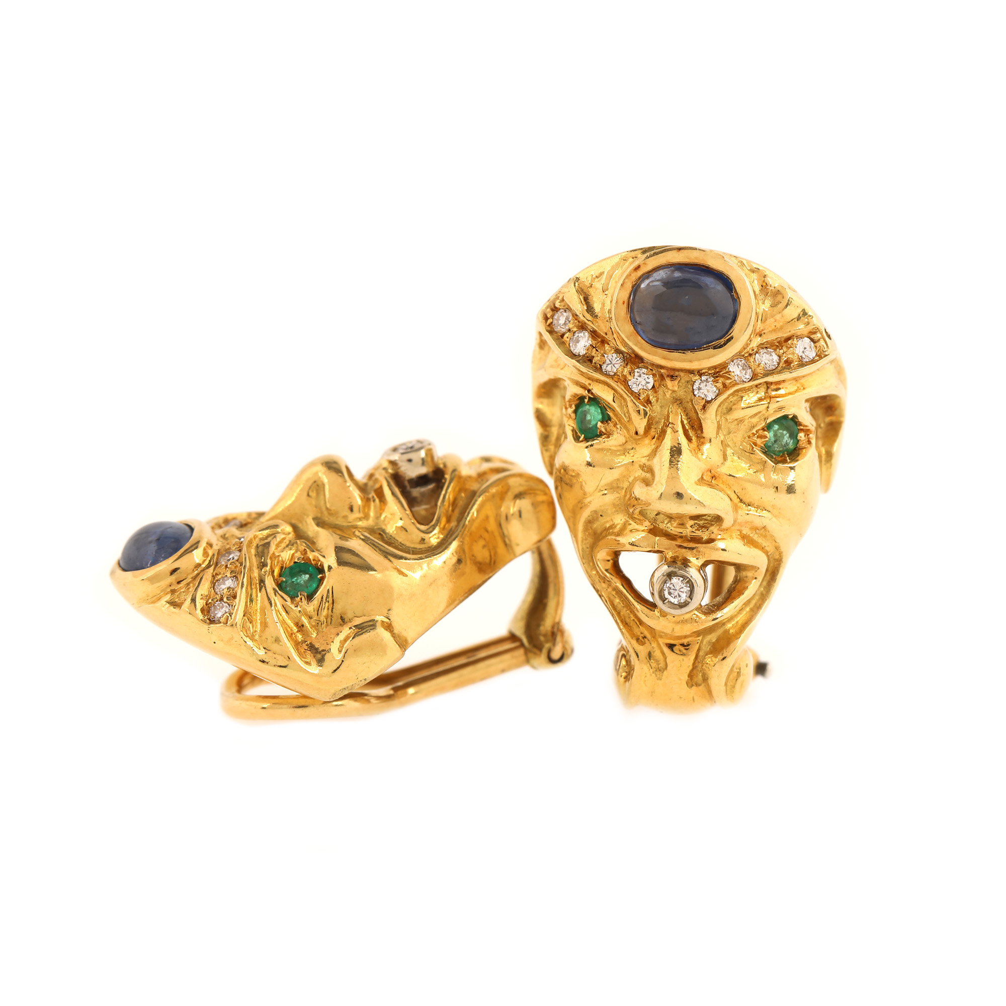 2 safire ovale caboșon, culoare albastru, claritate SI, cca. 0,80 ct.; 4 smaralde rotund fațetate, culoare verde, claritate SI, cca. 0,10 ct. și 18 diamante rotunde briliant, culoare G-H, claritate VS2-SI2, cca. 0,18 ct.