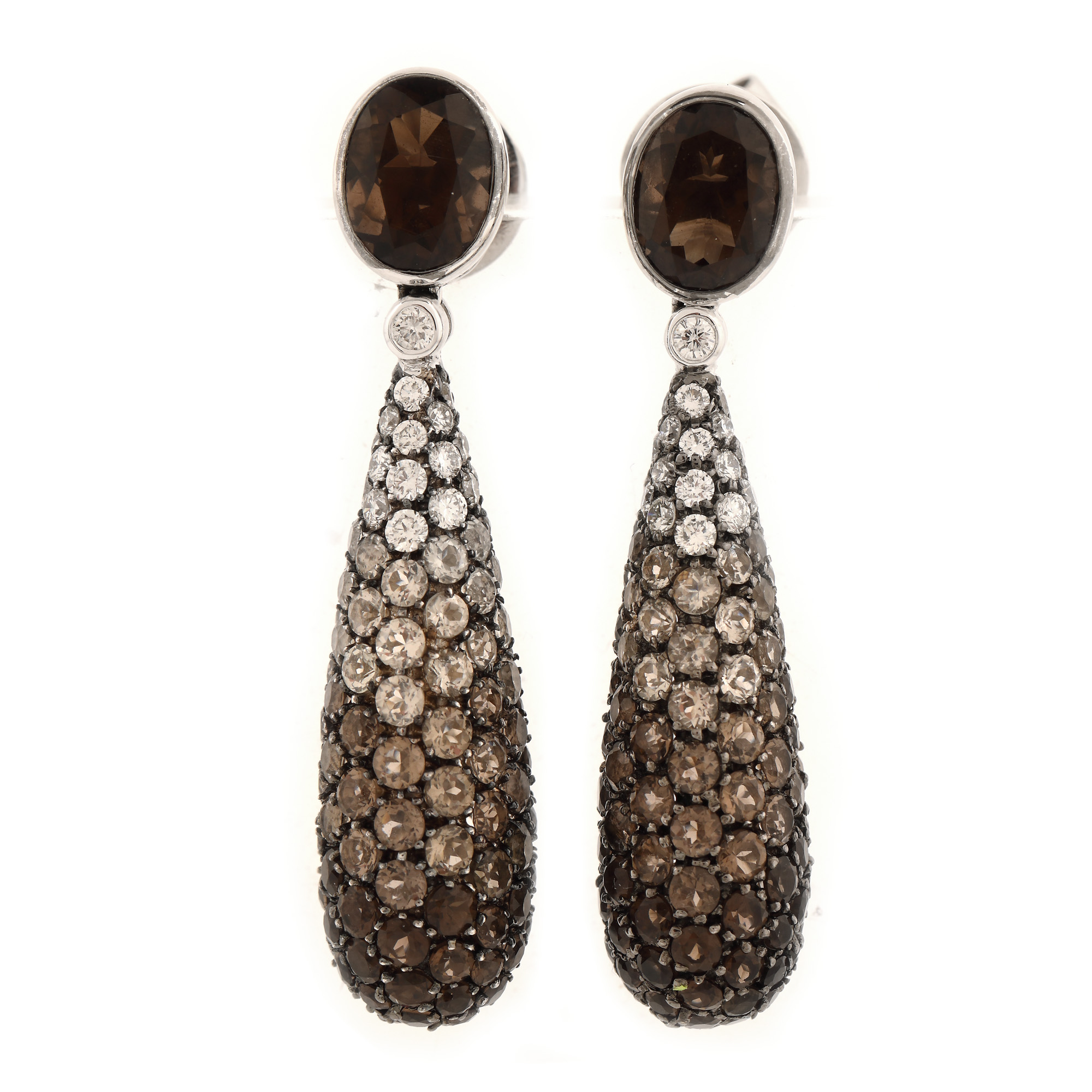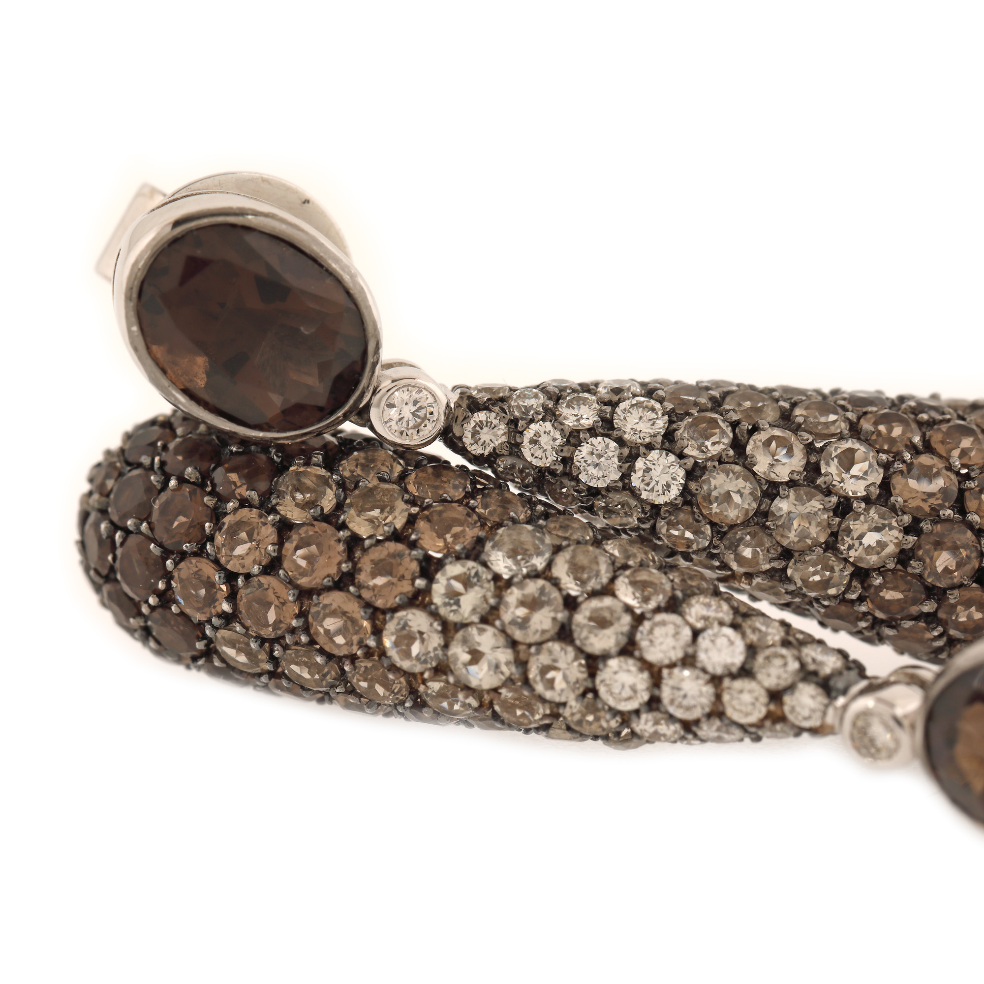 189. Pereche de cercei din aur alb, ornată cu diamante și cuarțuri fumurii