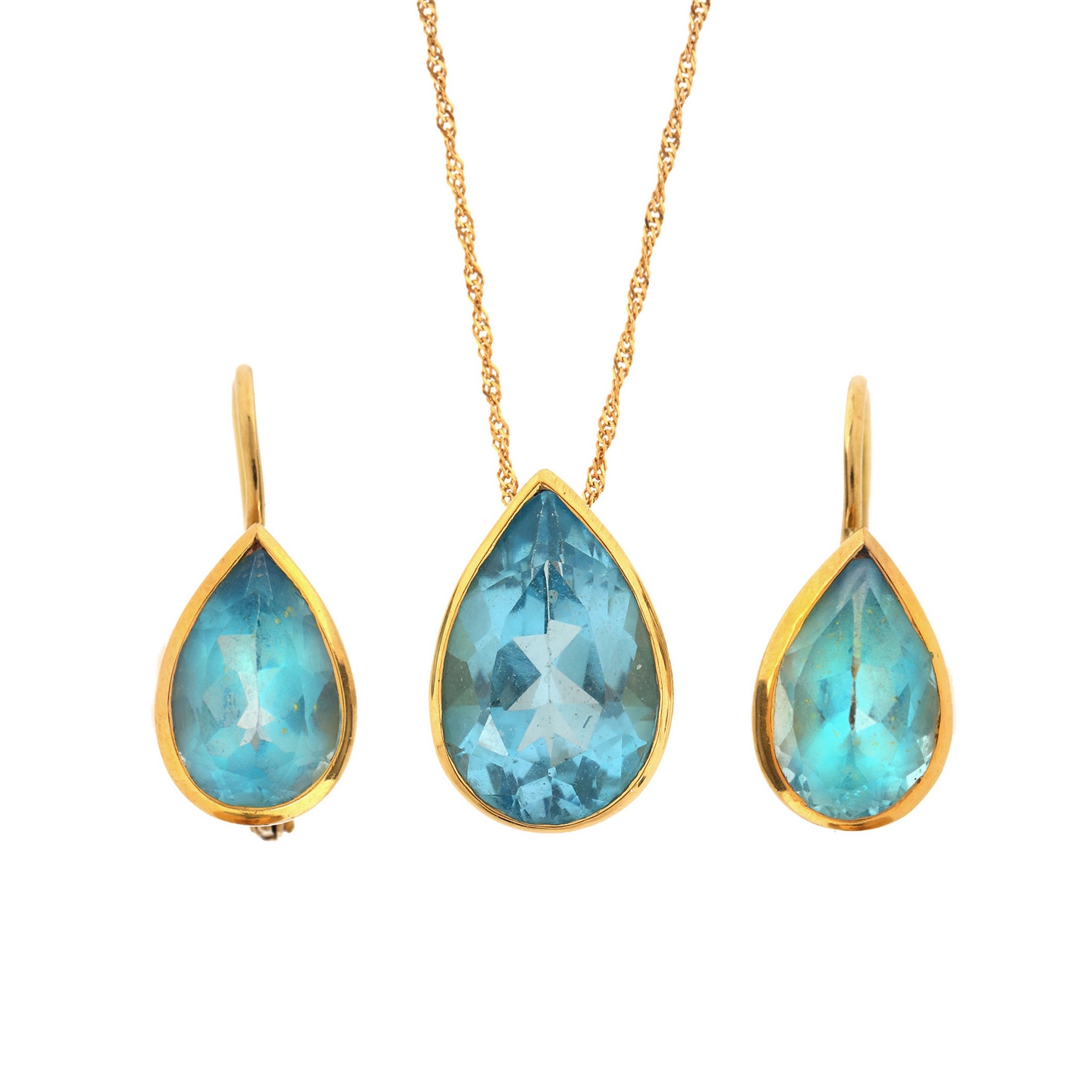 108. Set din aur, format din lanț cu pandantiv și pereche de cercei, ornat cu topaze