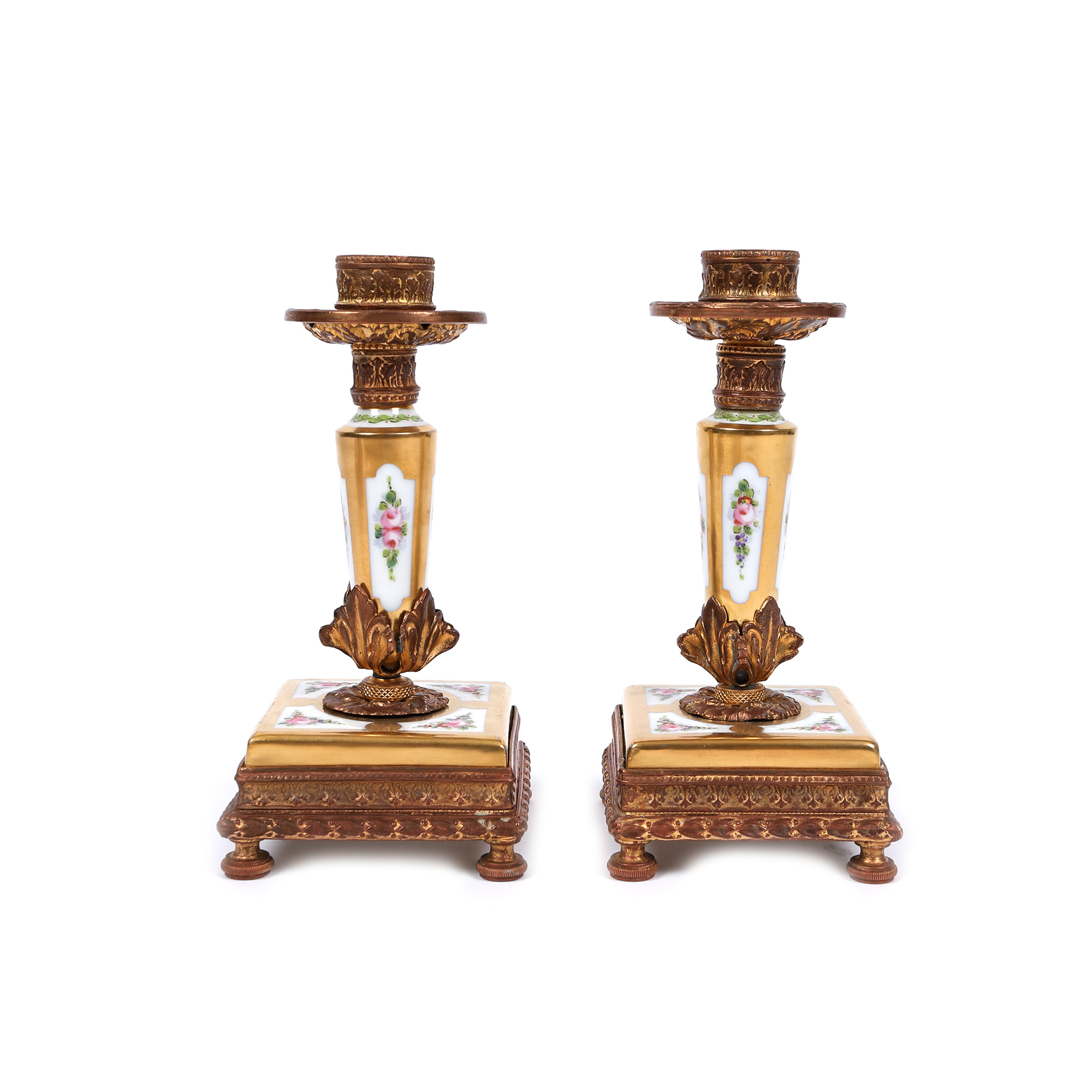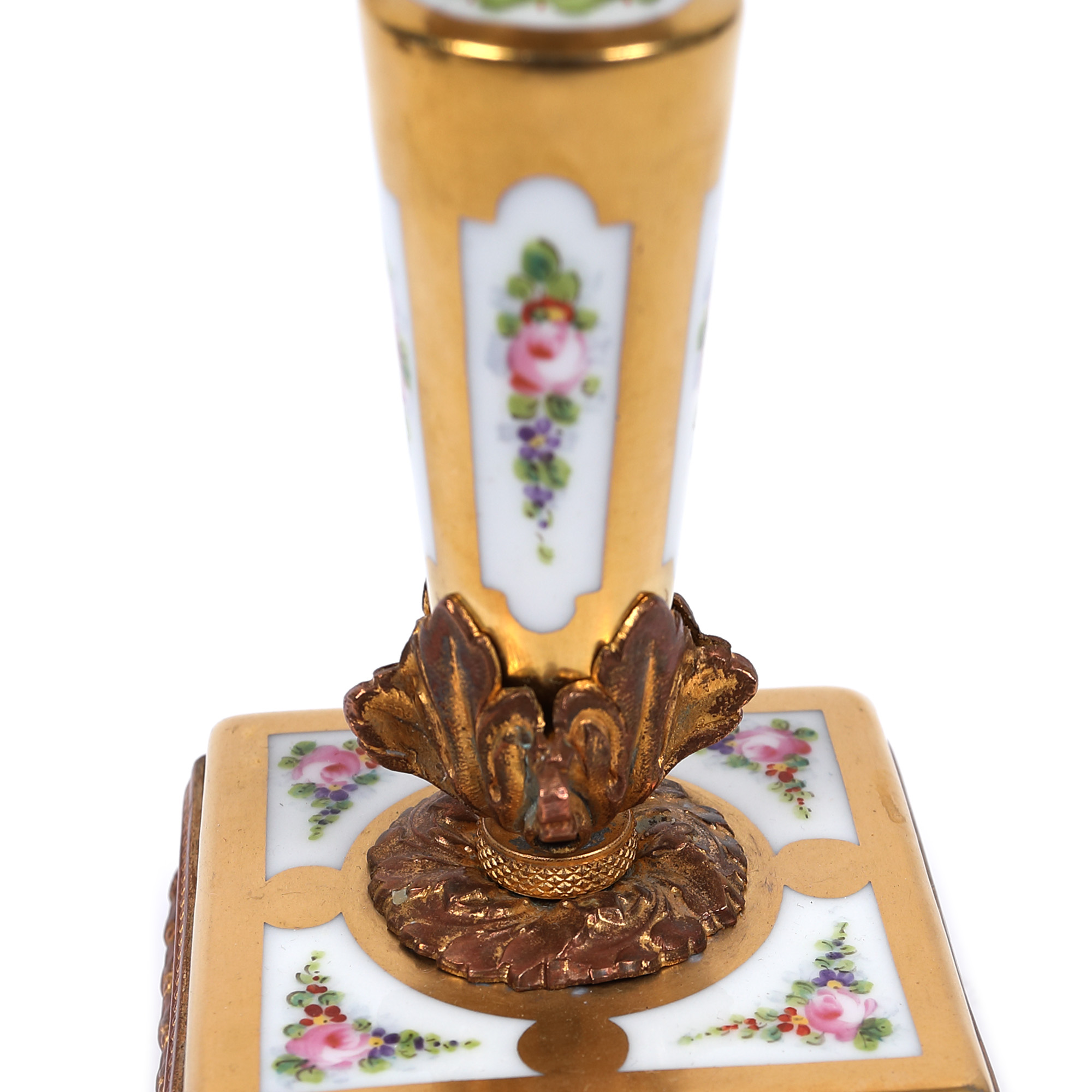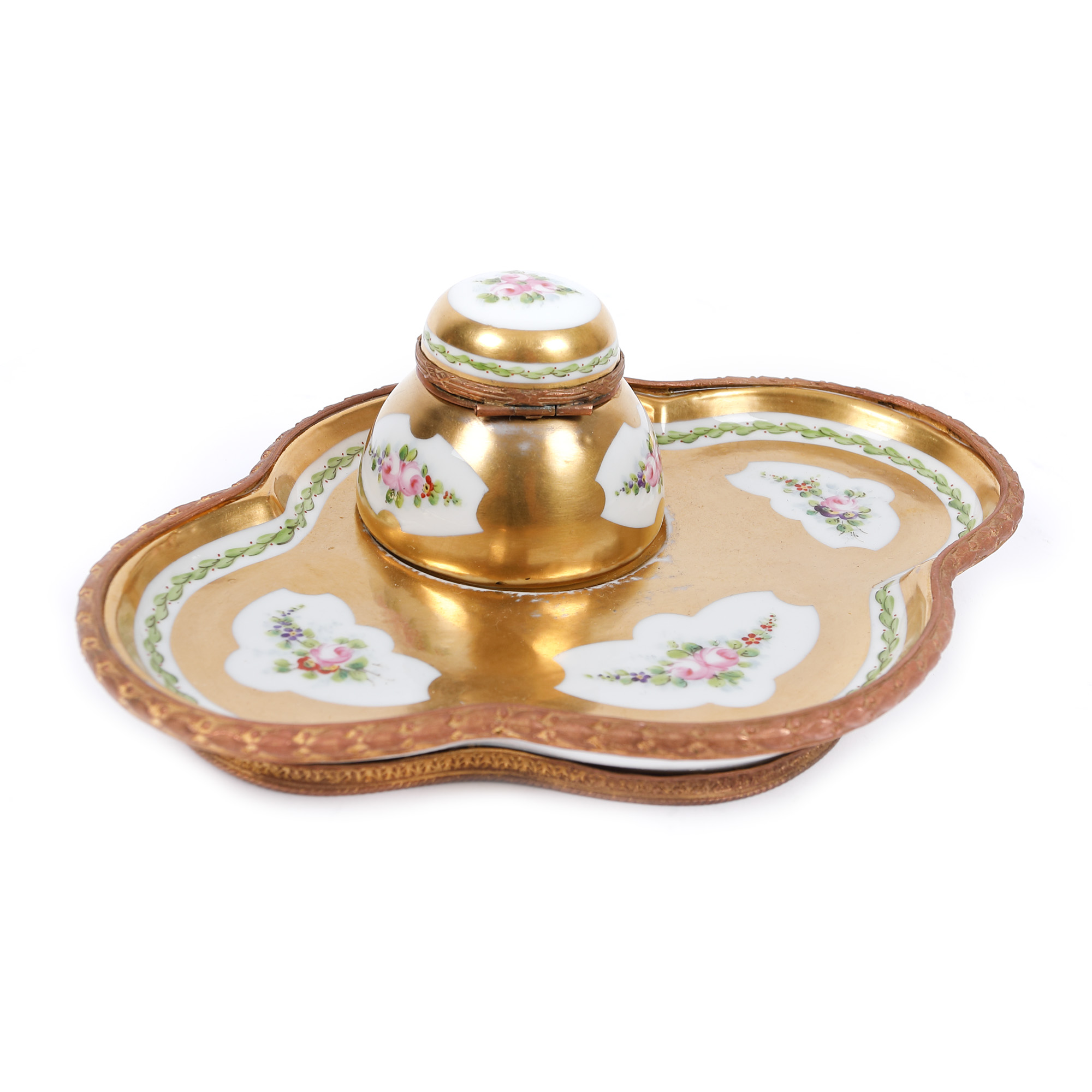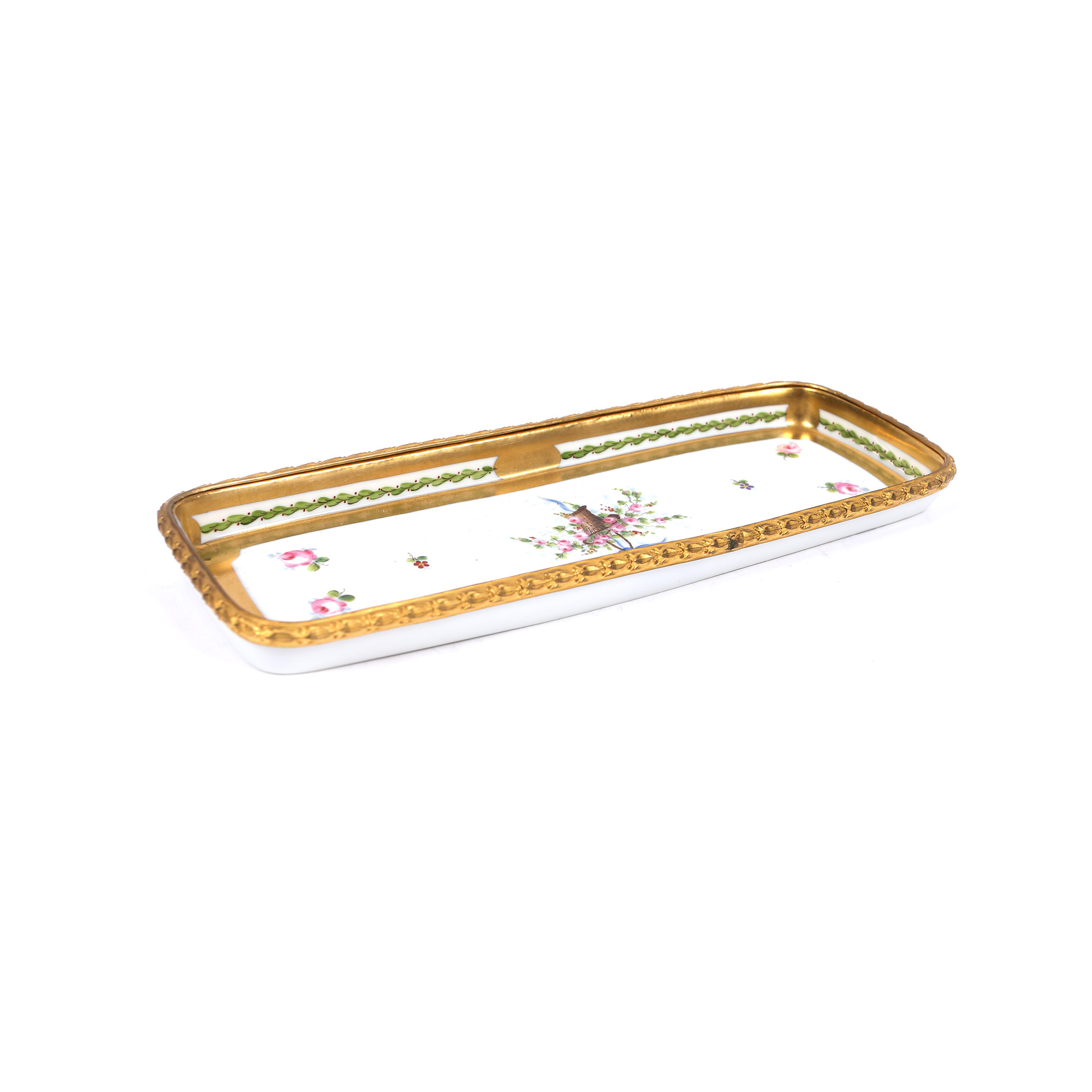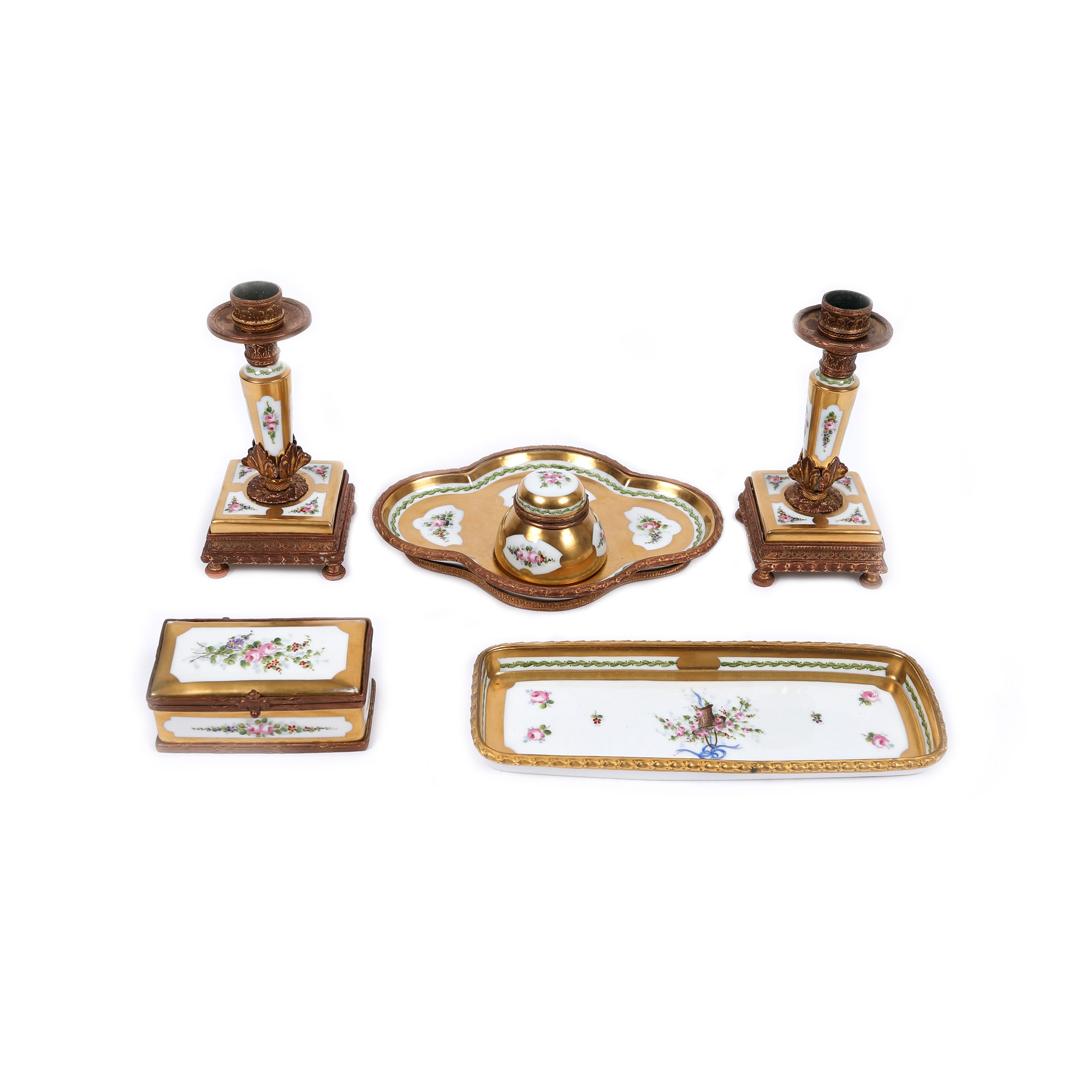 90. Set din porțelan pentru birou, de damă, format din pereche de sfeșnice, tavă și călimară, cutiuță pentru penițe și tavă [Sfârșitul sec. XX]