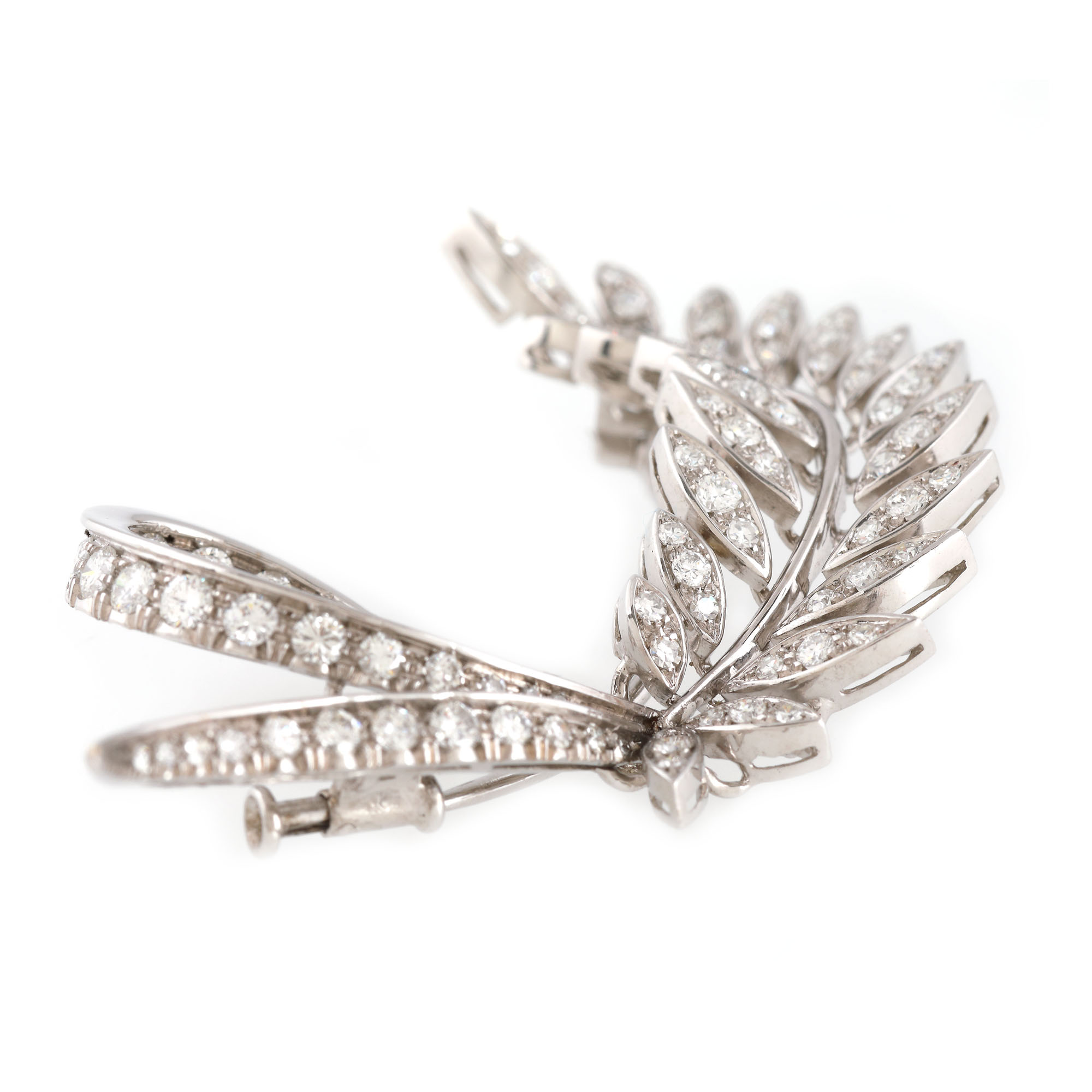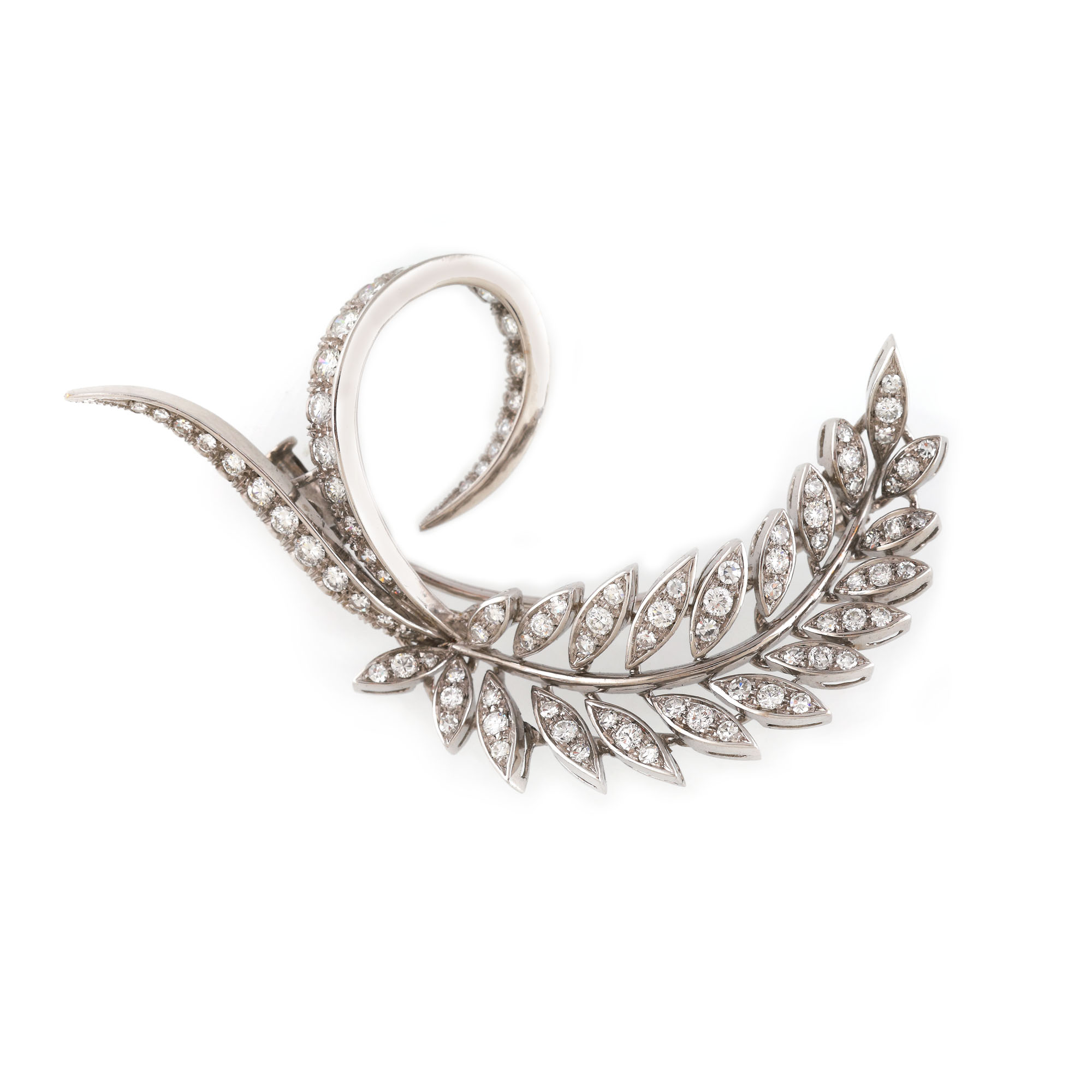 53. Broșă din aur alb, în forma unei ramuri cu frunze de diamant