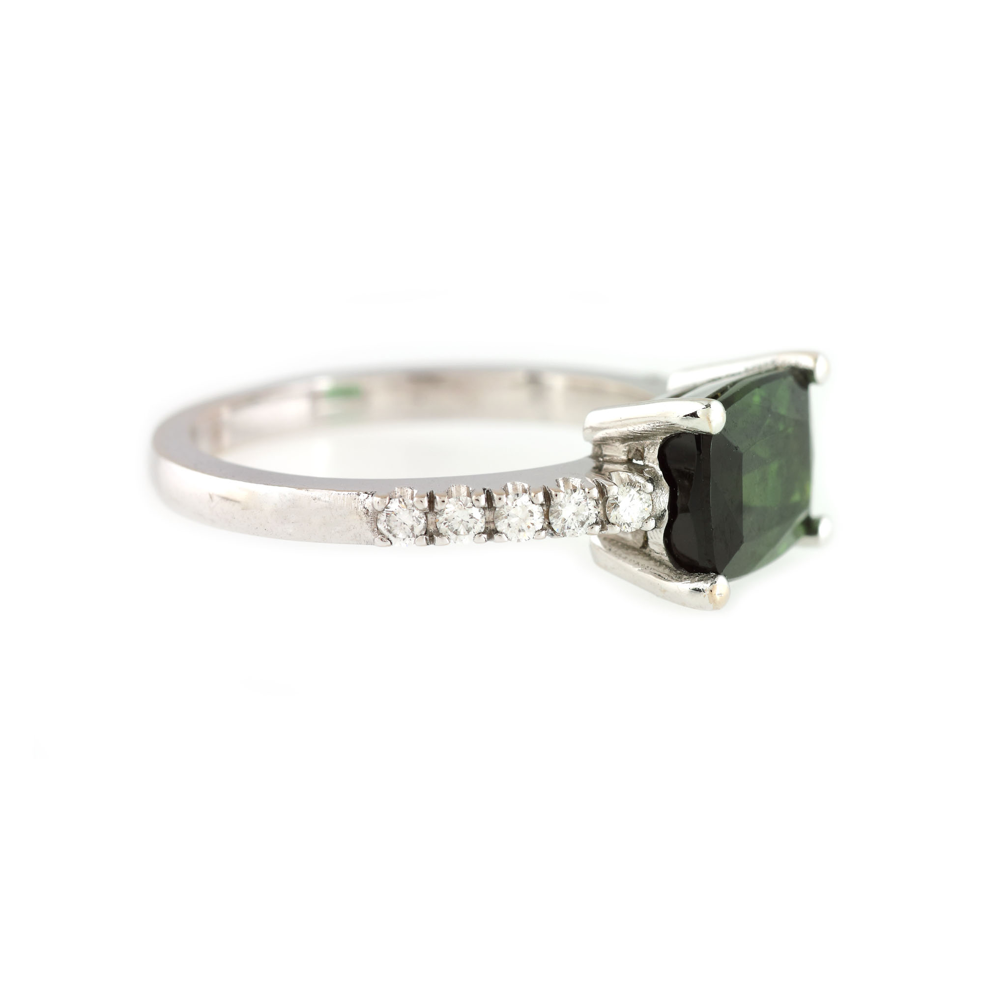 1 turmalină rectangulară, culoare verde, claritate eye-clean, cca. 2,05 ct. și 10 diamante rotunde briliant, culoare G-H, claritate VS, cca. 0,2 ct.