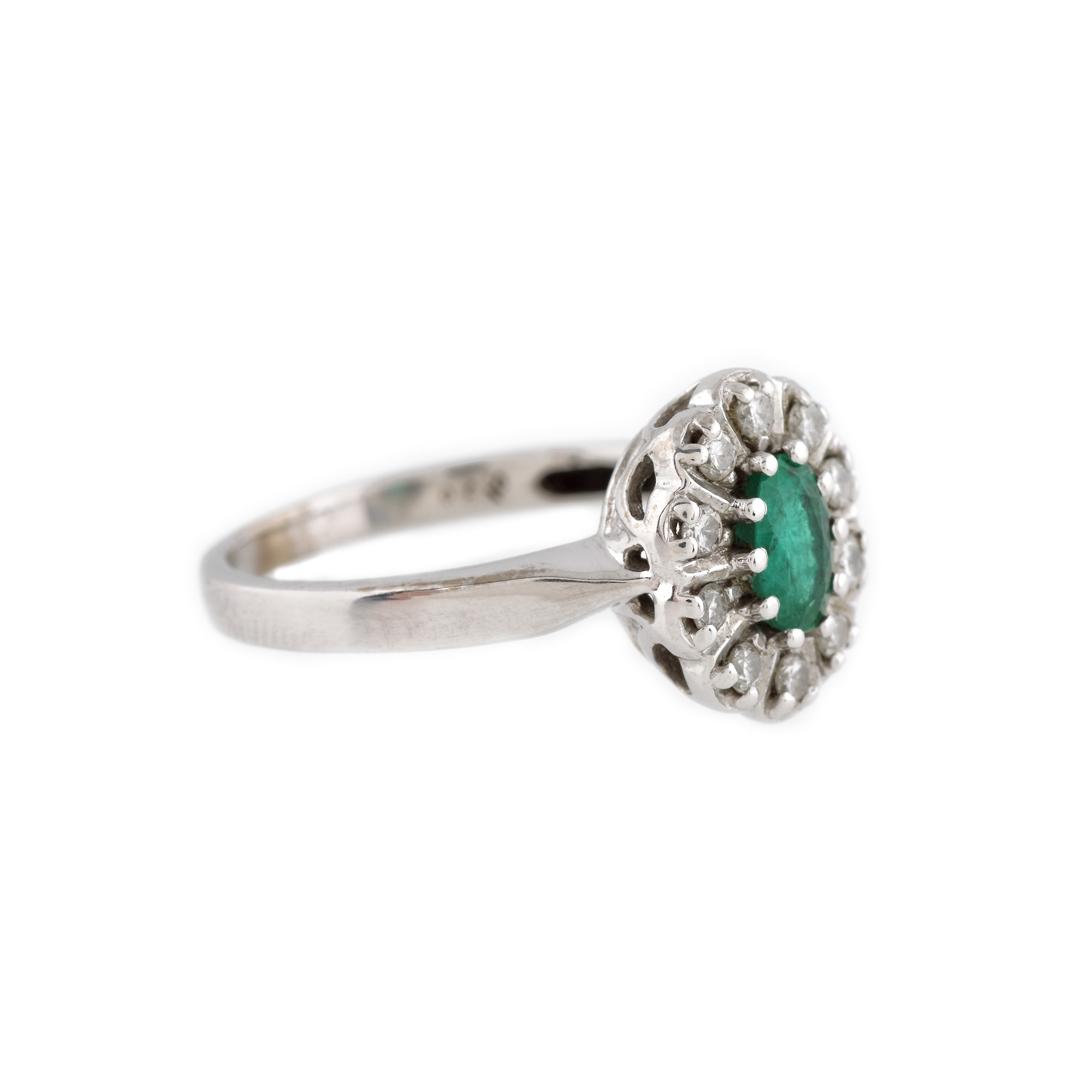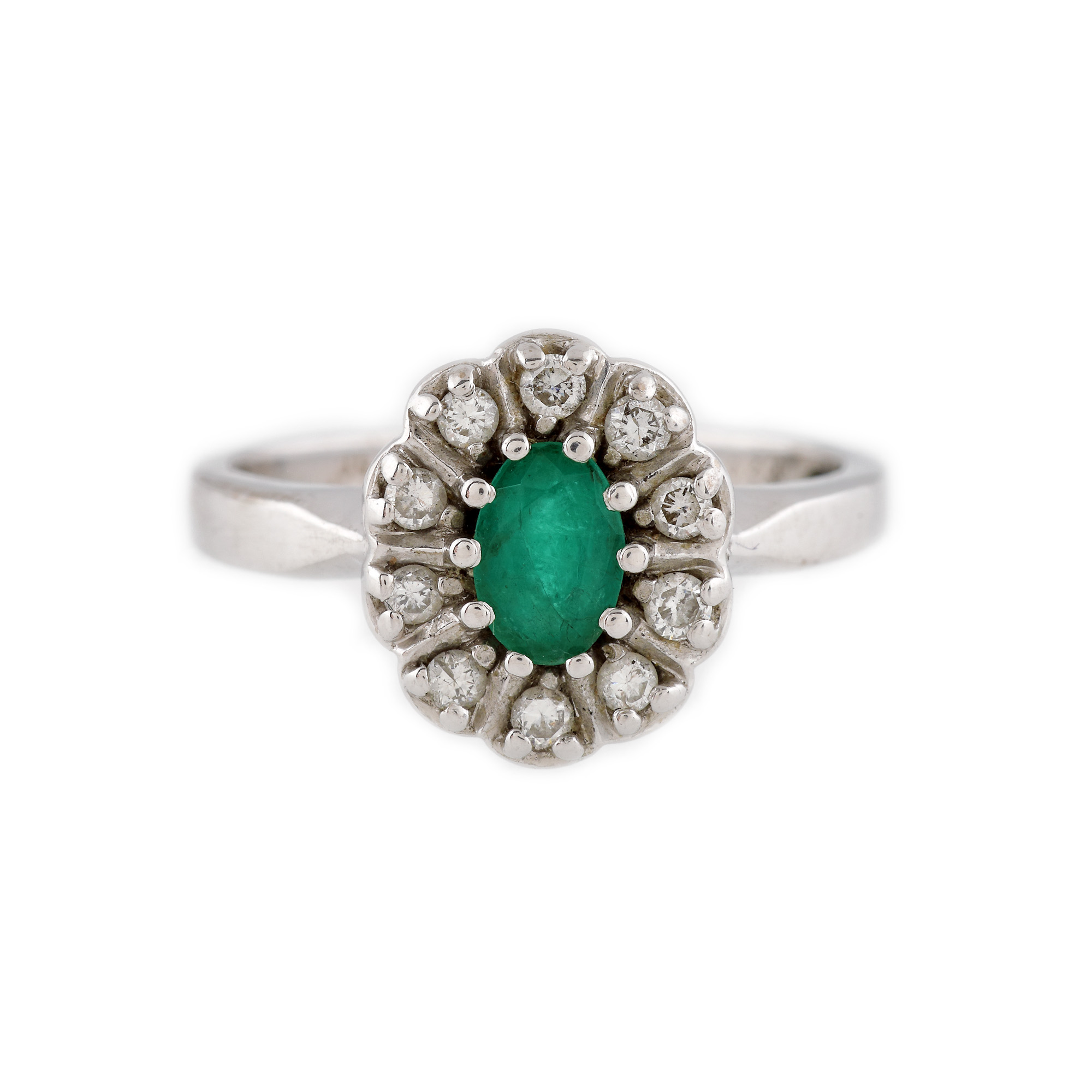 1 smarald oval fațetat, culoare verde, claritate moderately included, cca. 0,48 ct. și 10 diamante rotunde briliant, culoare G-H, claritate VS2-SI, cca. 0,20 ct.