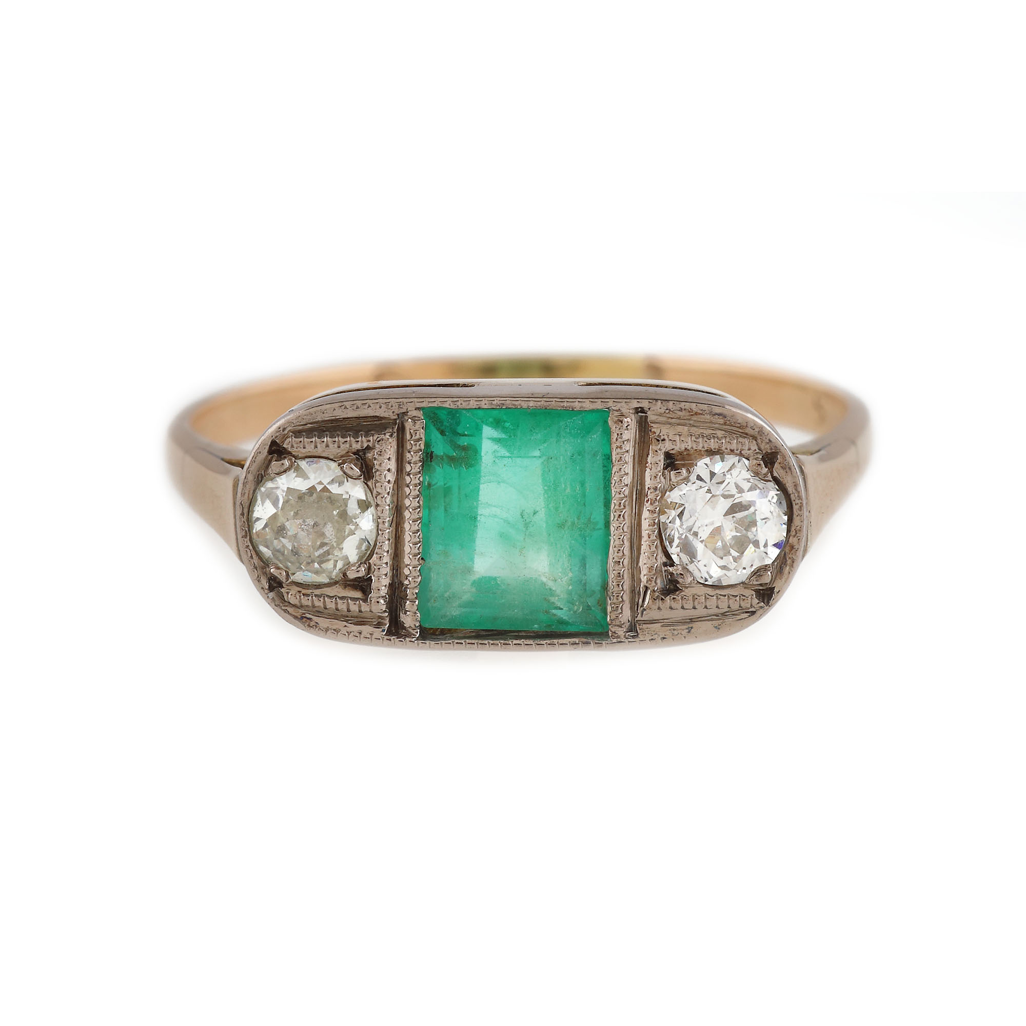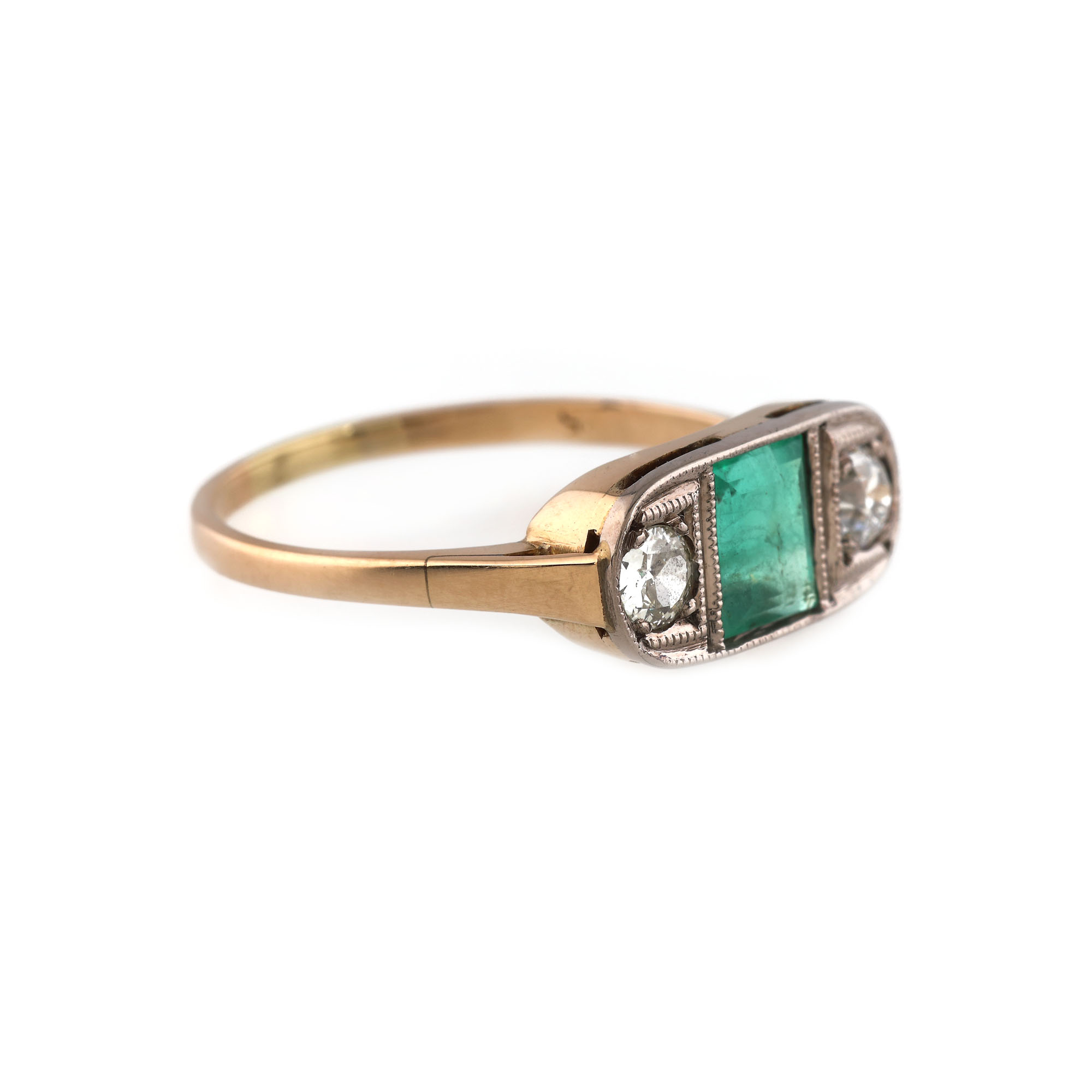 1 smarald rectangular step cut, culoare verde, claritate moderately included, cca 0,7 ct.; 2 diamante european cut, culoare H-I, claritate slightly included, cca 0,3 ct.