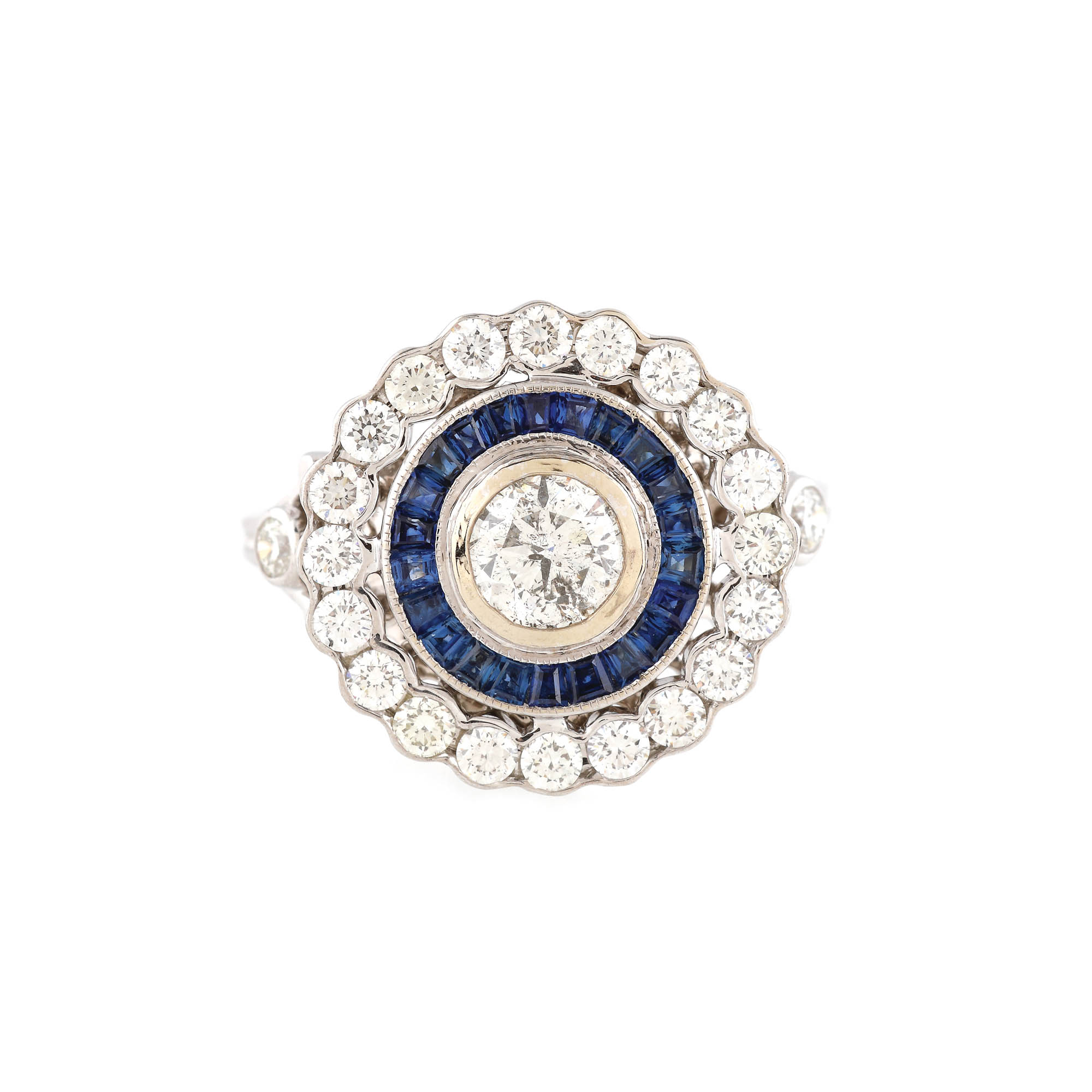 87. Inel în manieră Art Deco, din aur alb, decorat cu diamante și safire dispuse concentric