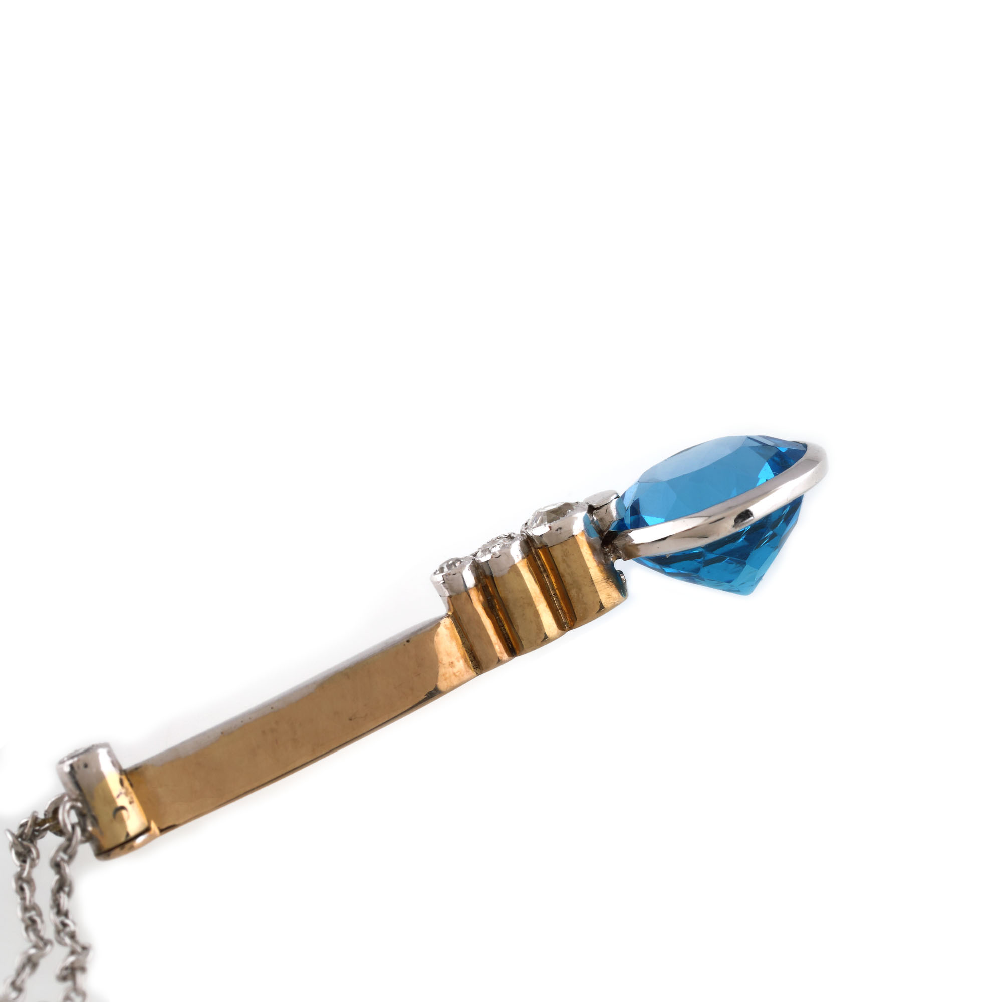 1 topaz rotund fațetat, culoare bleu, claritate eye-clean, cca. 3,6 ct.și 4 diamante (3 european cut, 1 single cut), culoare H-I, claritate SI, cca. 0,16 ct.