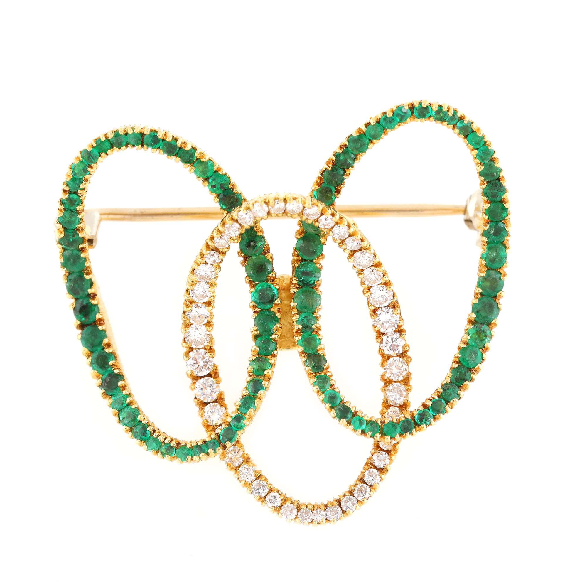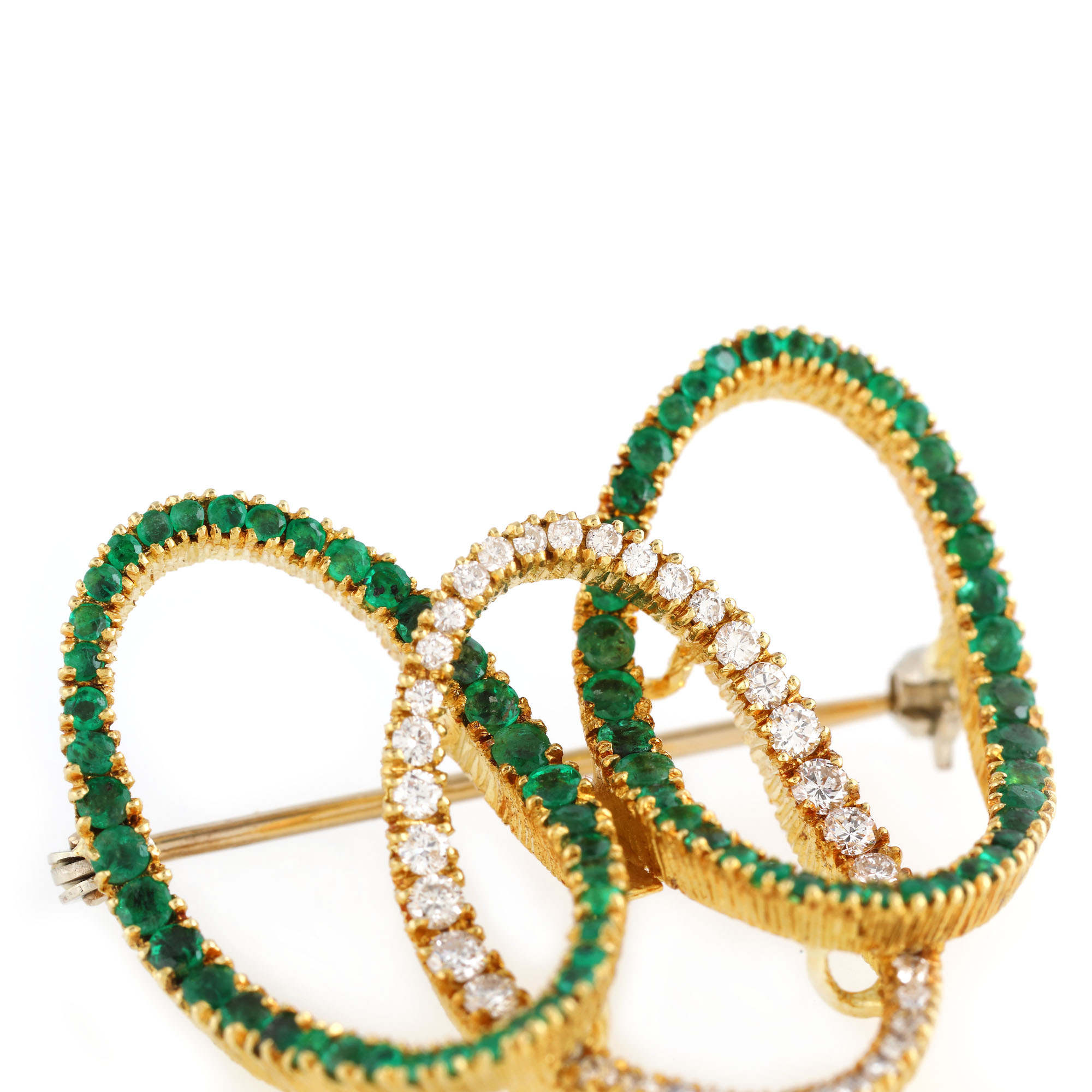 76. Interesantă broșă din aur, decorată cu diamante și smaralde