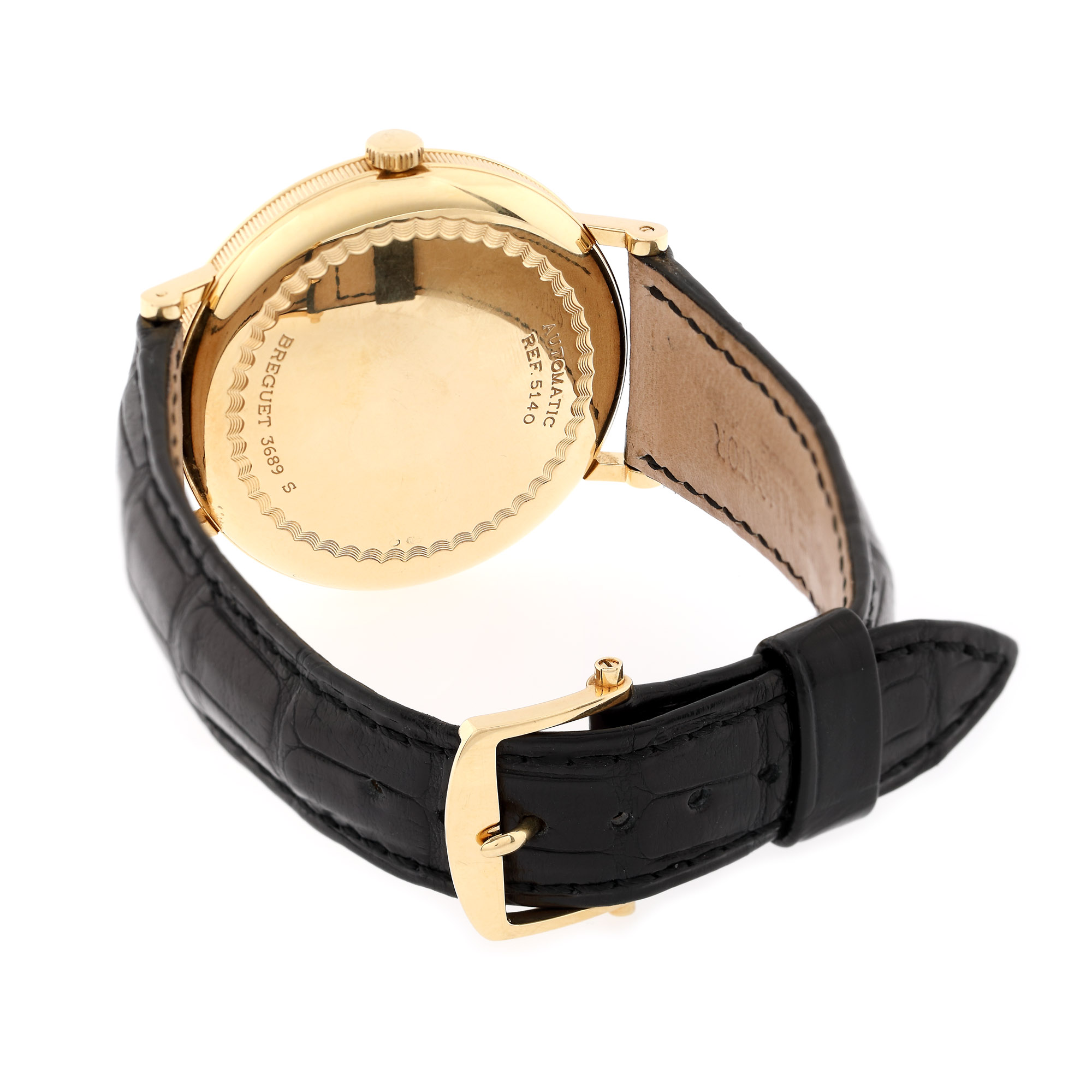 Ceas Breguet Classique, din aur, de mână, bărbătesc, referință 5140 BA/12/SWG, mecanism automatic. Cadran silver decorat în tehnica guilloché, numerale romane și registru pentru secundar între orele 5 și 6. Curea din piele de aligator, de culoare neagră și cataramă din aur, adăugate aftermarket.