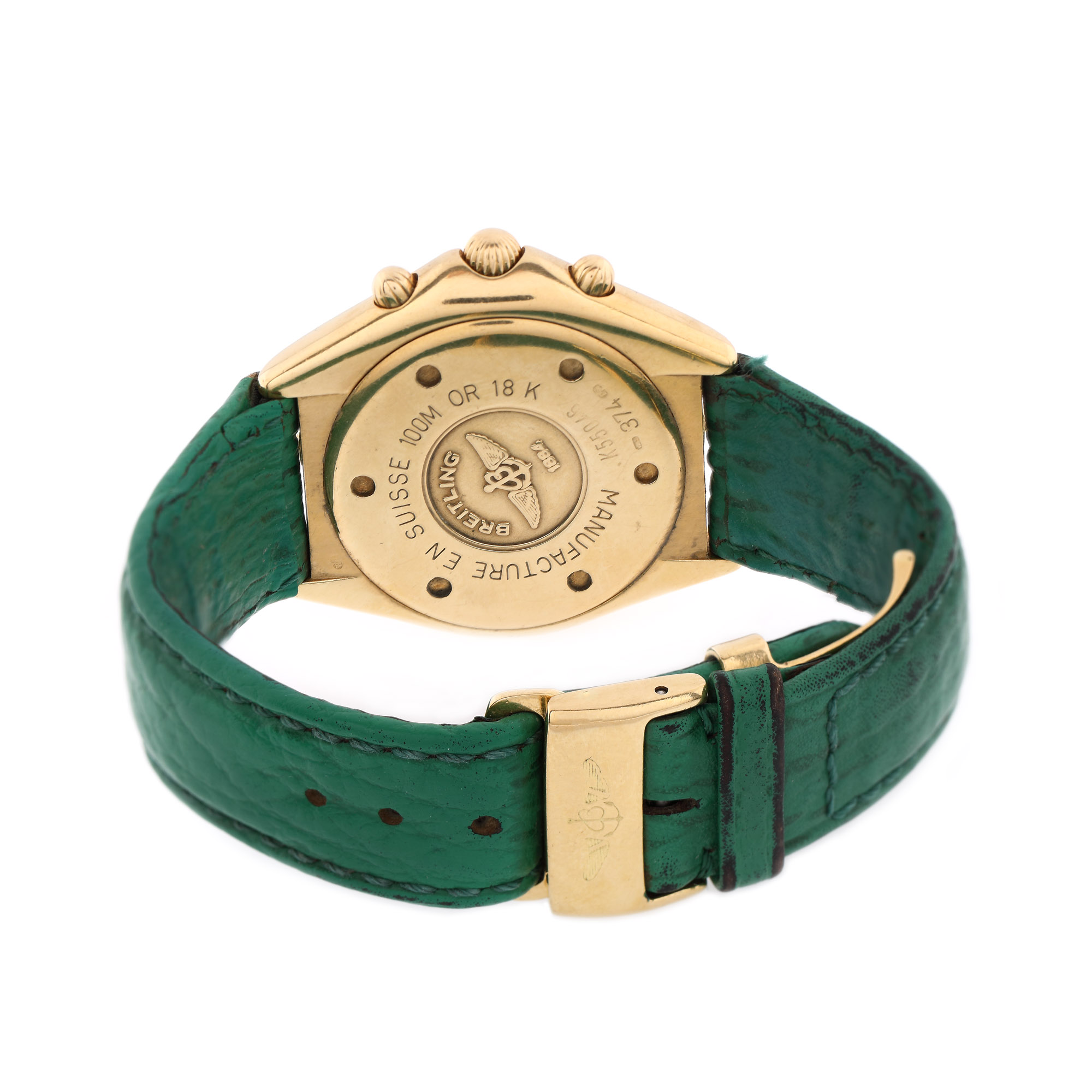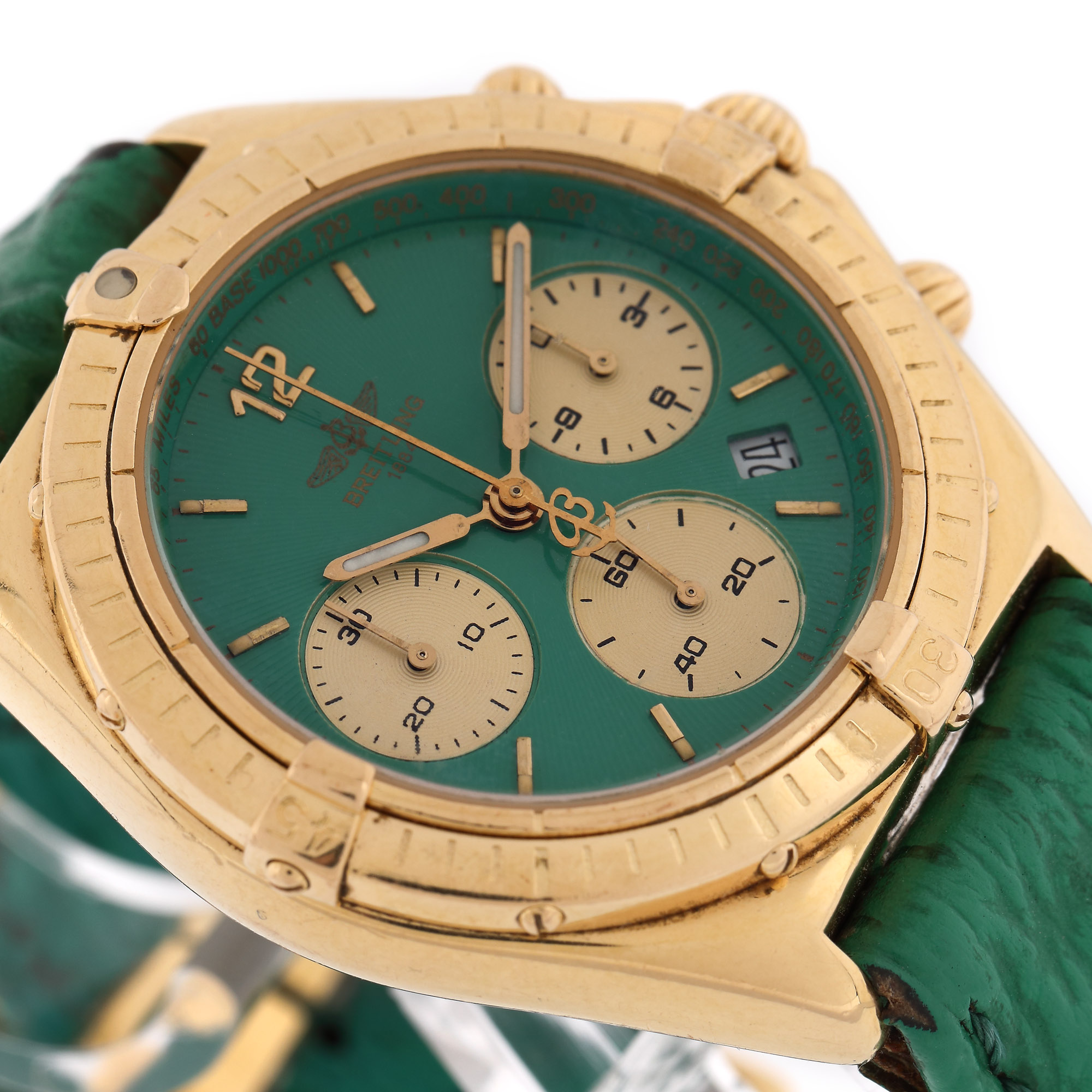 Ceas Breitling Sextant, din aur, de mână, de damă, referință K55046, mecanism quartz. Cadran din email, de culoare verde, numerale arabe, trei registre și registru pentru dată între orele 4 și 5. Curea din piele, de culoare verde, adăugată aftermarket și sistem de închidere tip deployant, din aur, original.