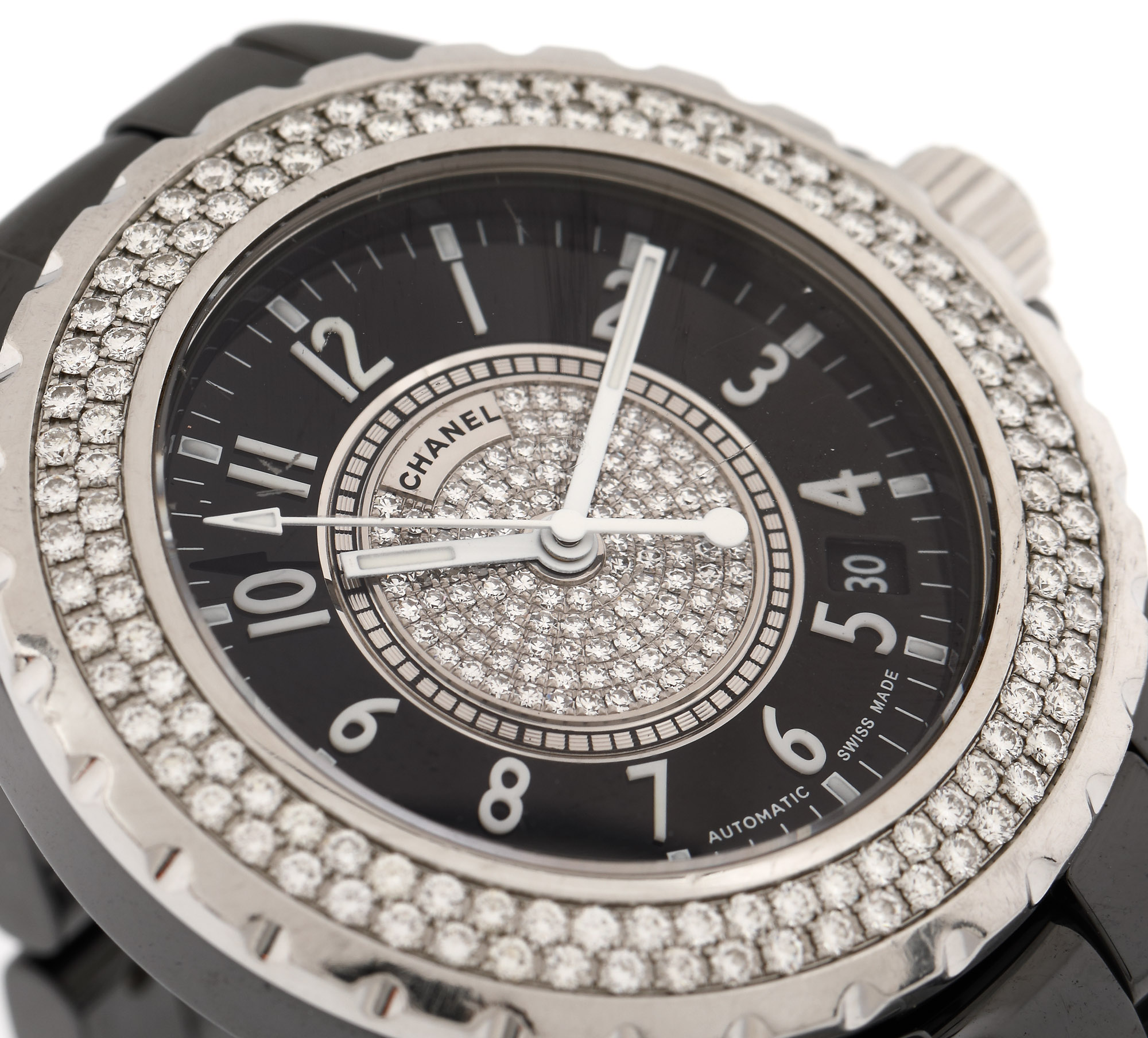 Ceas Chanel J12 Diamond Dial, de mână, unisex, referință H1709, mecanism automatic. Cadran de culoare negru, parțial pavat cu diamante, numerale arabe și bezel rotativ decorat cu diamante. Brățară și sistem de închidere tip deployant, din ceramică, originale.
