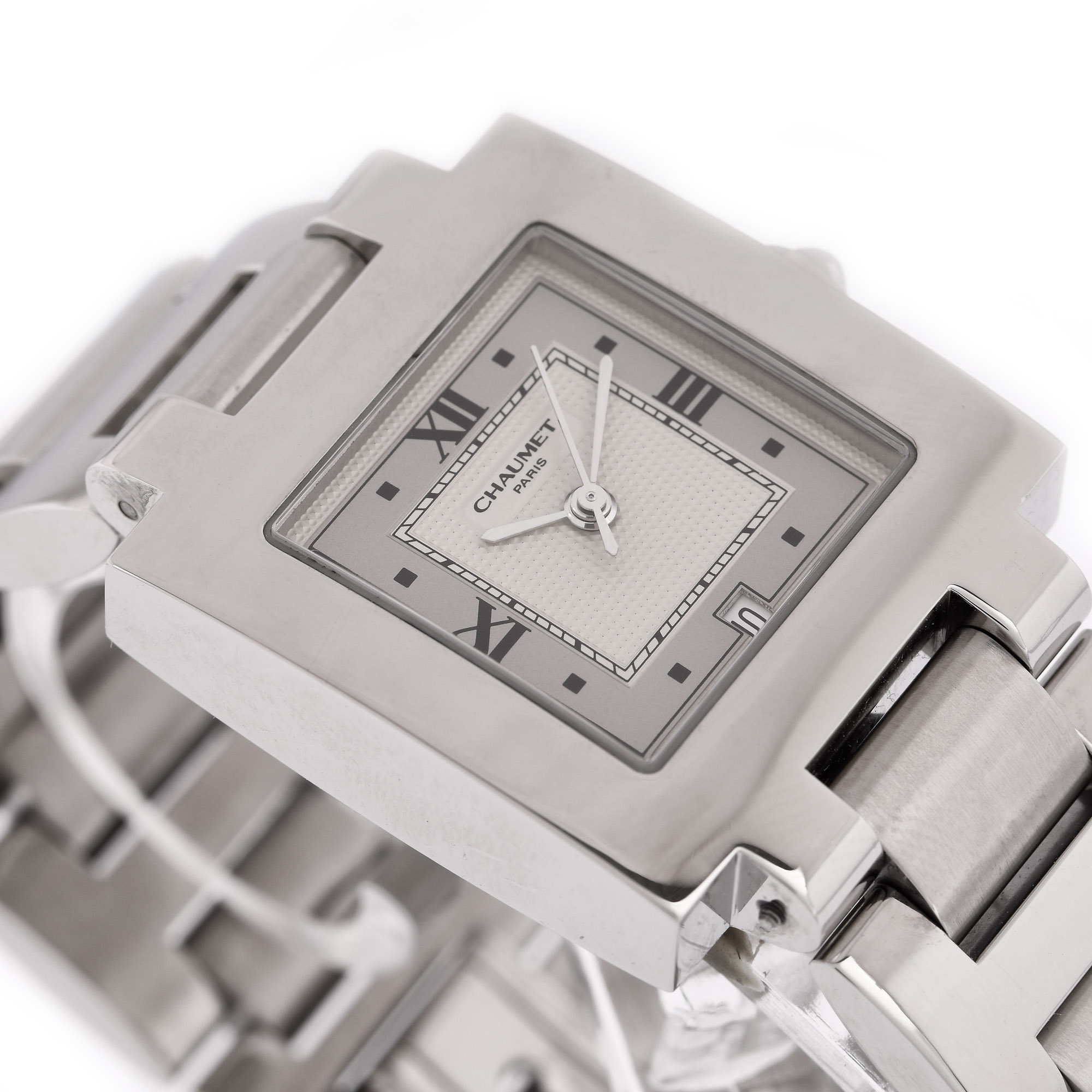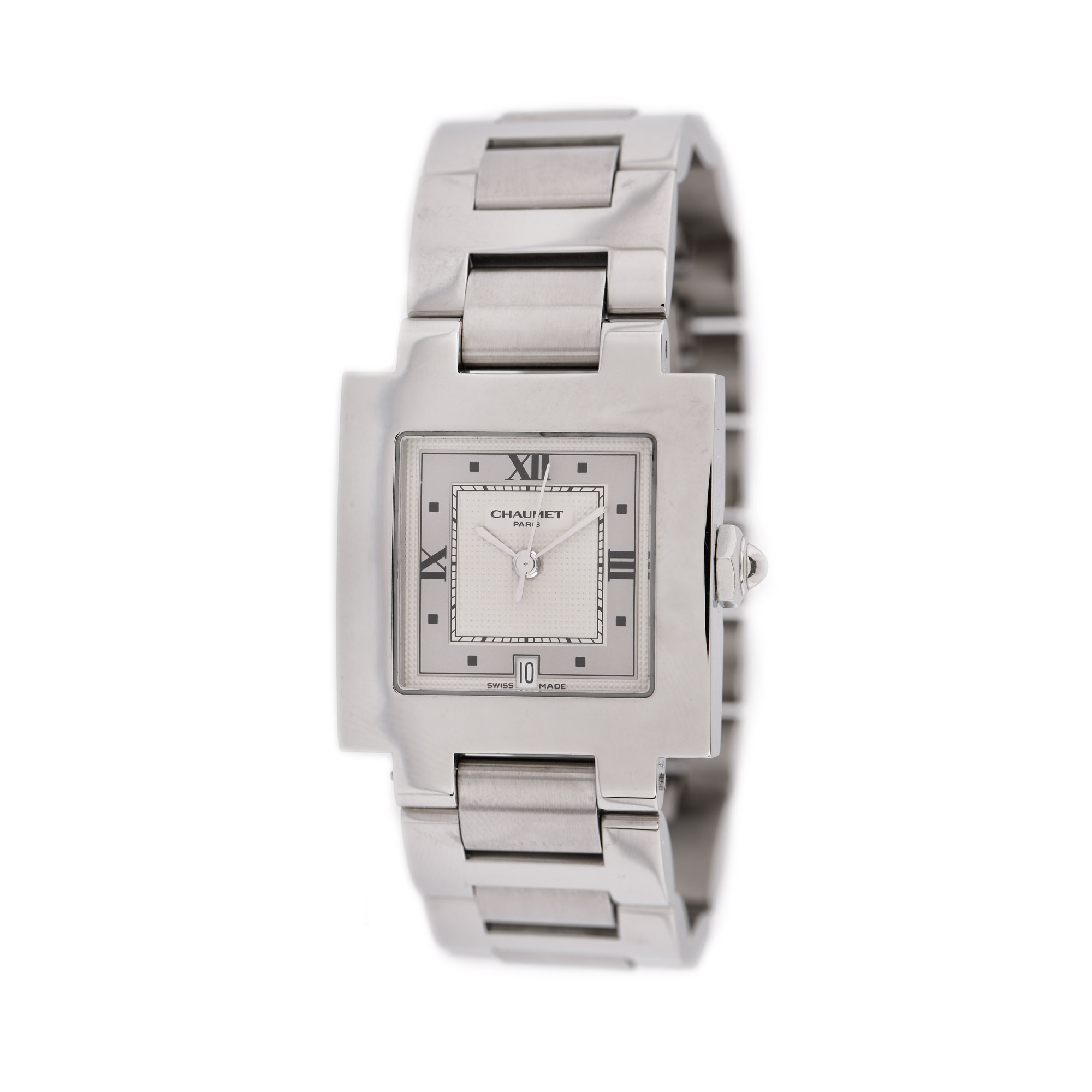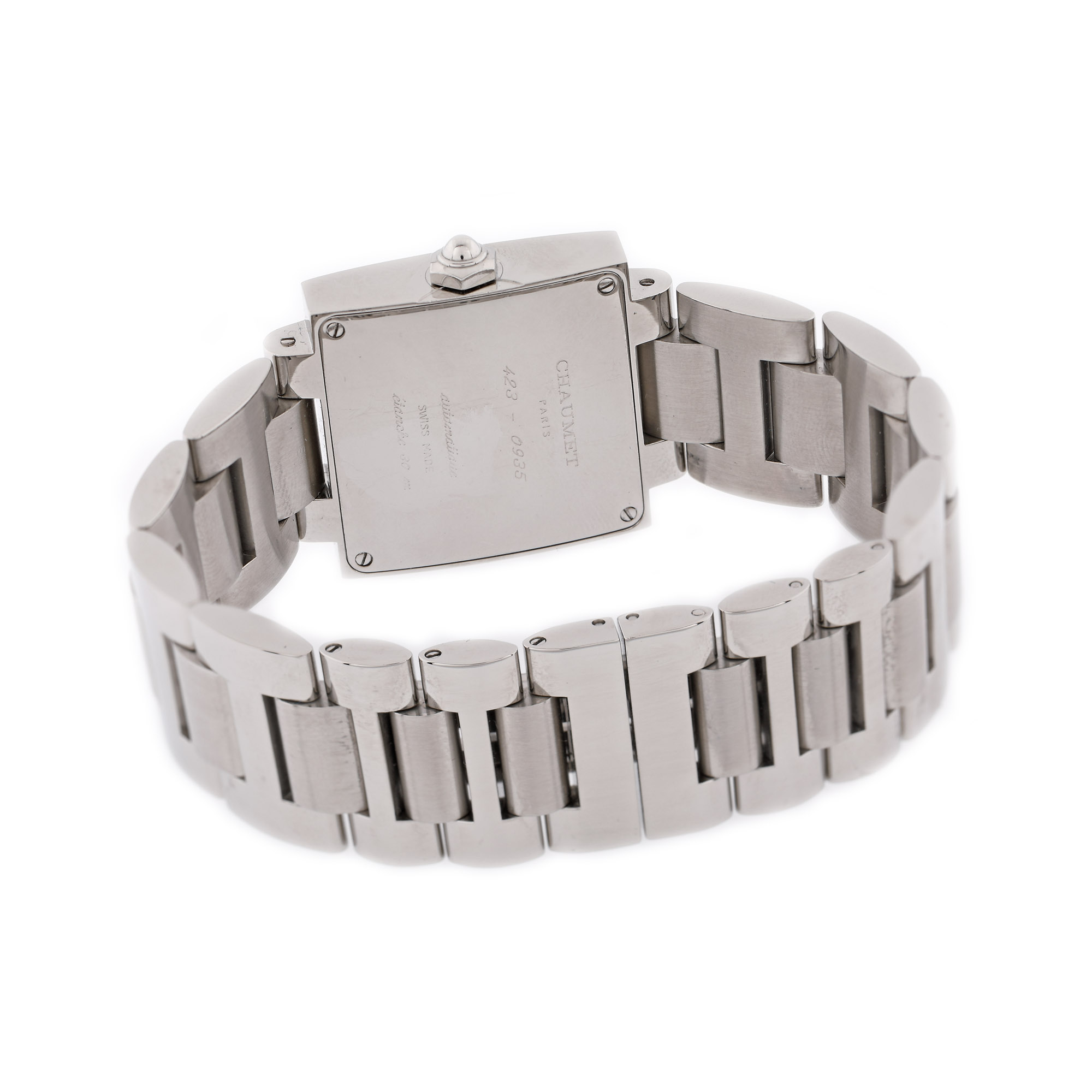 Ceas Chaumet Khesis, de mână, de damă, referință 423, mecanism automatic. Cadran de culoare alb, numerale romane și registru pentru dată în dreptul orei 6. Brățară din oțel inoxidabil și sistem de închidere tip deployant, originale.