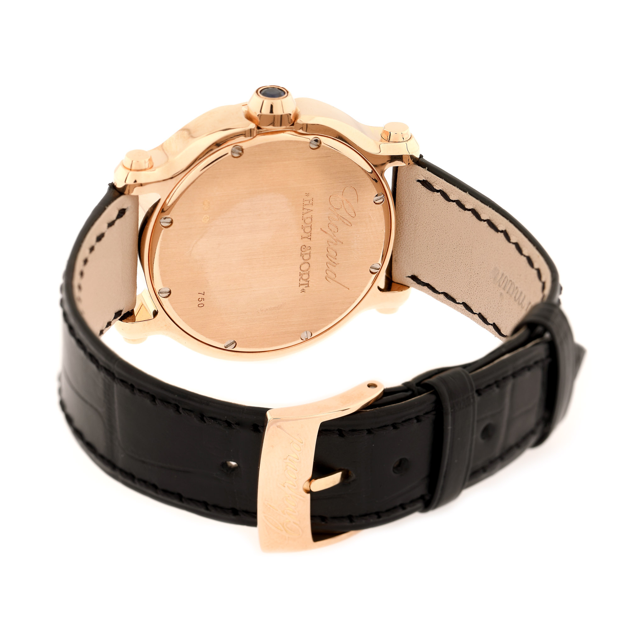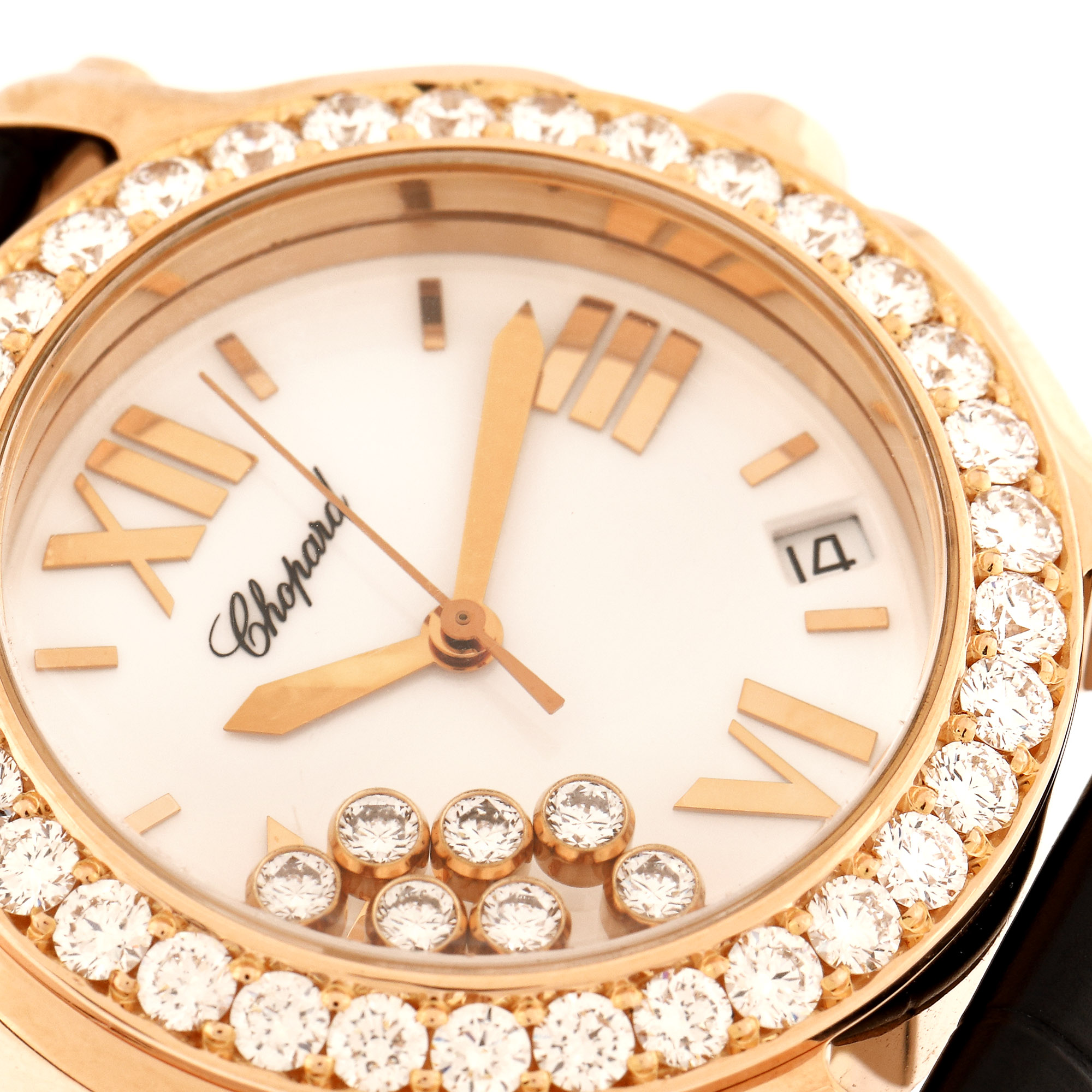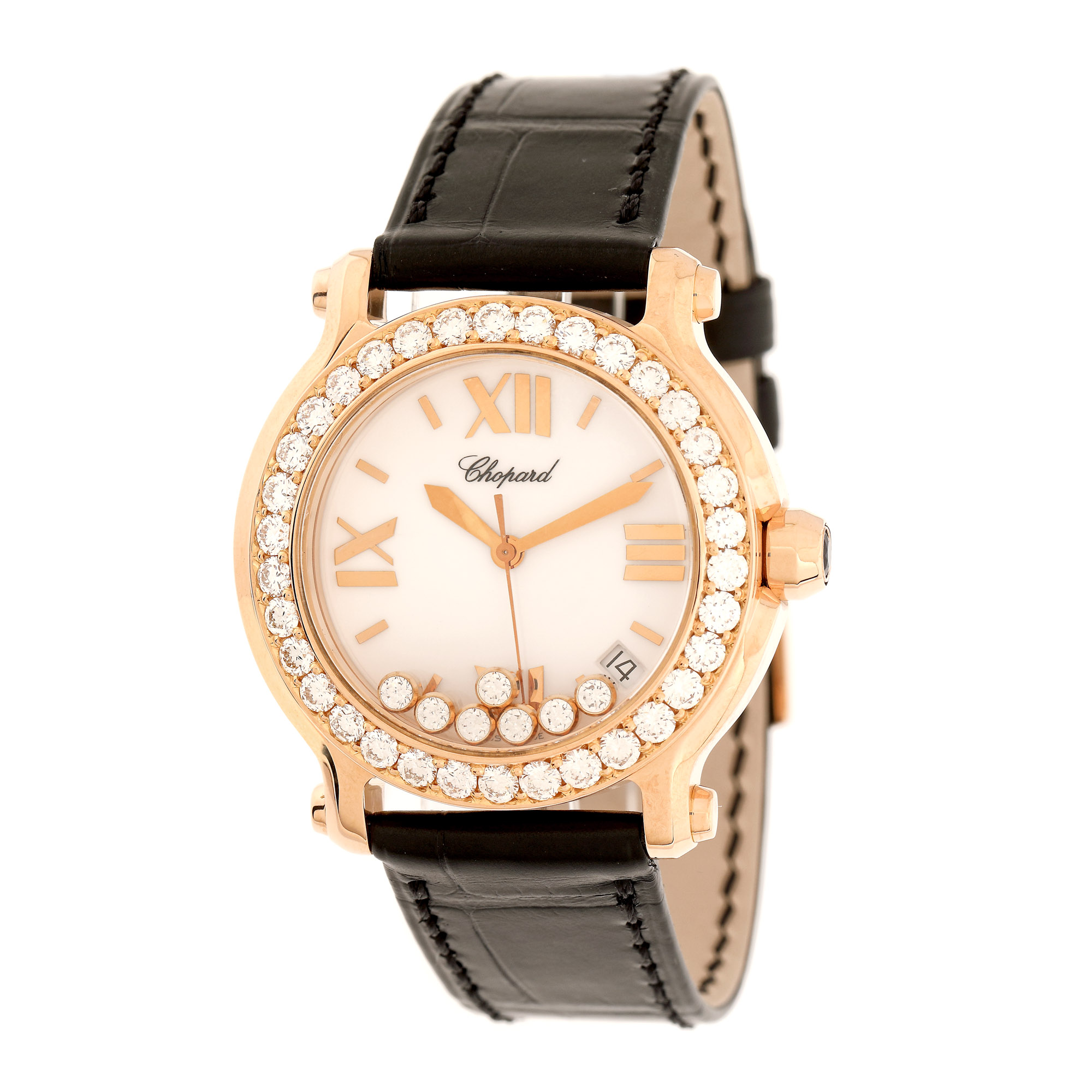 Ceas Chopard Happy Sport, de mână, de damă, referință 4183, mecanism quartz. Cadran de culoare alb, cu numerale romane și indici orari din aur roz și registru pentru dată între orele 4 și 5. Cadran decorat cu 7 diamante mobile. Bezel ornat cu diamante. Curea din piele, de culoare neagră, adăugată aftermarket și cataramă din aur, originală.