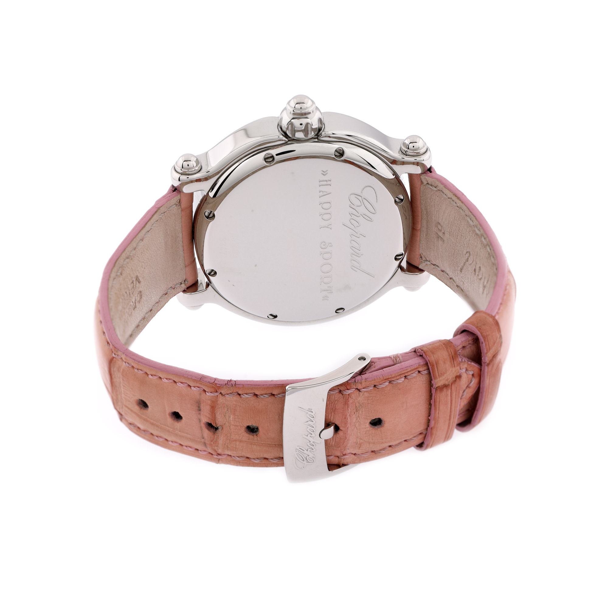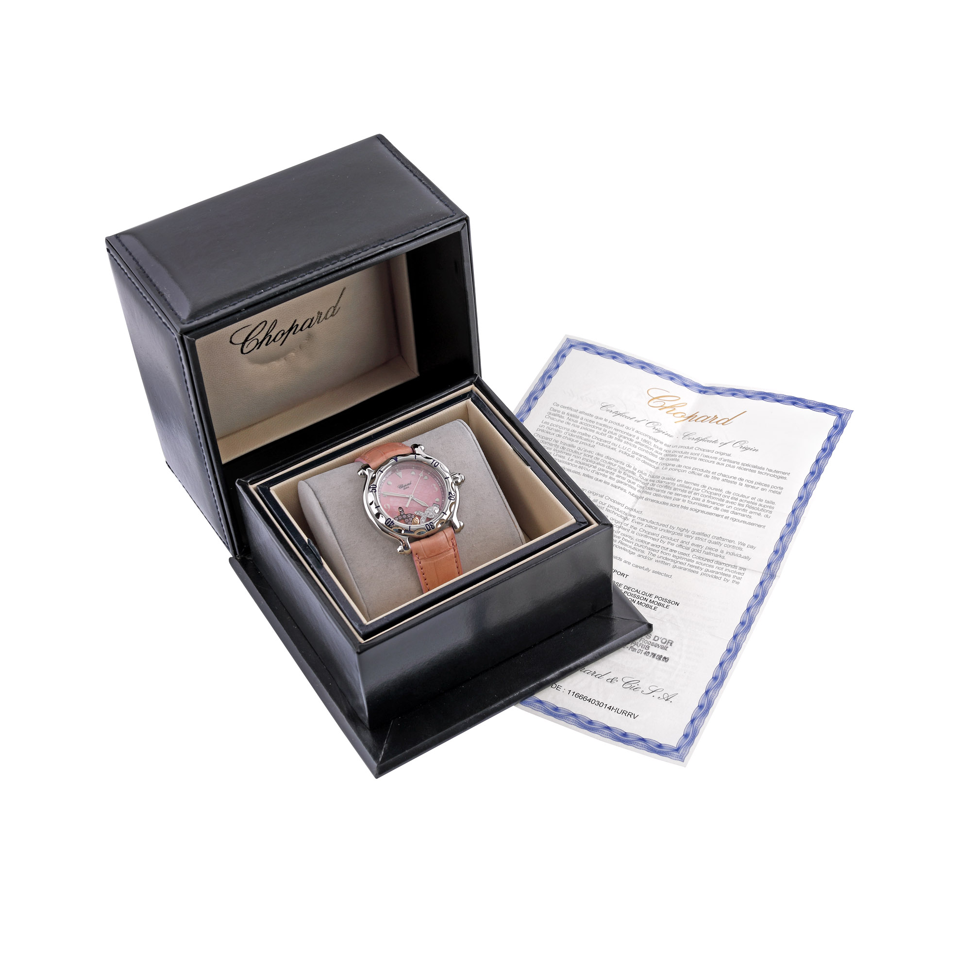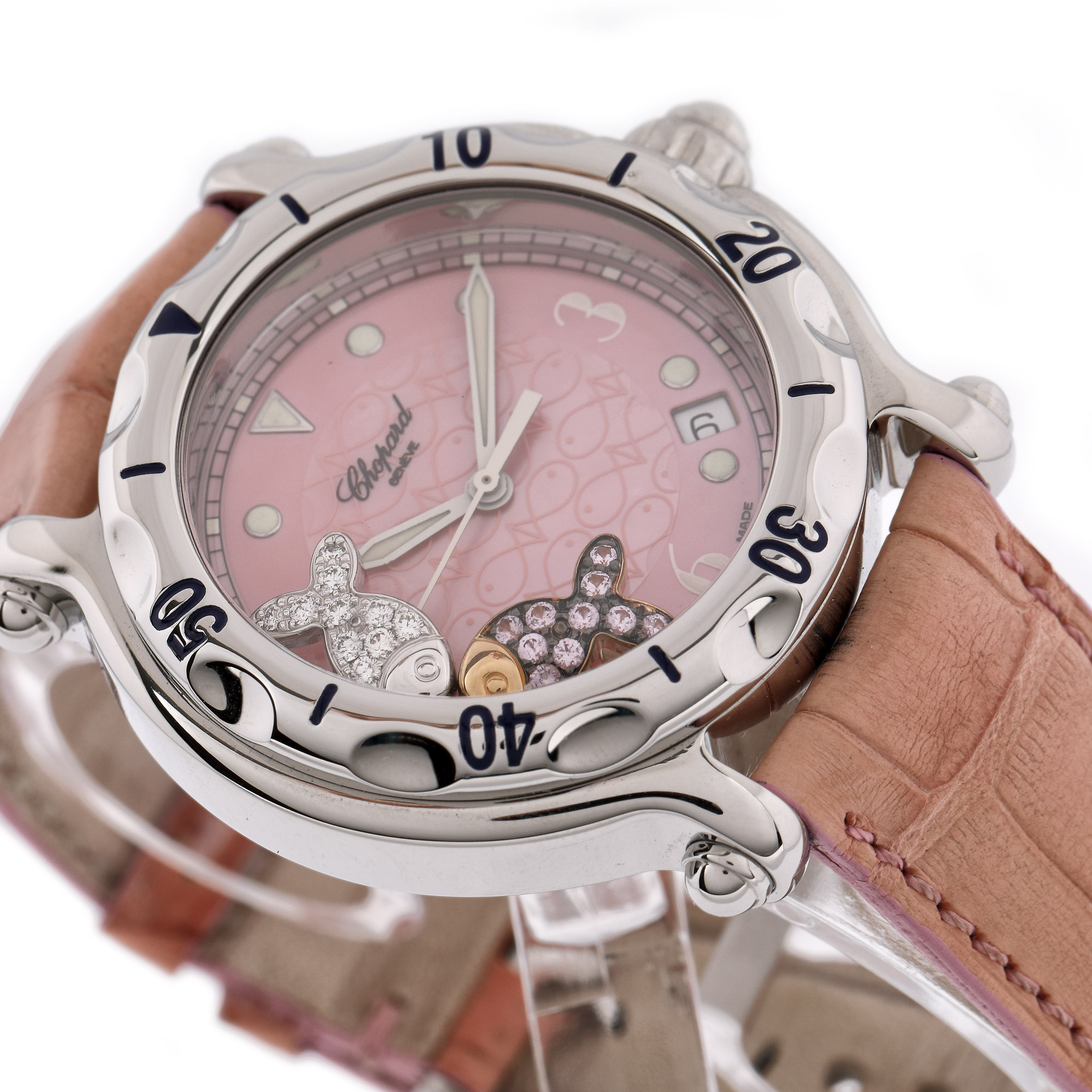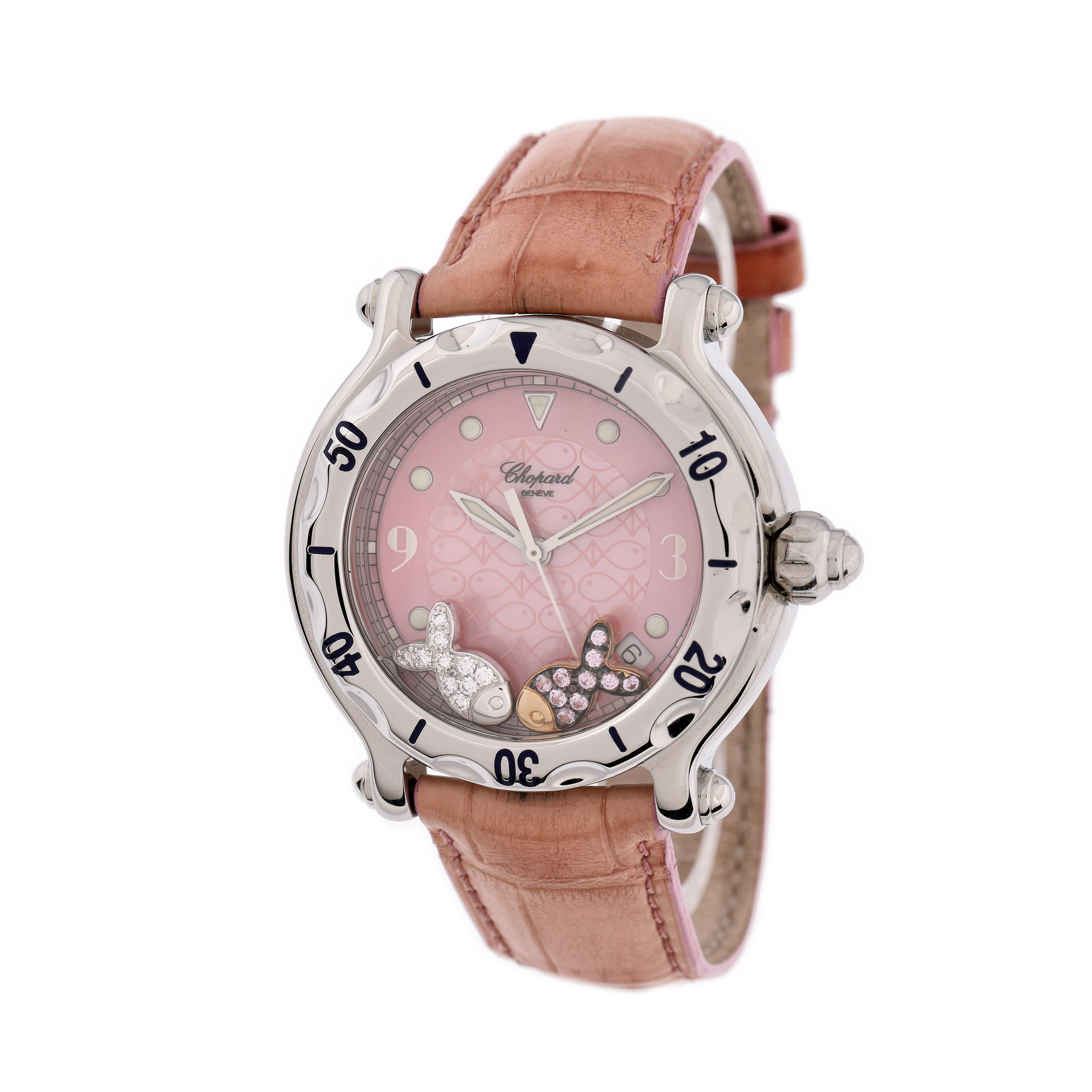 Ceas Chopard Happy Sport Fish, de mână, de damă, referință 8347, mecanism quartz. Cadran din sidef roz, cu indecși orari luminiscenți, decorat cu diamante mobile. Curea din piele de crocodil, de culoare roz și catramă din oțel inoxidabil, originale. Accesorii. cutia originală, certificat de origine cu ștampila retailer-ului Les Champs D'or, datat 04/2013, nesemnat