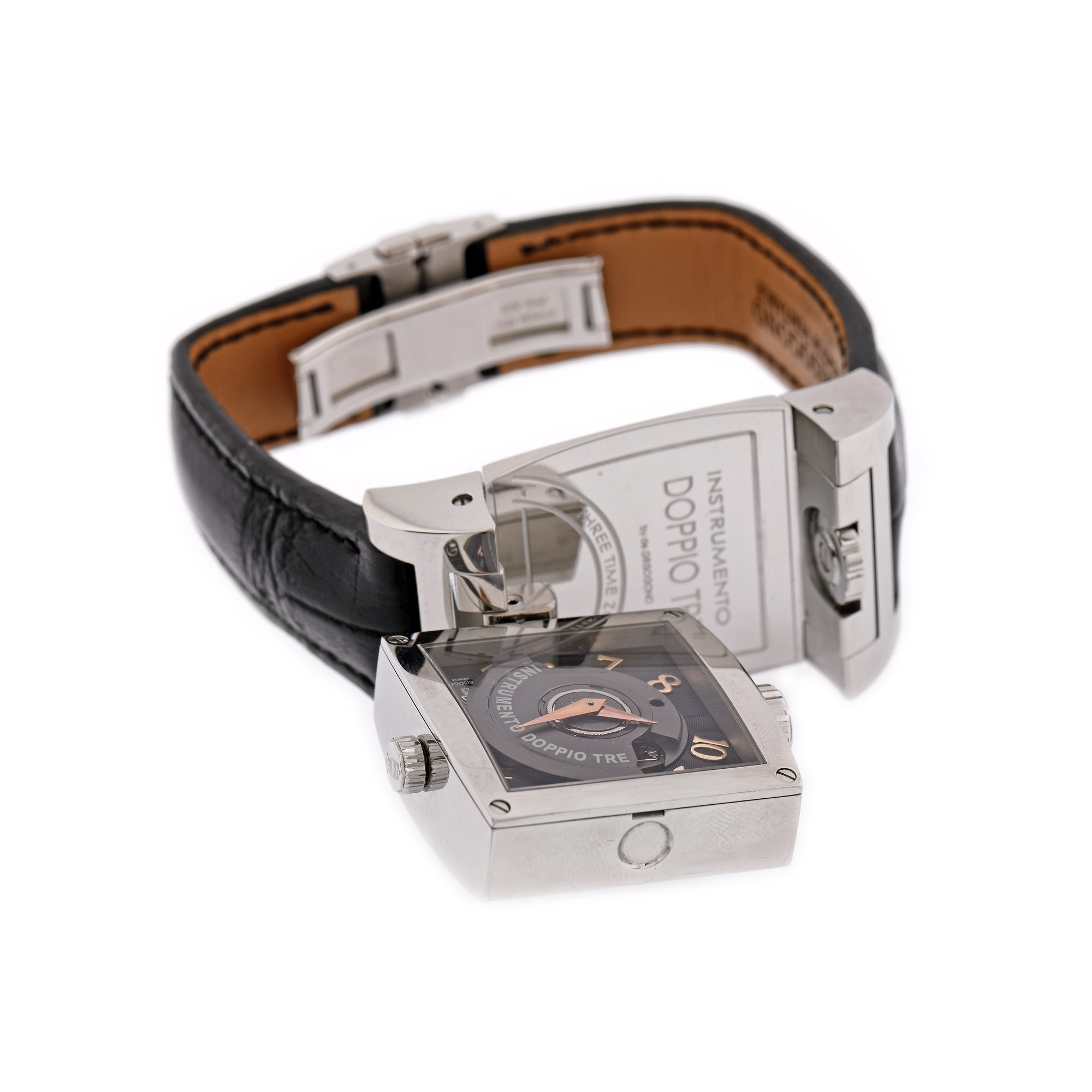 Ceas De Grisogono Instrumento Doppio Tre, de mână, bărbătesc, referință DOPPTRE N02, mecanism automatic. Cadran de culoare negru, decorat în tehnica guilloché, cu numerale arabe, registru pentru secunde și registru pentru dată. Curea din piele de aligator, de culoare neagră și închizătoare originală.