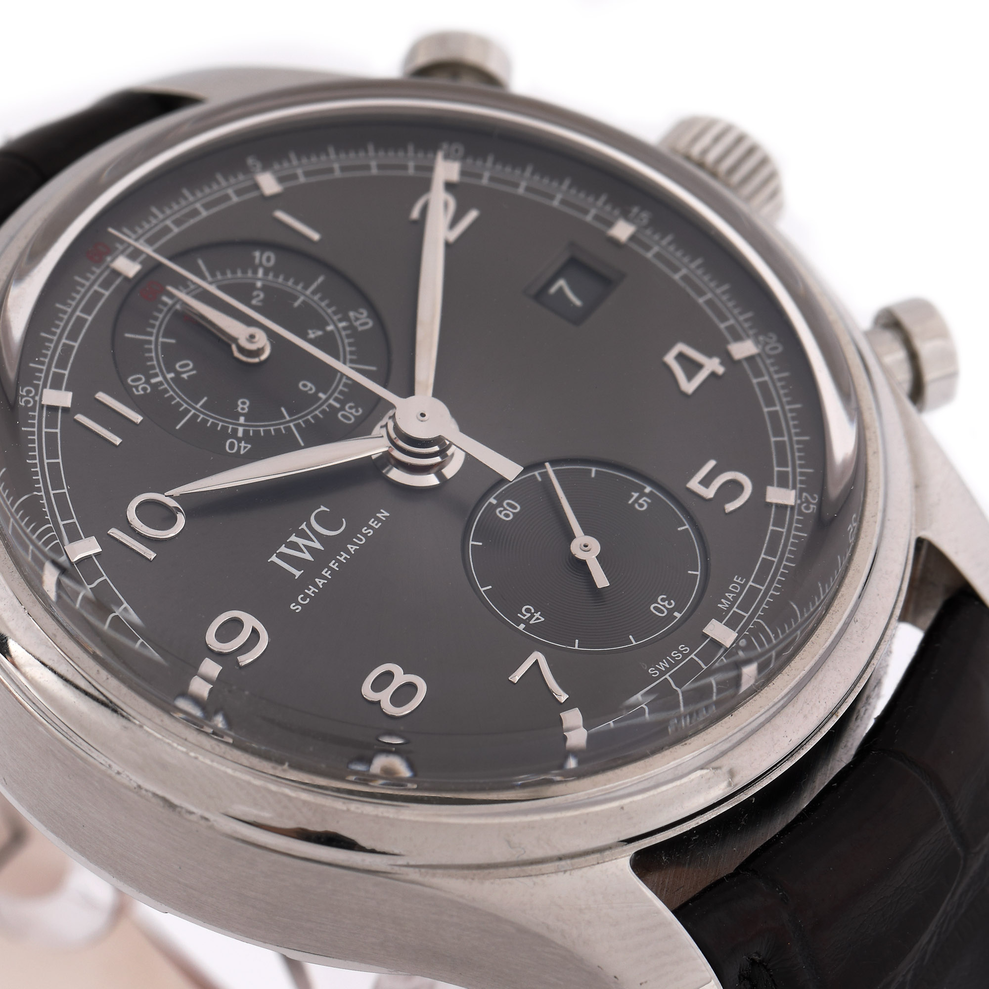 Ceas IWC Portugieser Chronograph Classic, de mână, bărbătesc, referință IW390404, mecanism automatic, anterior vitrat, calibru 89361. Cadran de culoare gri, numerale arabe, două registre și dată în dreptul orei 3. Curea din piele, de culoare maro și sistem de închidere tip deployant, originale.