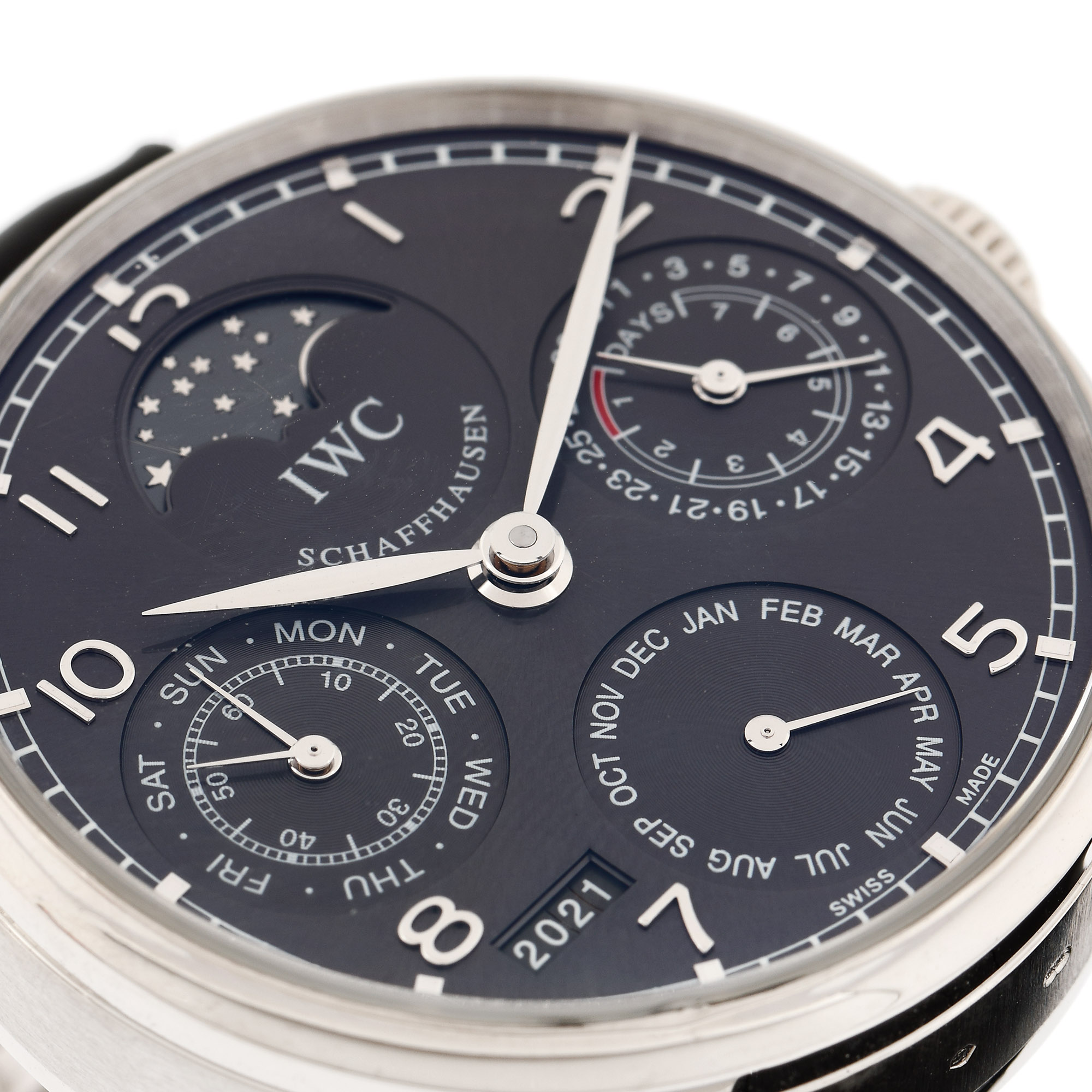 Ceas IWC Portugieser Perpetual Calendar, din aur alb, de mânâ, bărbătesc, referință IW503301, mecanism automatic, anterior vitrat. Cadran de culoare crem, numerale arabe, patru registre și registru pentru an între orele 7 și 8. Accesorii: manual de utilizare; cutie originală
