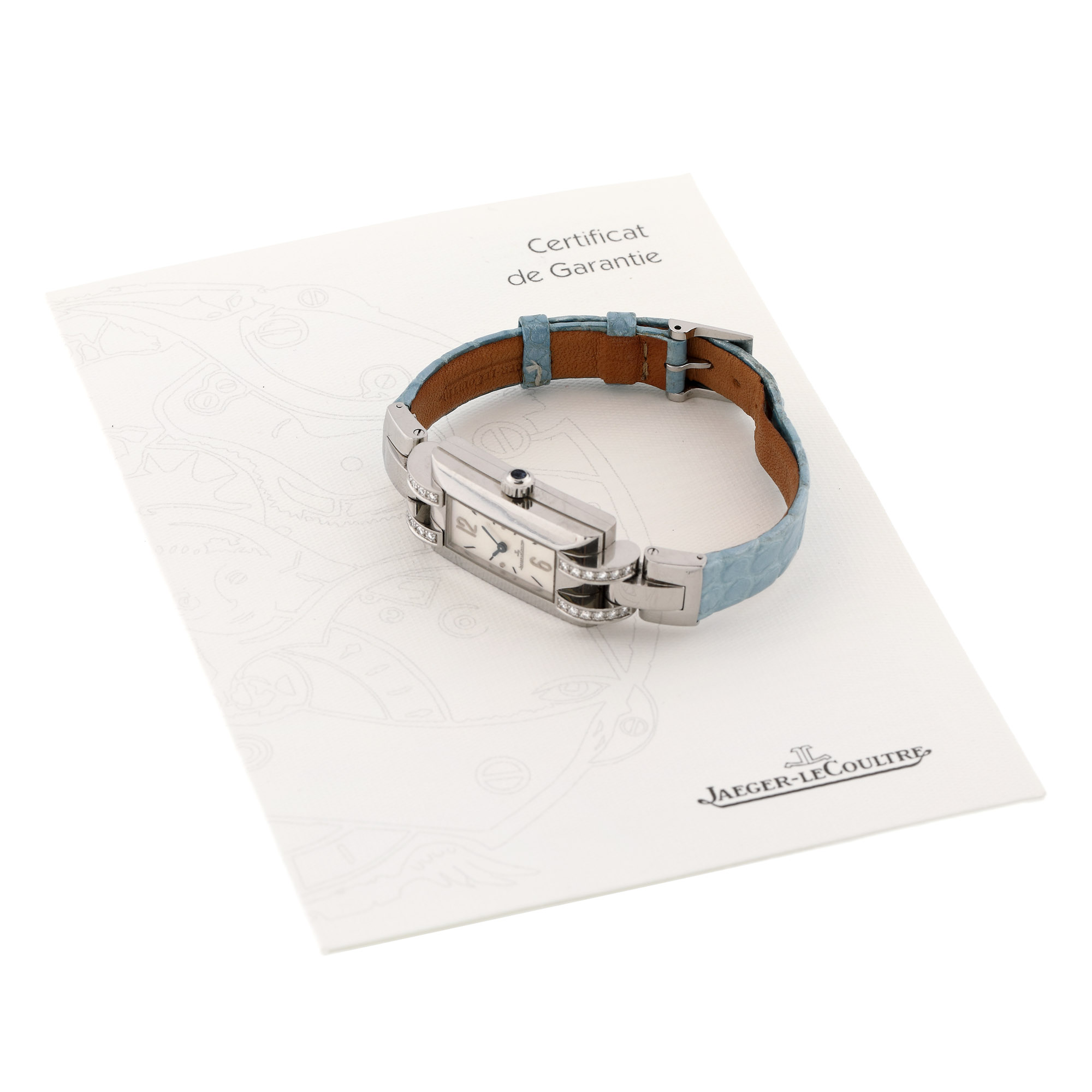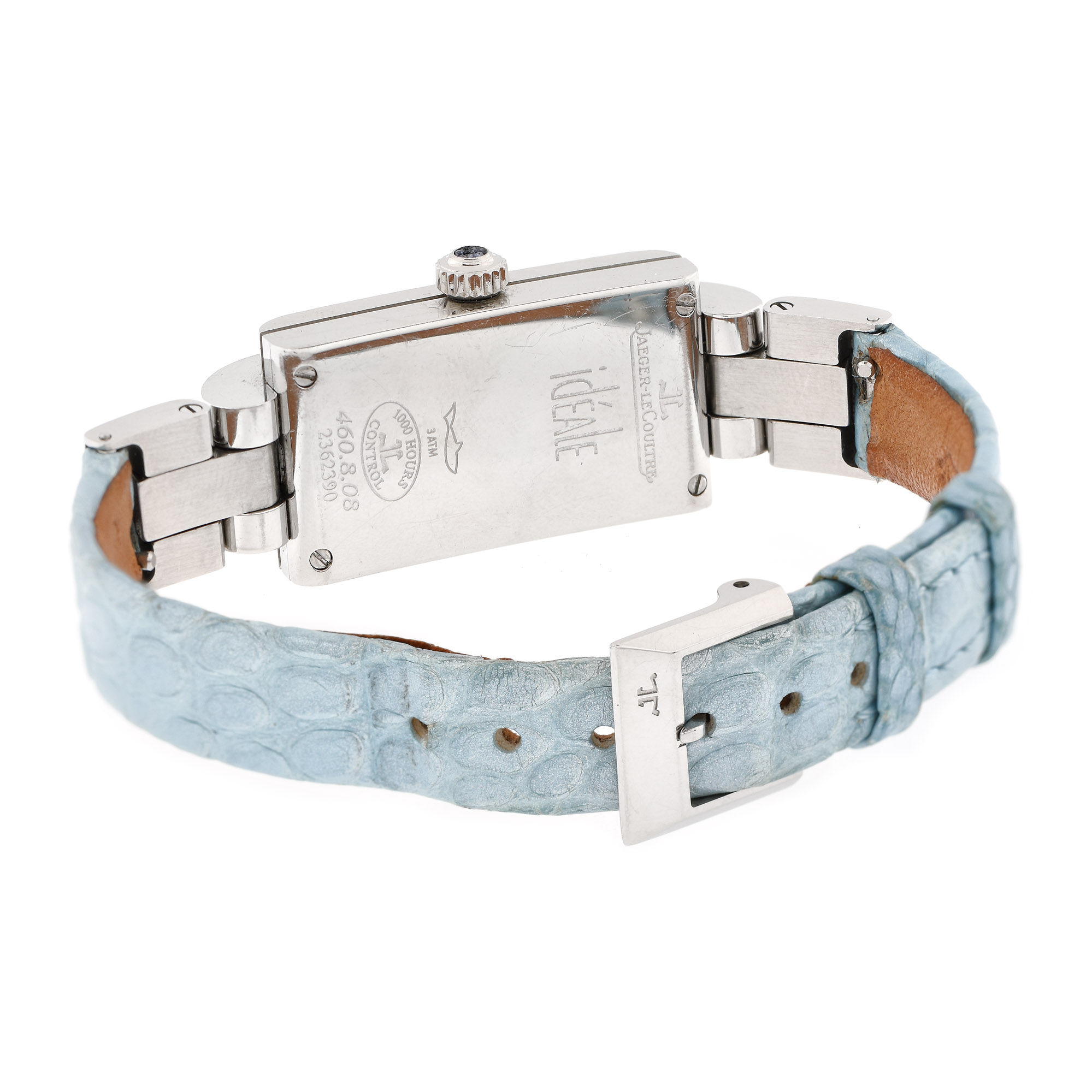 Ceas Jaeger-LeCoultre Idéale, de mână, de damă. Mecanism quartz referință 460.8.08. Cadran din sidef, numerale arabe și anse decorate cu diamante. Curea din piele de culoare bleu și cataramă din oțel, originale. Accesorii: certificatul de garanție, nesemnat, nedatat, neștampilat
