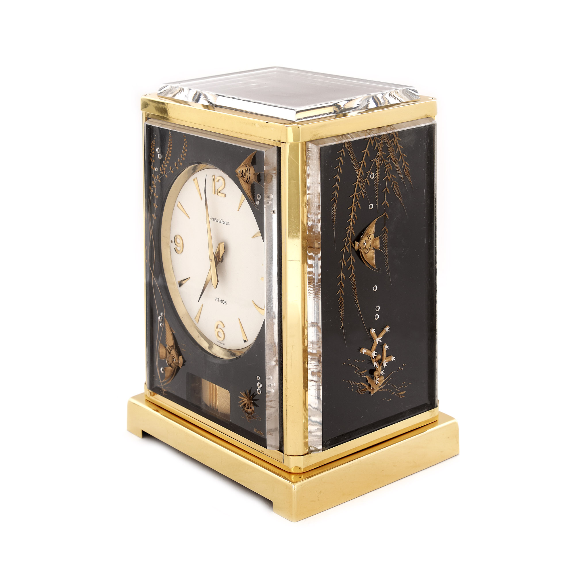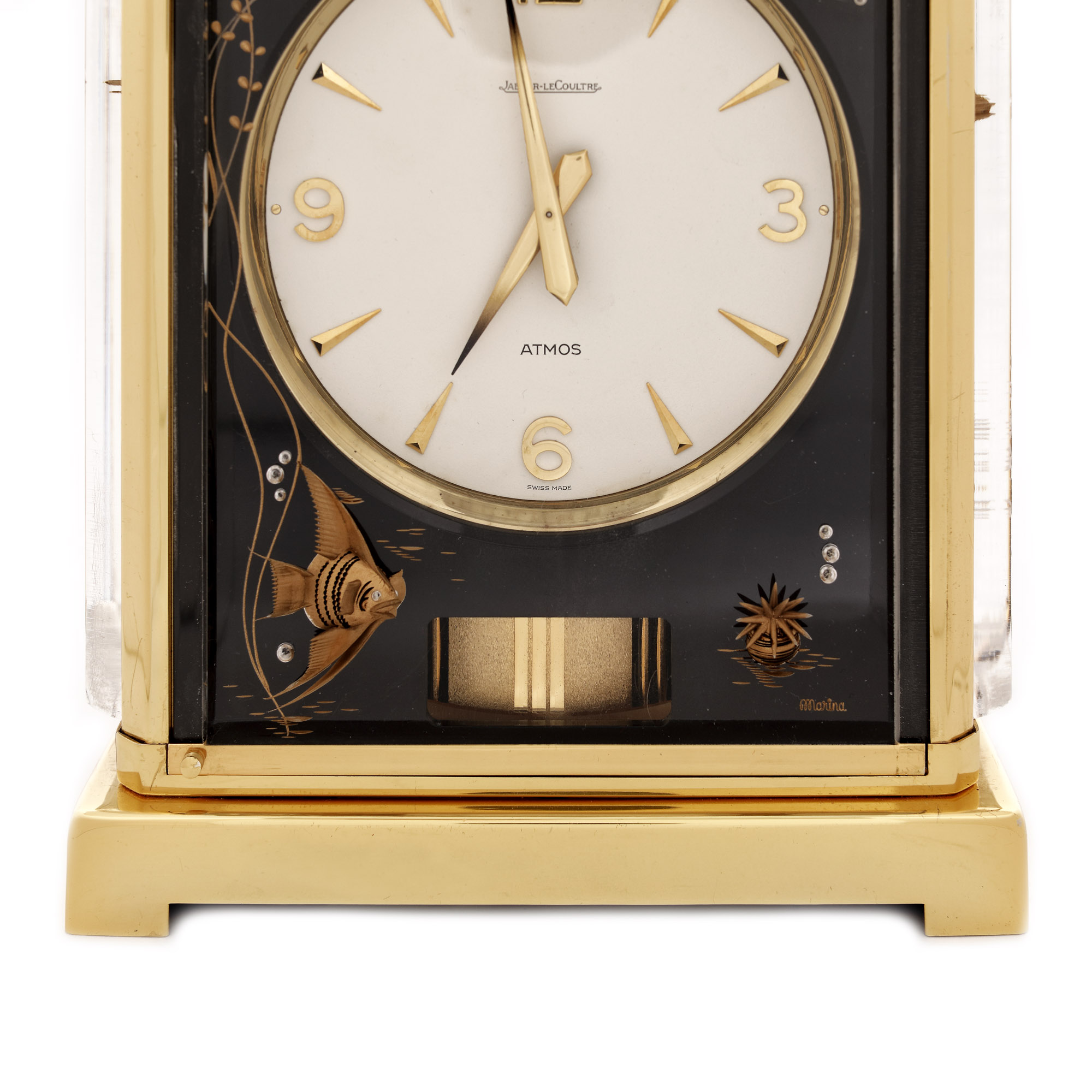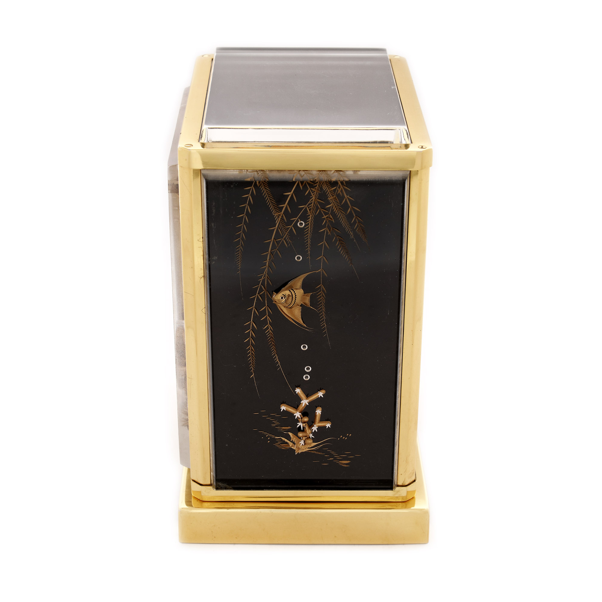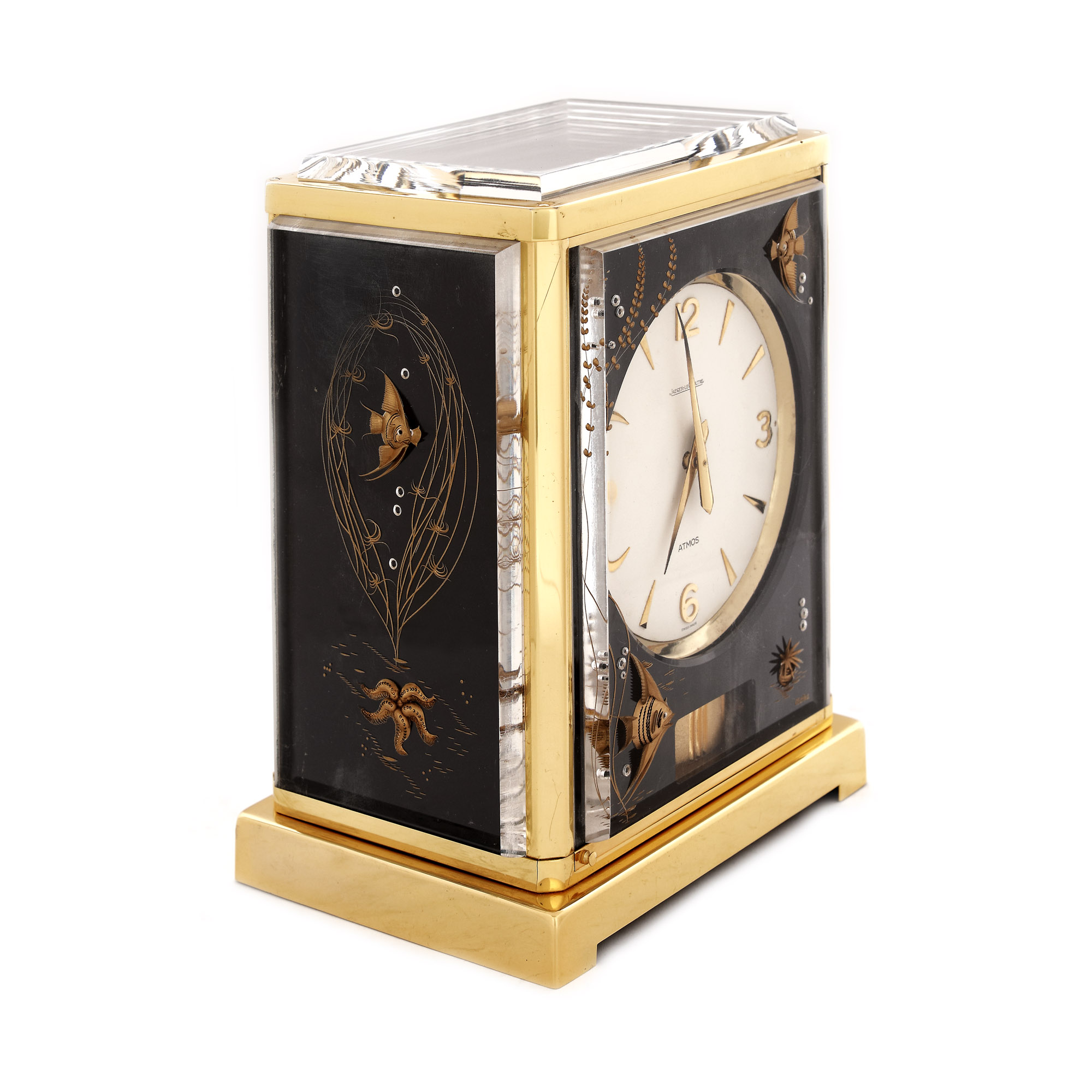 Ceas Jaeger LeCoultre Marina, din metal aurit, pentru birou, însoțit de cutia originală, mecanism automatic. Cadran de culoare alb și numerale arabe. Panouri decorate cu elemente marine.