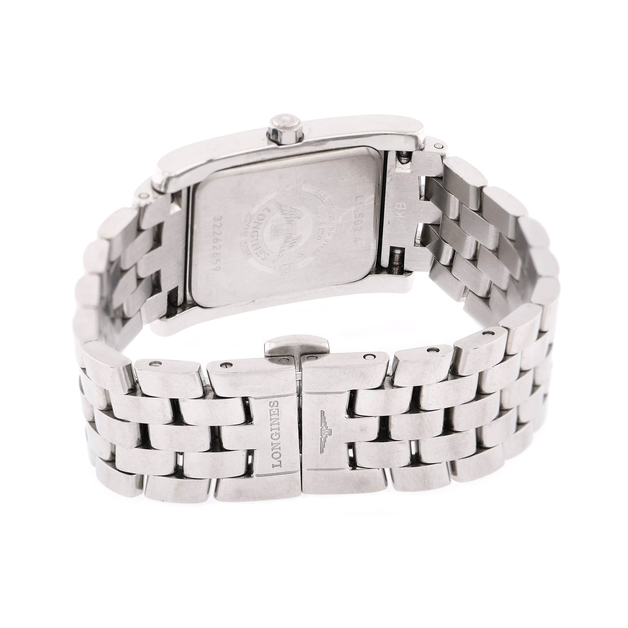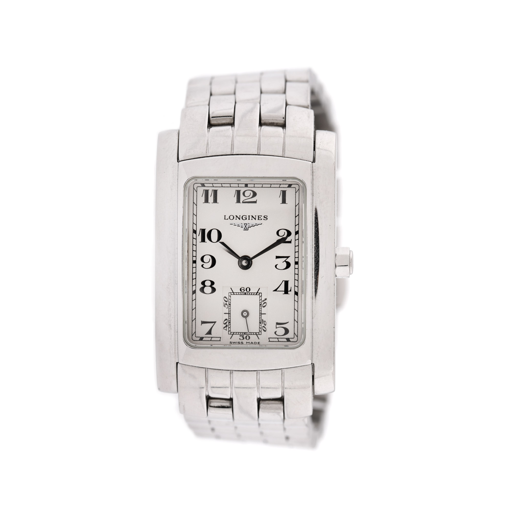 Ceas Longines Dolce Vita, de mână, de damă, referință L5.502.4, mecanism quartz. Cadran de culoare crem, numerale arabe și registru pentru cronometru în dreptul orei 6. Brățară și sistem de închidere, originale.