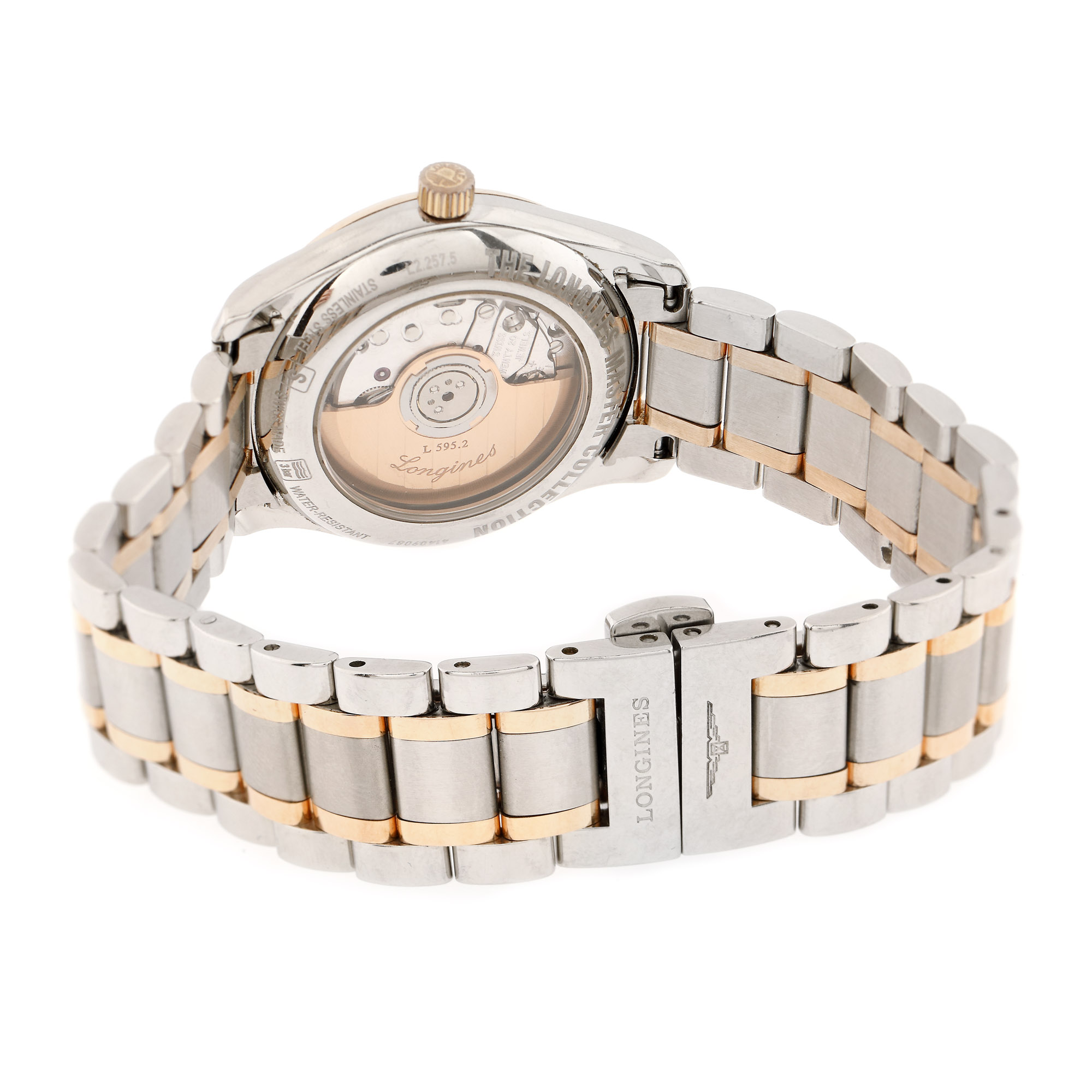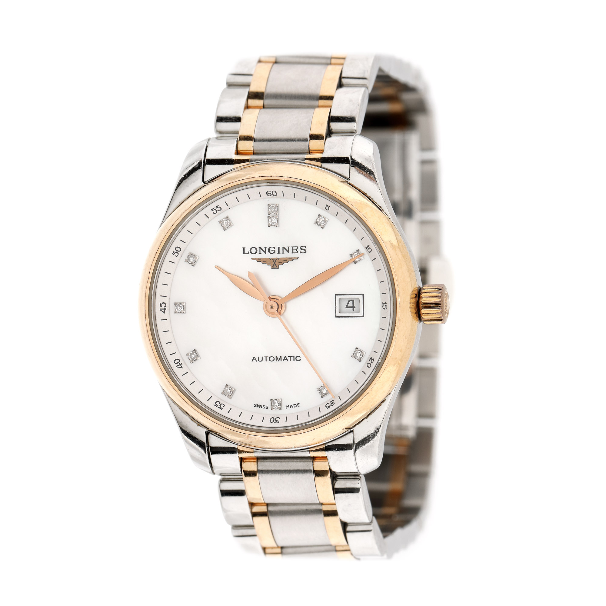 Ceas Longines Master Collection, de mână, de damă, referință L2.257.5.89.7, mecanism automatic, calibru L592.2, anterior vitrat. Cadran din sidef, cu indici 12 diamante, culoare W-H, claritate VS, cca. 0,034 ct., secundar cu numerale arabe și registru pentru dată în locul orei 3. Brățară cu sistem de închidere deployant, originale. Accesorii: manual de utilizare, card internațional de garanție datat (23.07.14) și ștampilat, certificat pentru diamante.