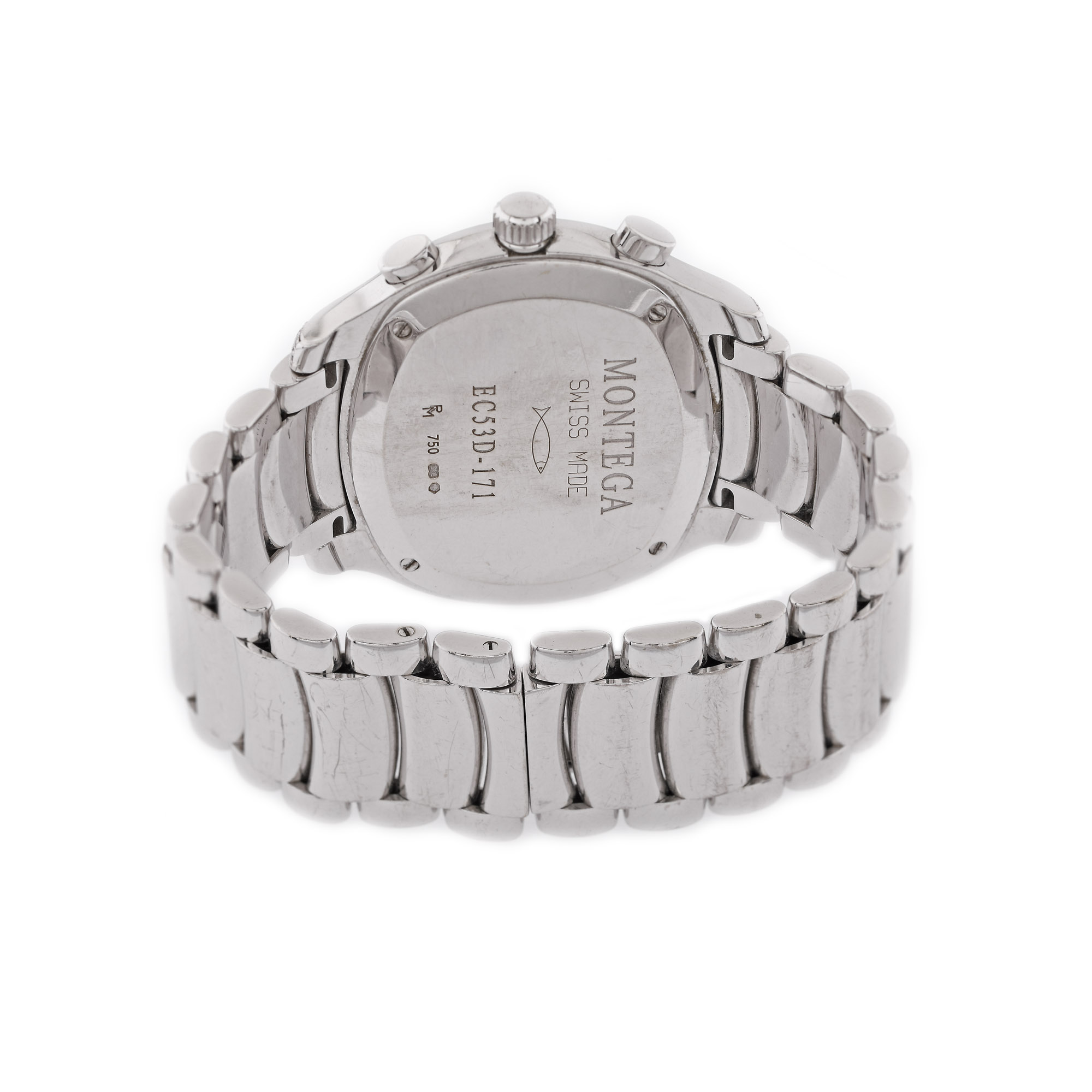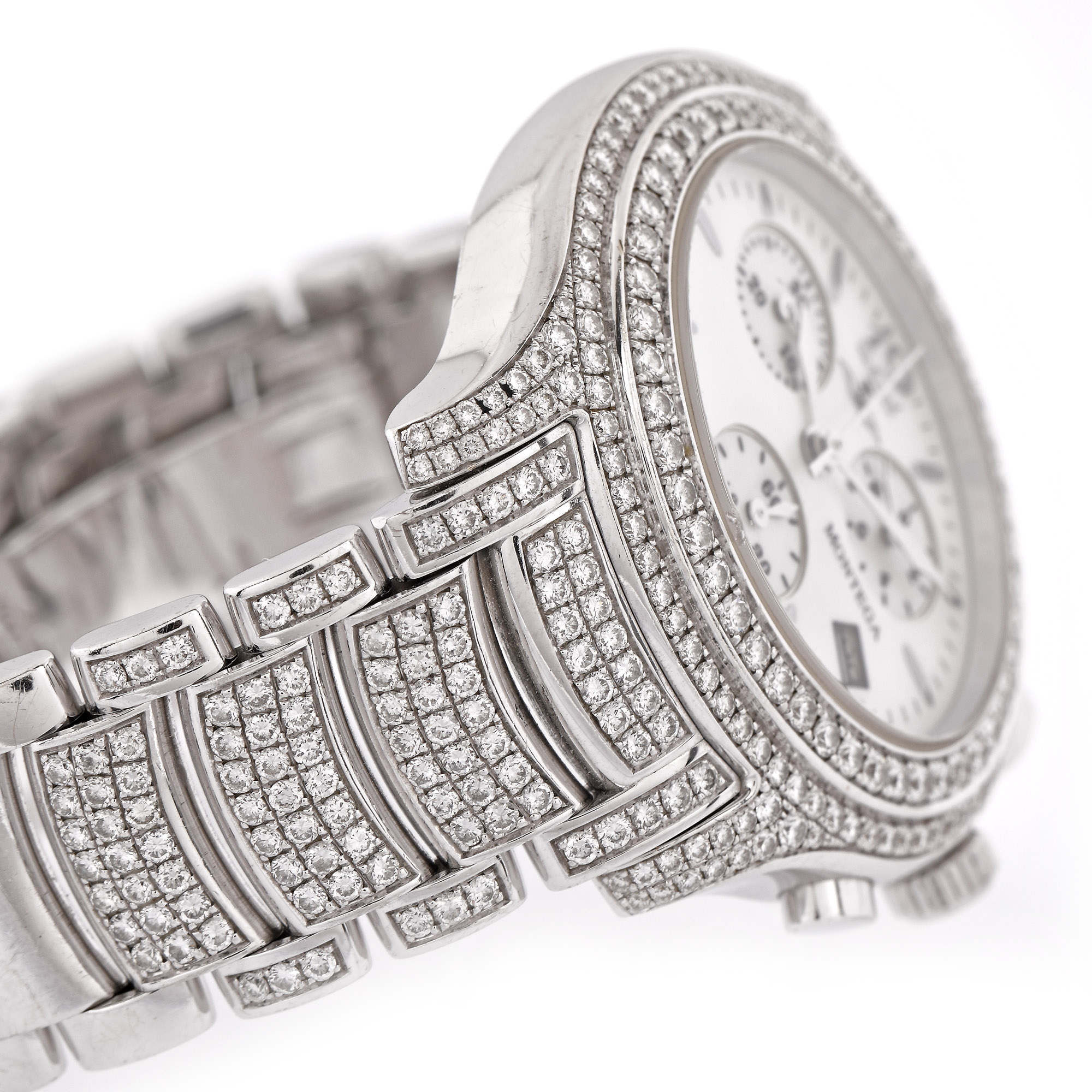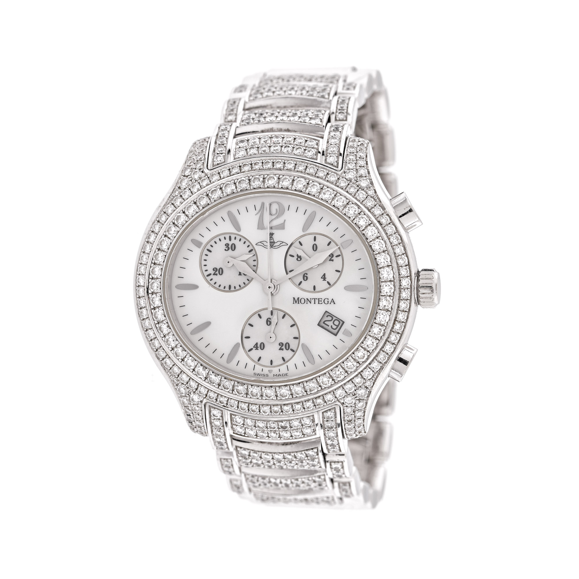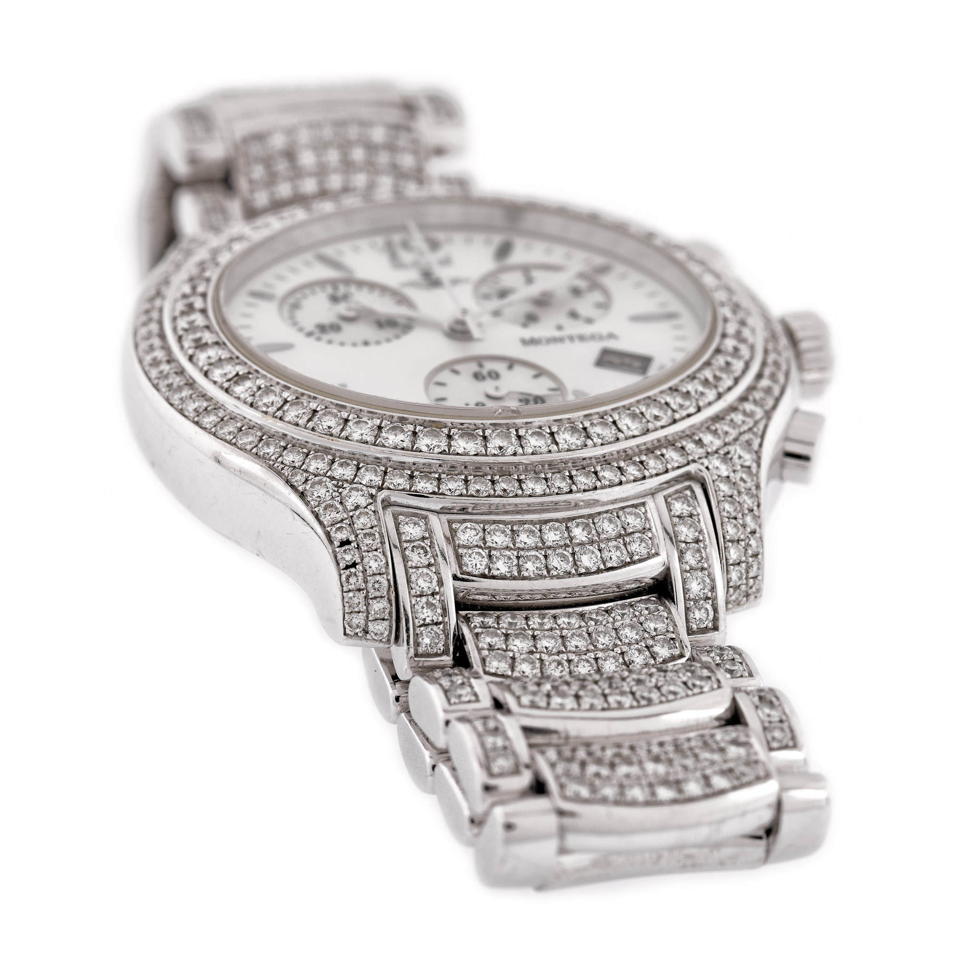 Ceas Montega din aur alb, de mână, decorat cu diamante, referință EC53D, mecanism quartz. Cadran din sidef, numerale arabe, trei registre pentru cronograf și registru pentru dată în dreptul orei 4. Brățară din aur alb, pavată cu diamante și sistem de închidere tip deployant, originale.
