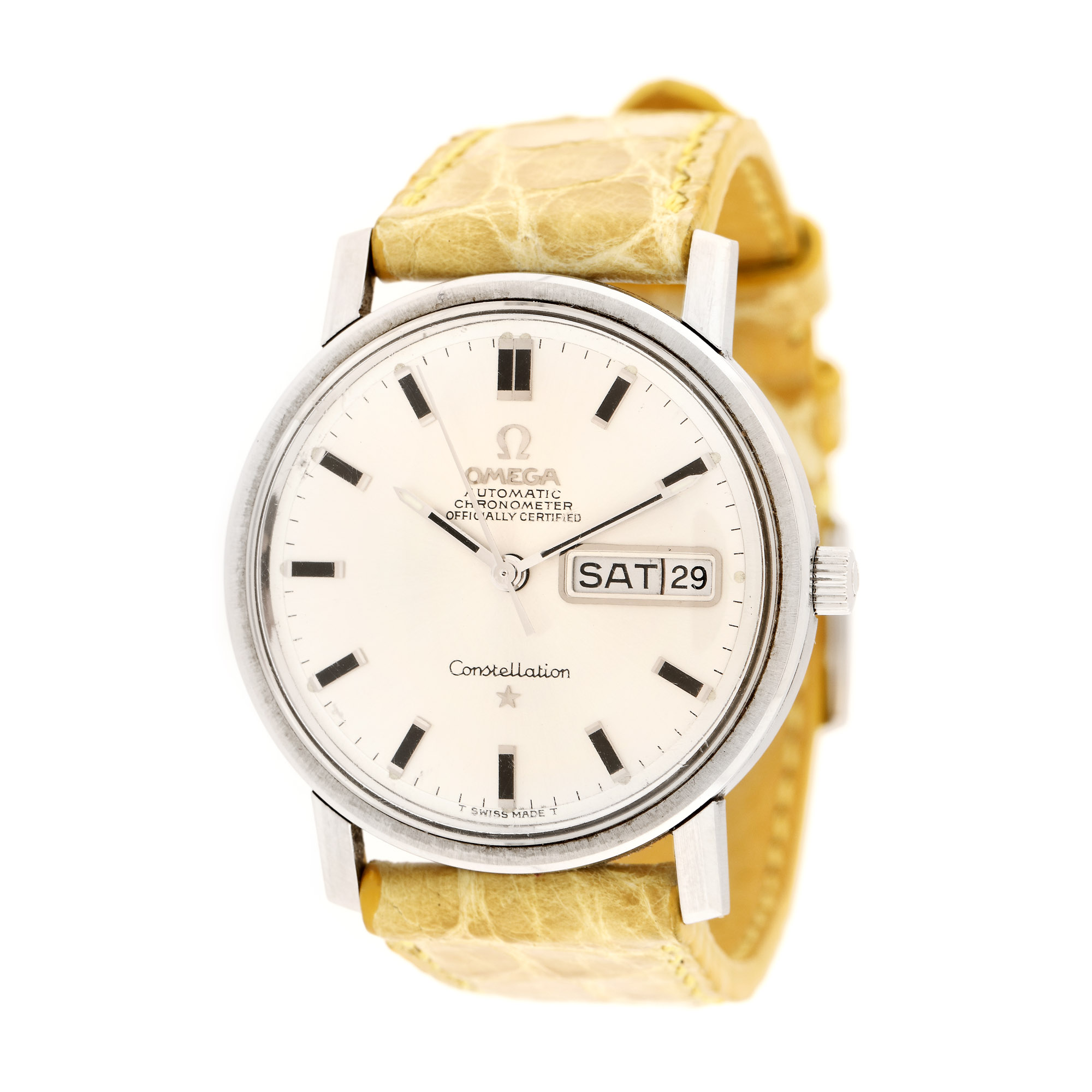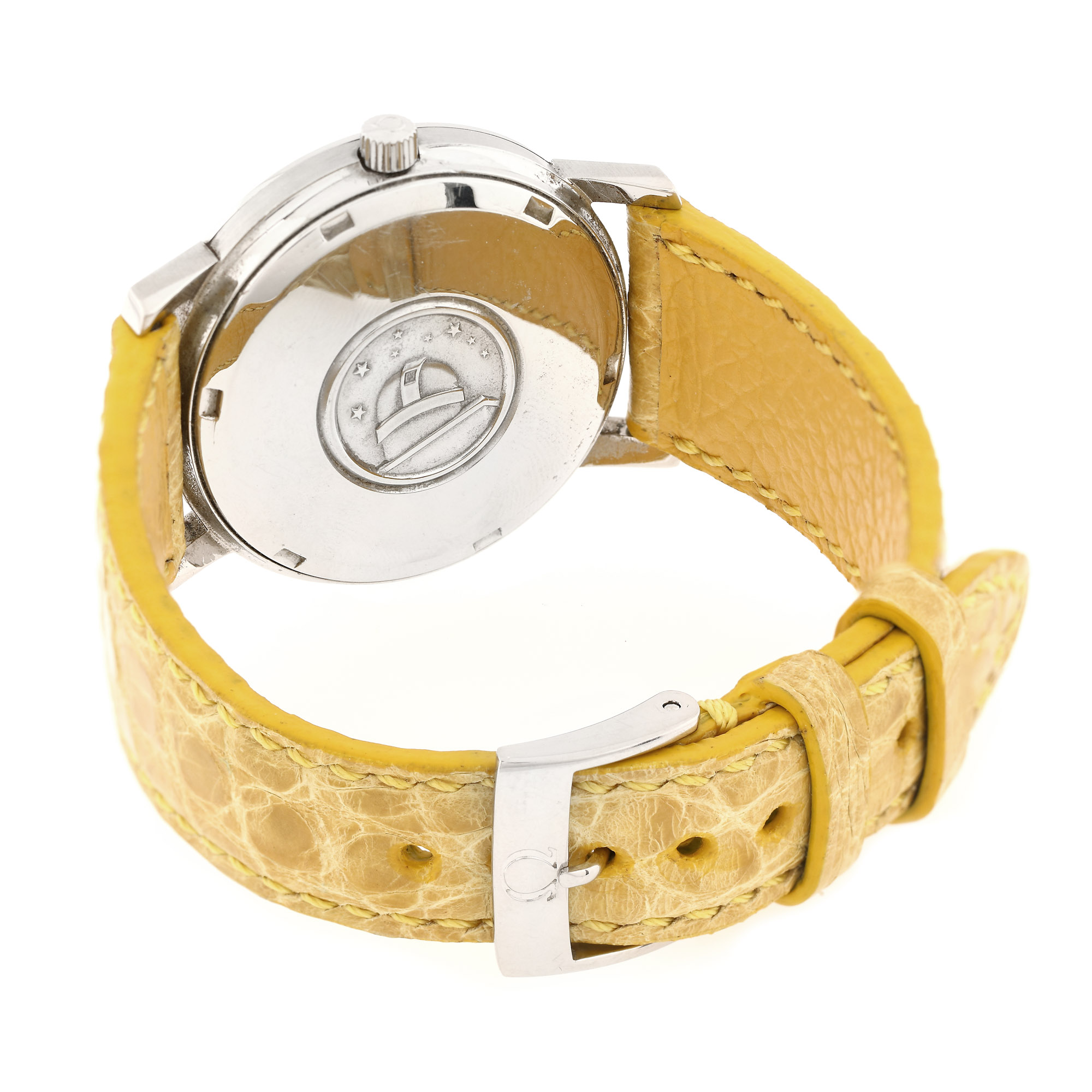Ceas Omega Constellation, de mână, unisex, referință 168.016, mecanism automatic, calibru 751. Cadran de culoare argintiu, cu indicatori orari din oțel și registru pentru ziua săptămânii și dată în dreptul orei 3. Curea din piele de aligator, de culoare galben, adăugată aftermarket și cataramă originală.