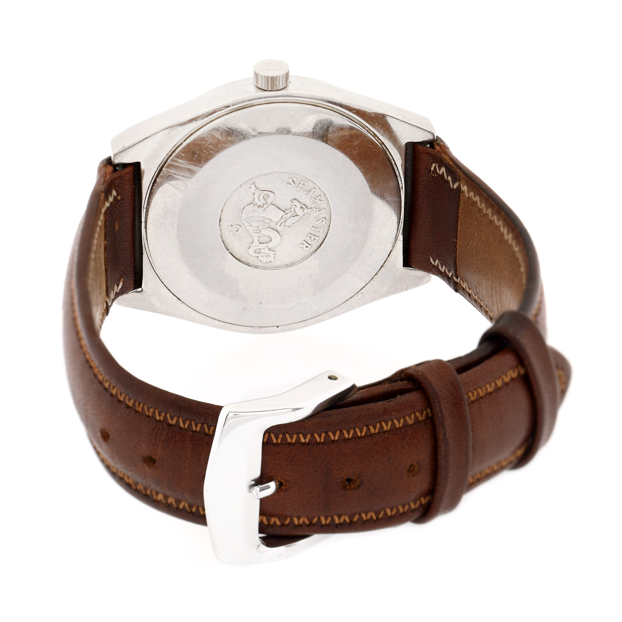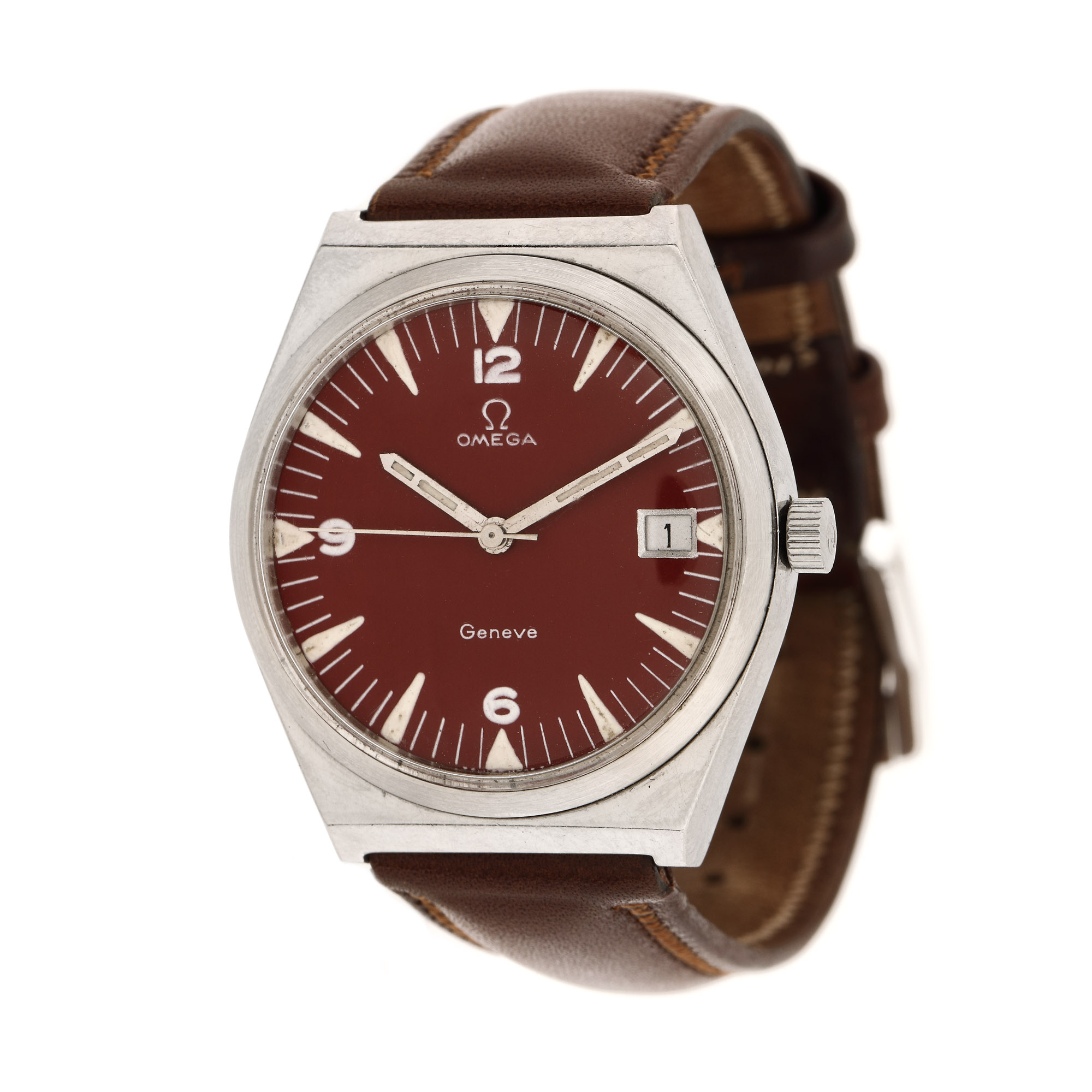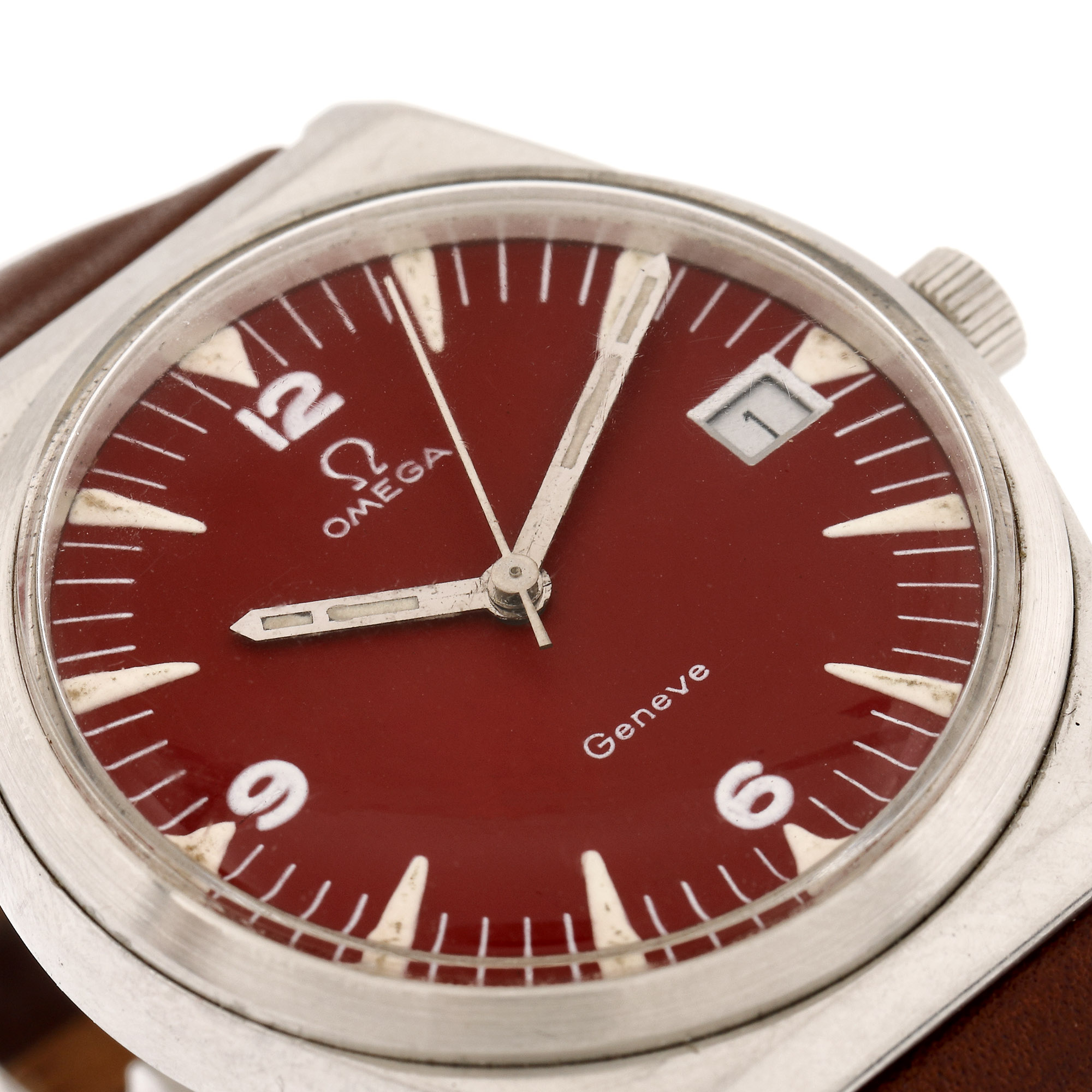 Ceas Omega Genève Red Dial, de mână, unisex, mecanism automatic, calibru 1030. Cadran de culoare roșu, cu numerale arabe și indici orari luminescenți și registru pentru dată în dreptul orei 3. Curea din piele, de culoare maro și cataramă, adăugate aftermarket.