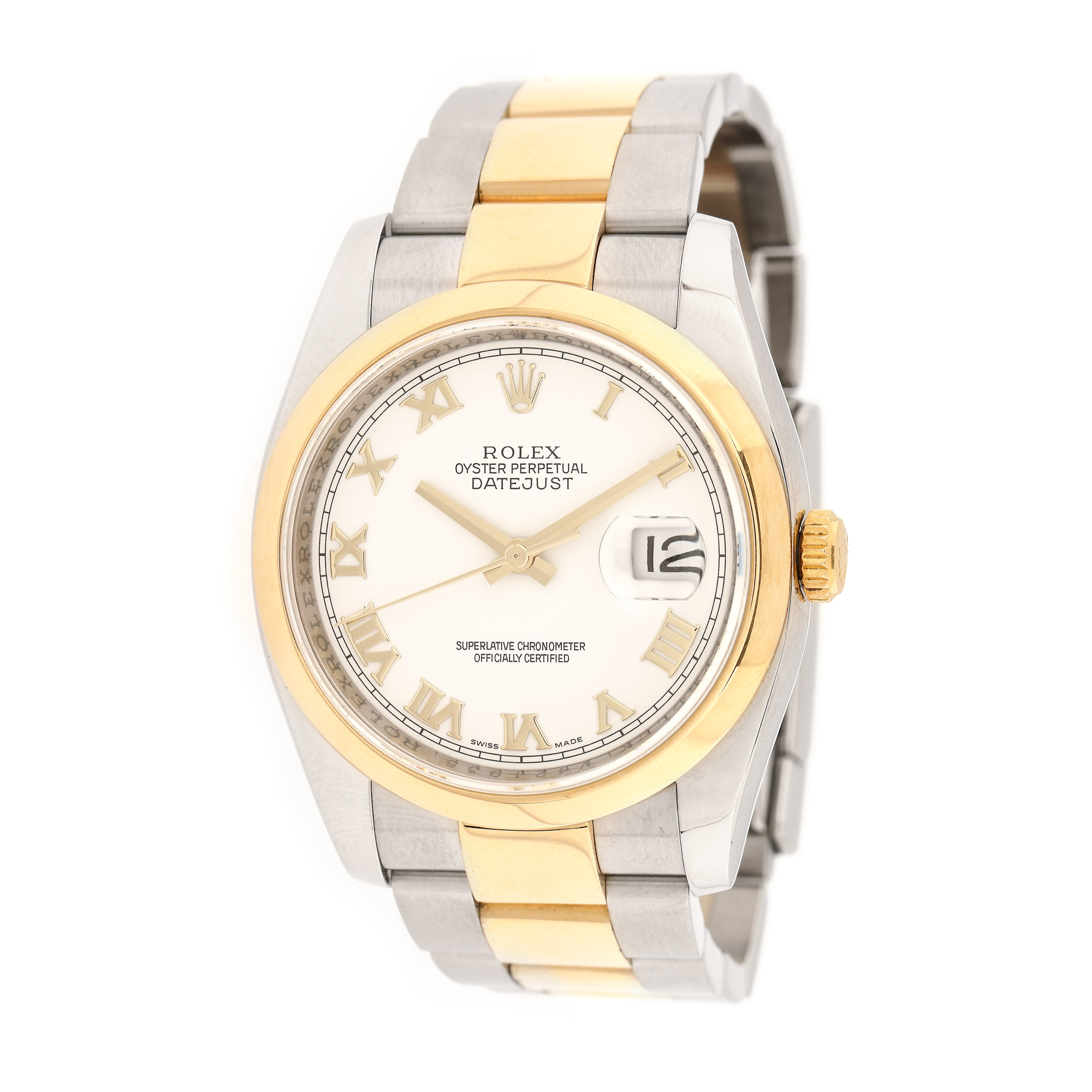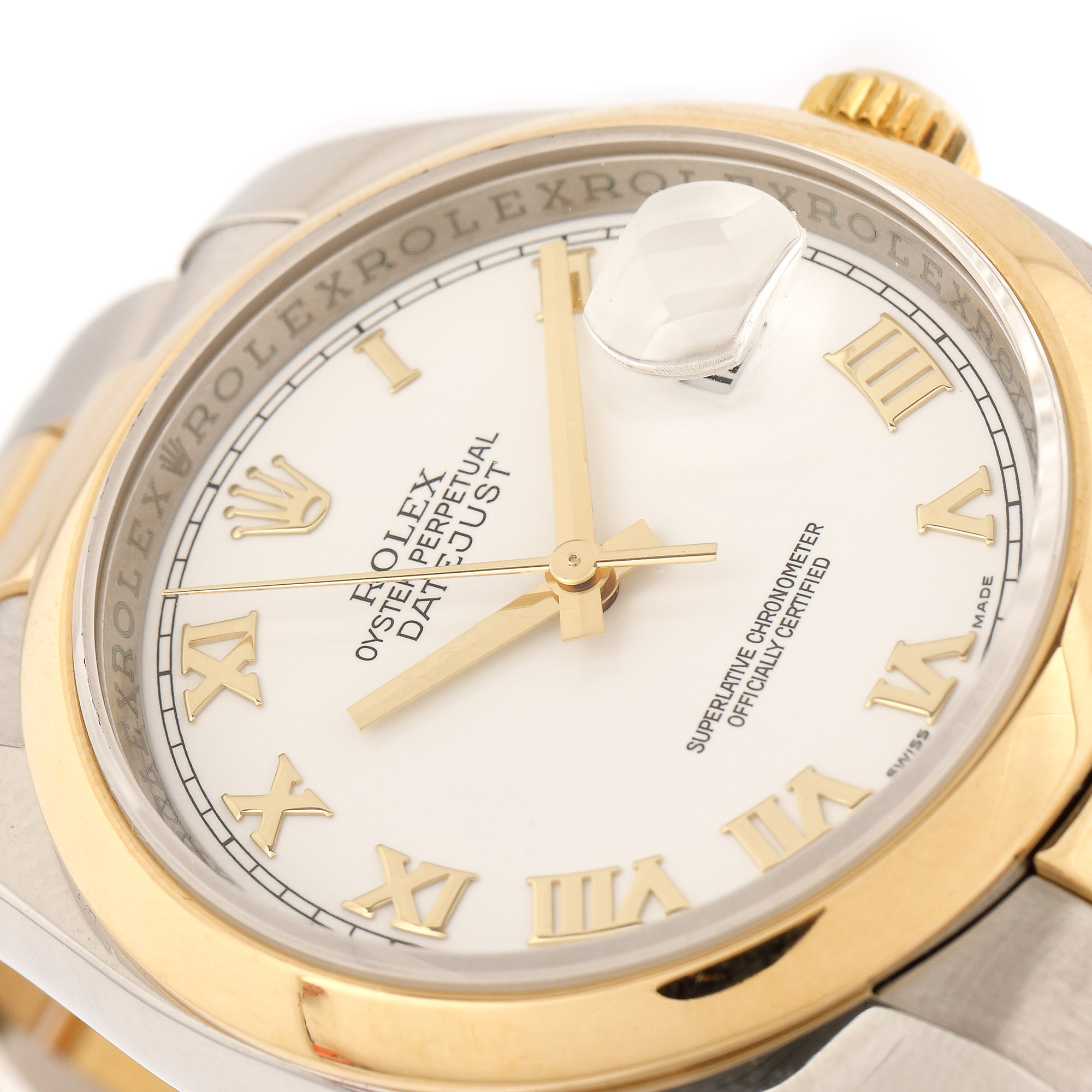Ceas Rolex Datejust, din aur și oțel, de mână, de damă, referință 116203, mecanism automatic. Cadran de culoare alb, numerale romane și registru pentru dată, cu lupă, în dreptul orei 3. Brățară din aur și oțel, cu sistem de închidere tip deployant, originale.