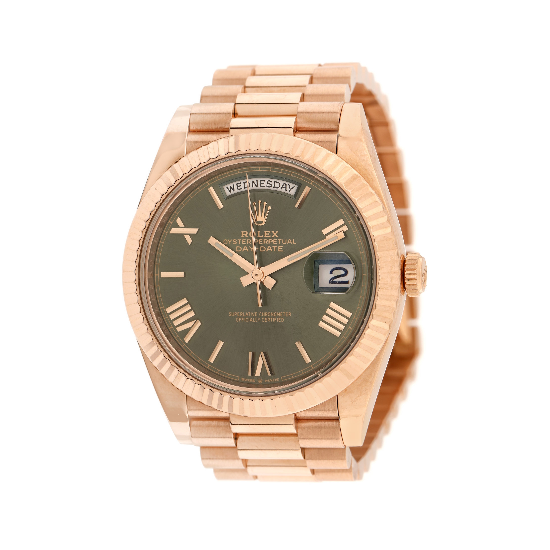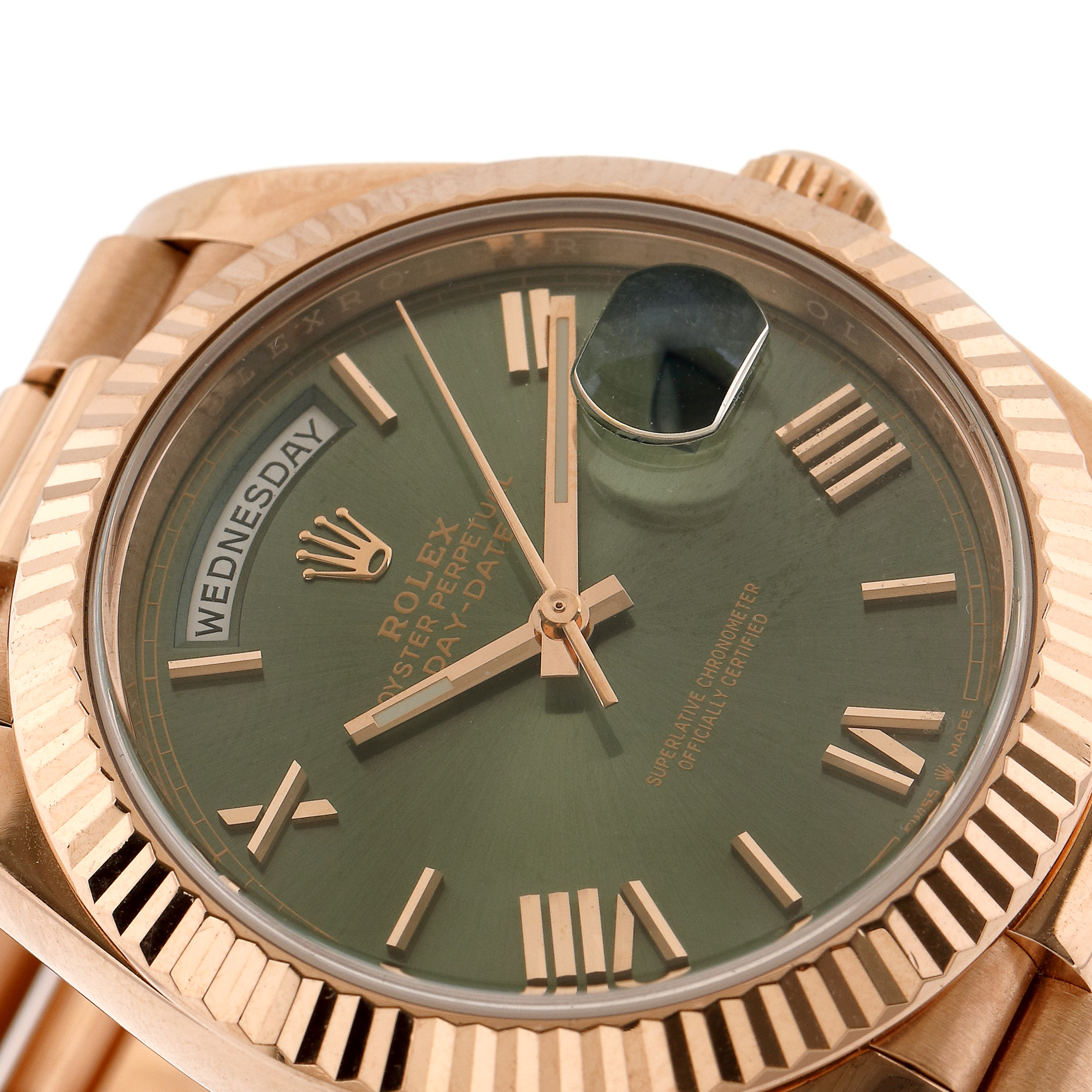 Ceas Rolex Day-Date, din aur roz, de mână, unisex, referință 228235, mecanism automatic. Cadran de culoare verde, numerale romane, registru pentru ziua săptămânii în dreptul orei 12 și registru pentru dată în dreptul orei 3. Brățară din aur roz și sistem de închidere tip deployant, originale.