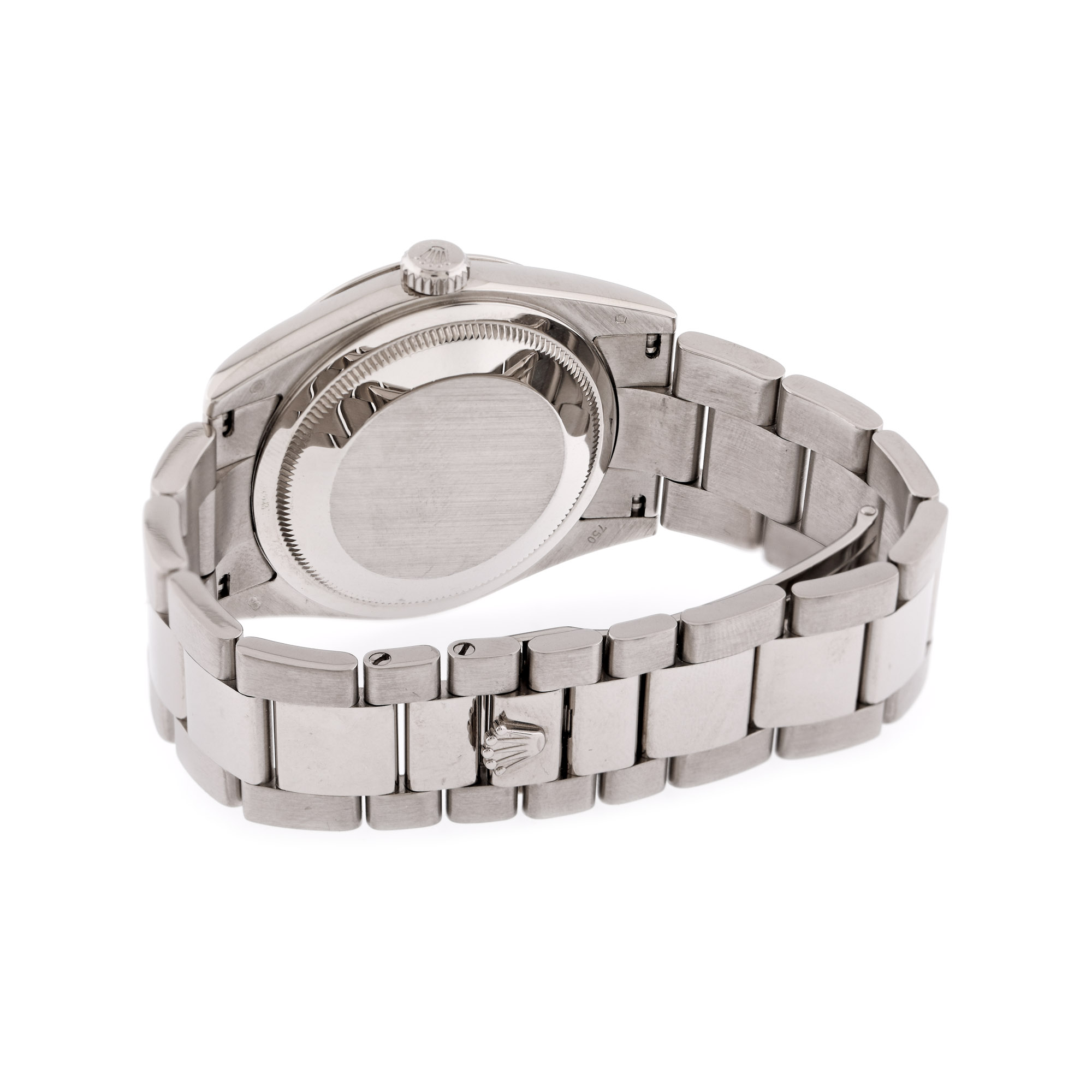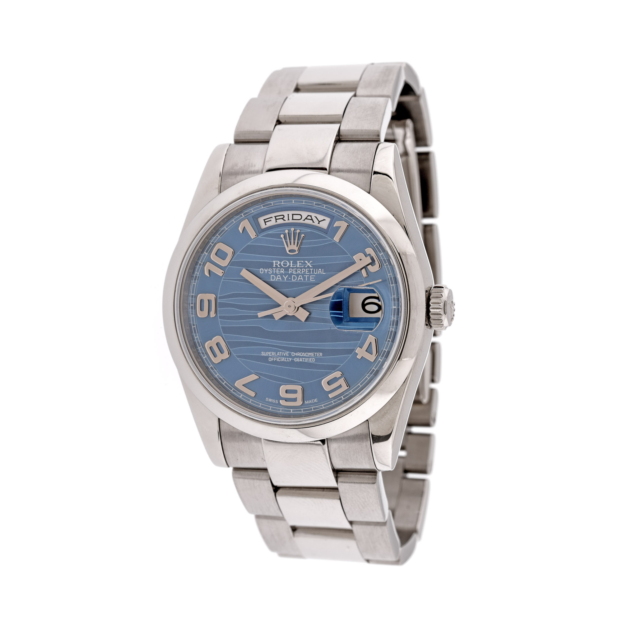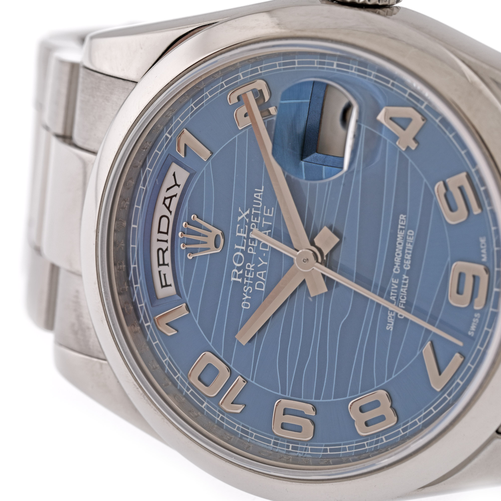 Ceas Rolex Day-Date din aur alb, de mână, de damă, referință 118209, mecanism automatic. Cadran de culoare bleumarin, numerale arabe, registru pentru ziua săptămânii, în dreptul orei 12 și registru pentru dată în dreptul orei 3. Brățară din aur alb și sistem de închidere tip deployant, originale. Accesorii: cutia originală