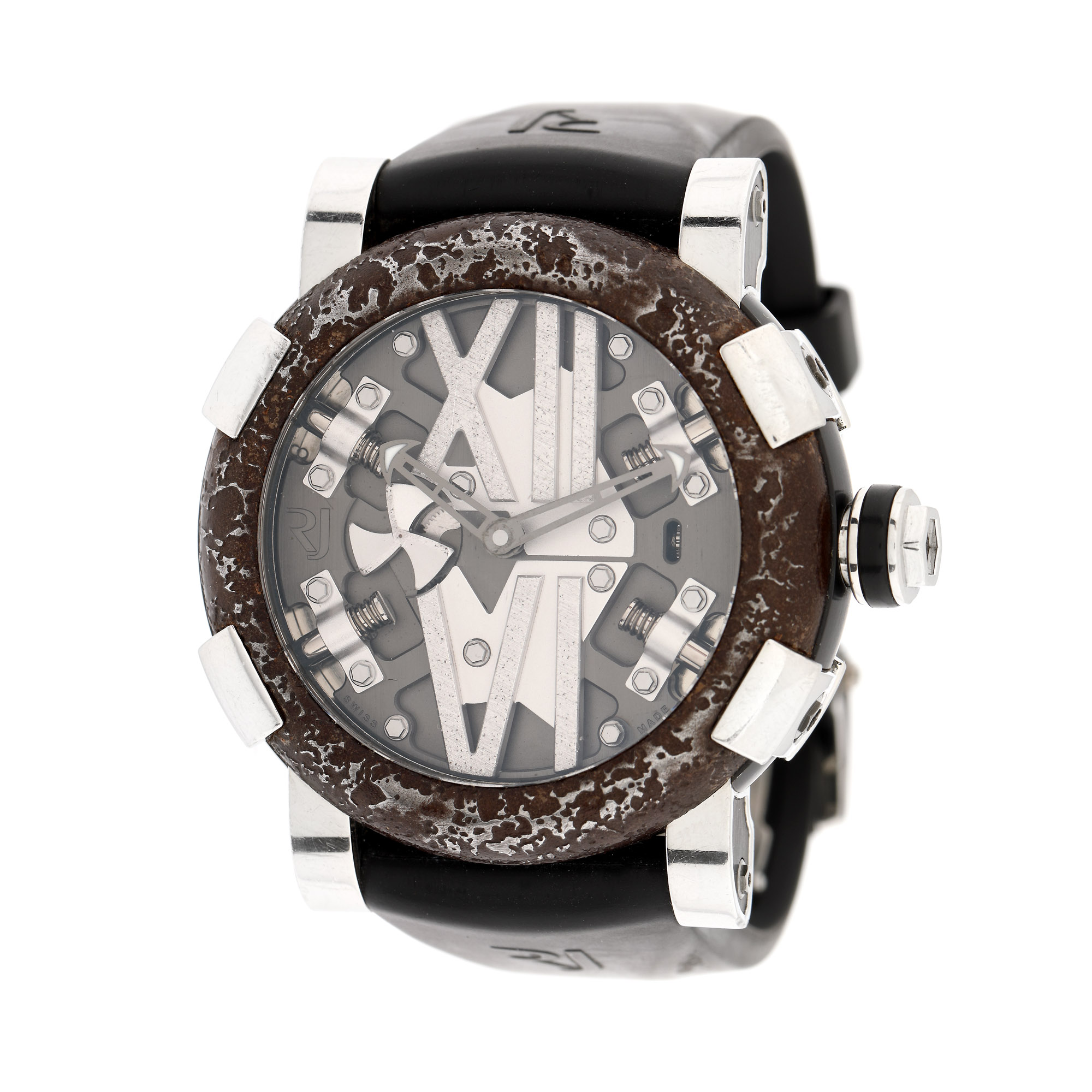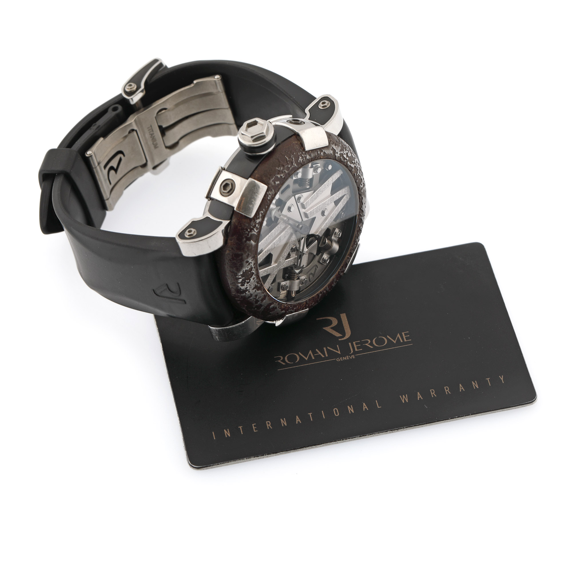 Ceas Romain Jerome Titanic-DNA, de mână, bărbătesc, ediție limitată 56/2012, mecanism automatic. Cadran tip skeleton, cu numerale romane. Curea originală din cauciuc, de culoare neagră și cataramă adăugată aftermarket. Carcasa este realizată din compozit negru și bezel din metal ruginit, stabilizat. Materialul utilizat provine din nava-pasager Titanic, scufundată în anul 1912. Accesorii: card de garanție semnat și datat 02/05/2012, neștampilat