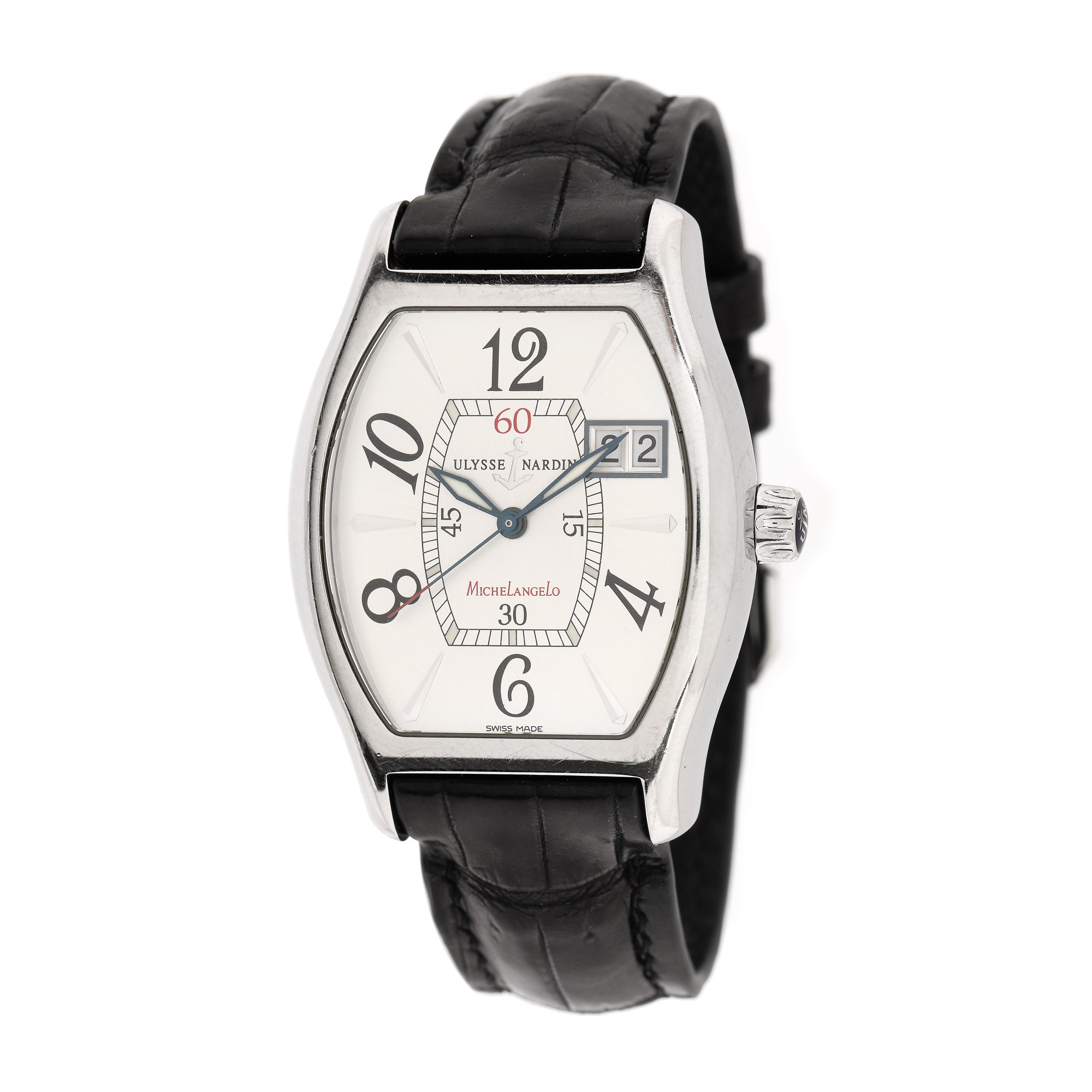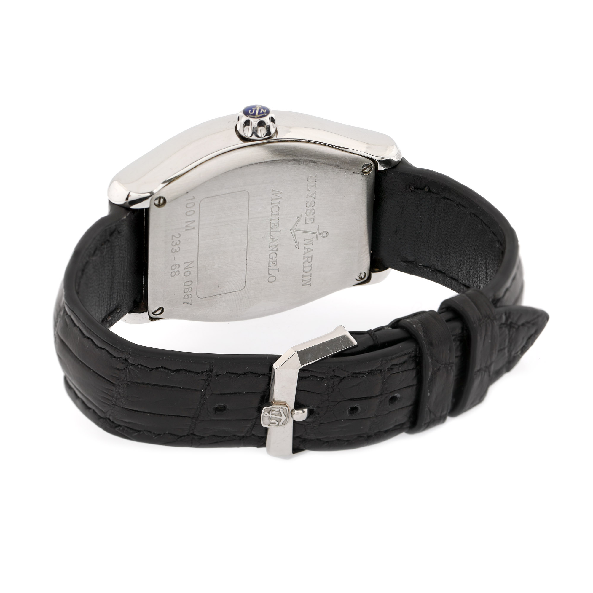 Ceas Ulysse Nardin Michelangelo Big Date, de mână, bărbătesc, referință 233-68, mecanism automatic. Cadran de culoare silver, numerale arabe, registru pentru secundar central și registru pentru dată în dreptul orei 2. Curea din piele de aligator, de culoare neagră, adăugată aftermarket, cu cataramă din oțel, originală. Accesorii: card de garanție nesemnat, neștampilat, datat 23.12.2010