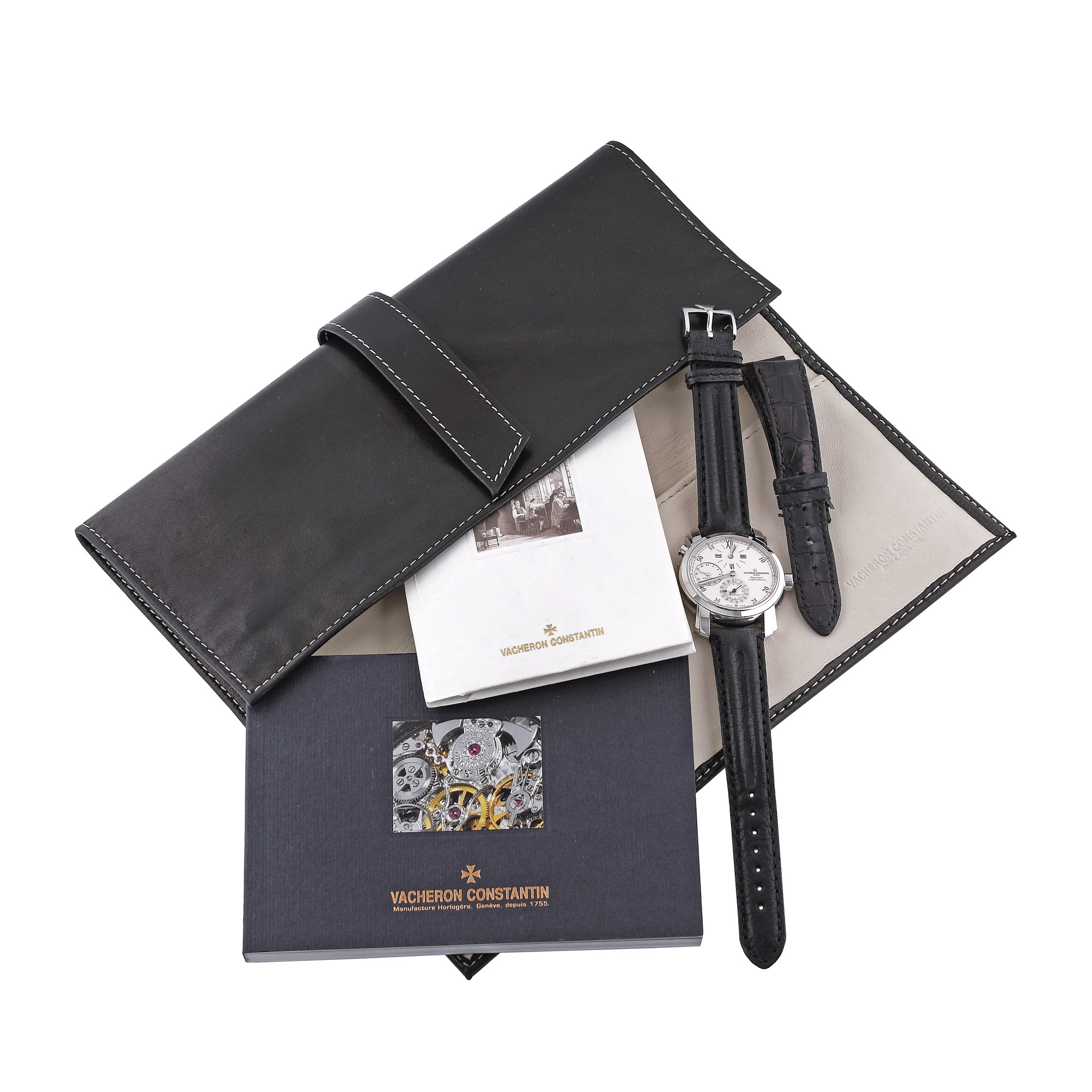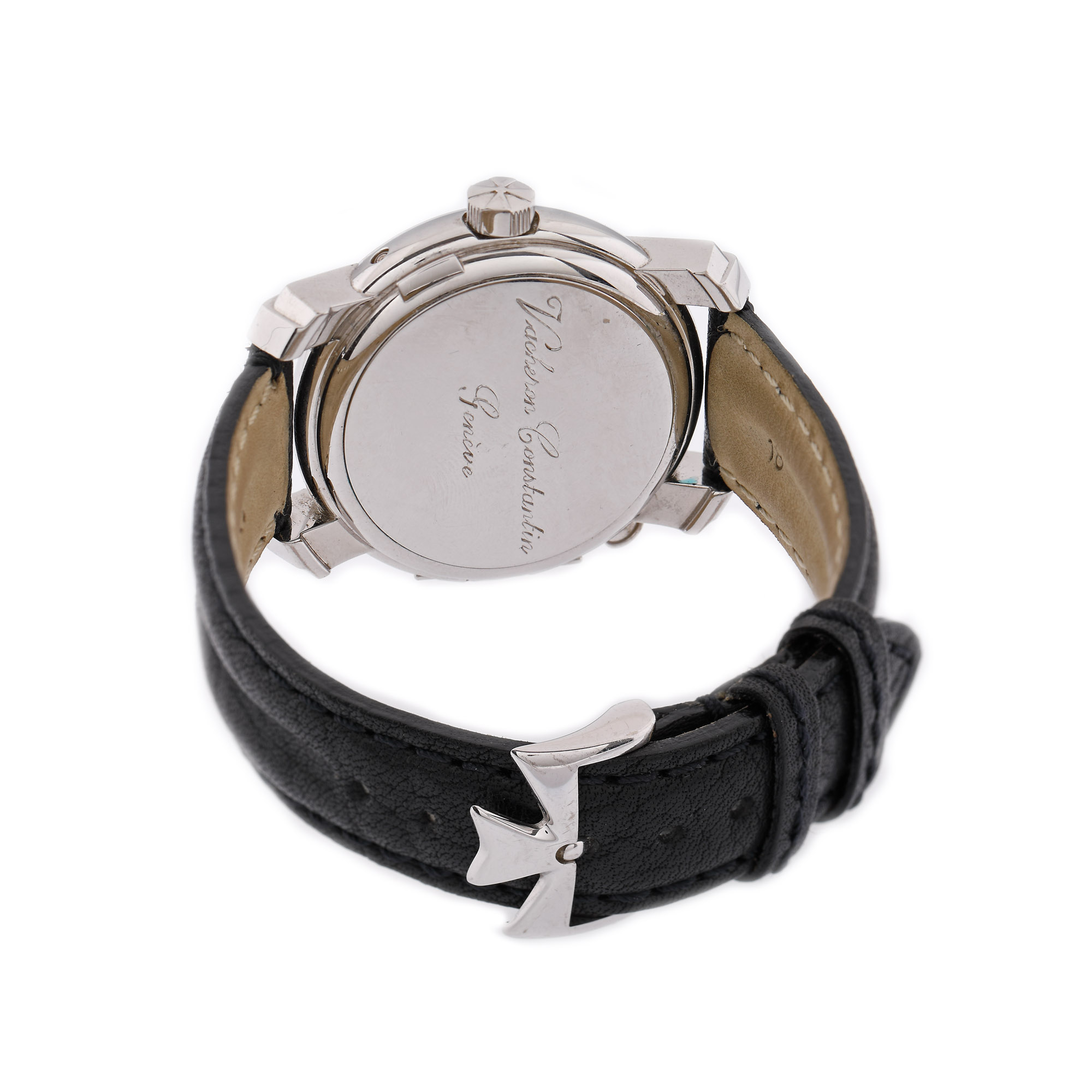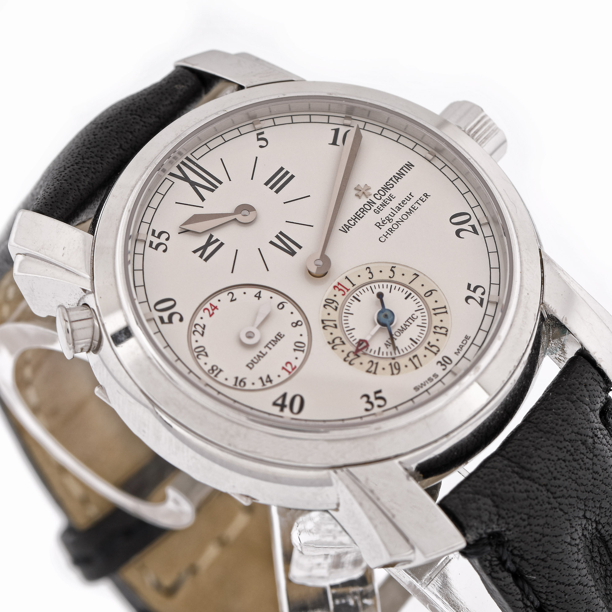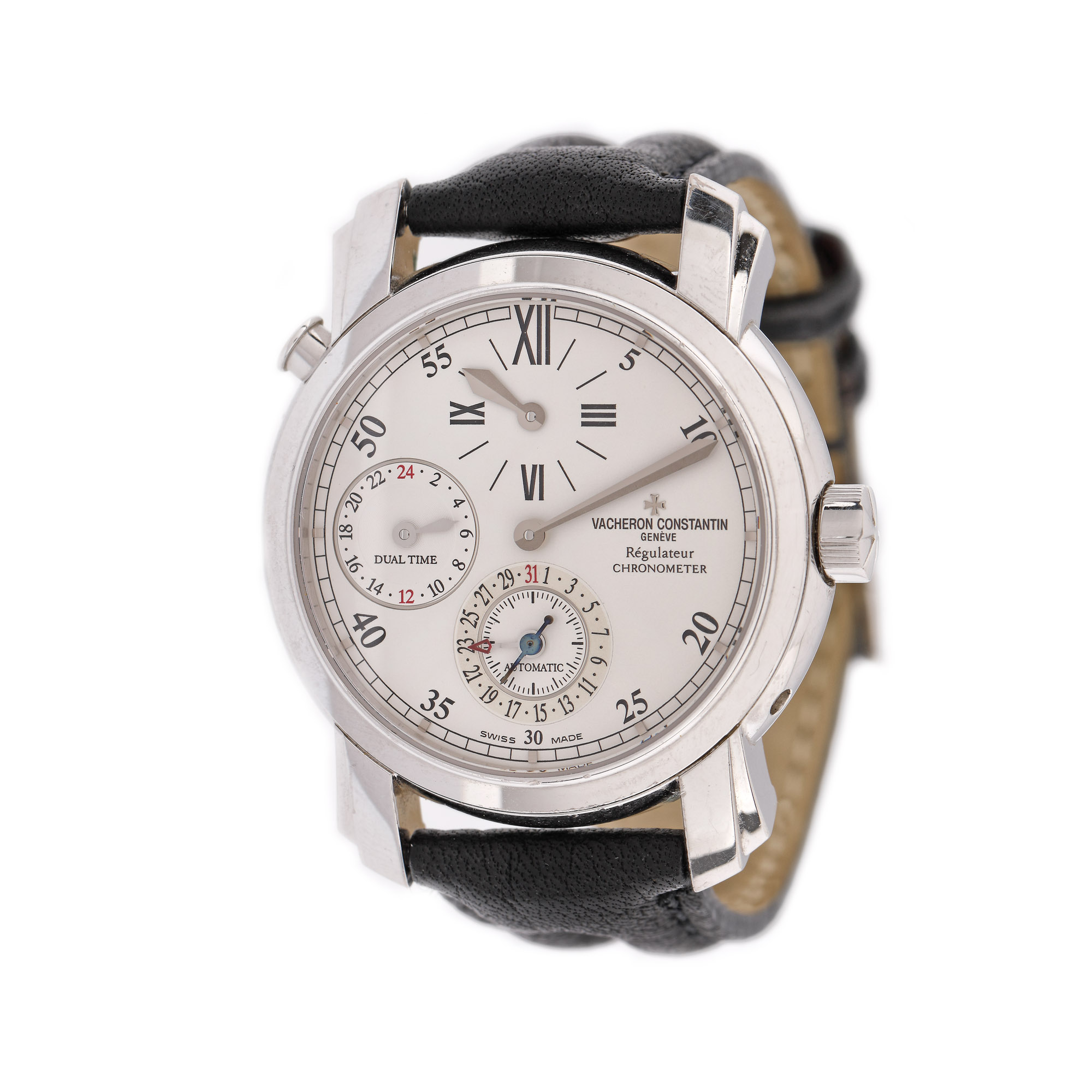 Ceas Vacheron Constantin Malte Regulateur Dual Time, din aur alb, de mână, bărbătesc, referință 42005, mecanism automatic, calibru 1206 RDT. Cadran de culoare alb, numerale romane și arabe, registru pentru ore în dreptul orei 12, registru pentru al doilea fus orar în dreptul orei 9 și registru pentru dată și ”small seconds” în dreptul orei 6. Curea din piele, de culoare neagră, adăugată aftermarket și cataramă din aur alb, originală. Accesorii: curea originală; etui original