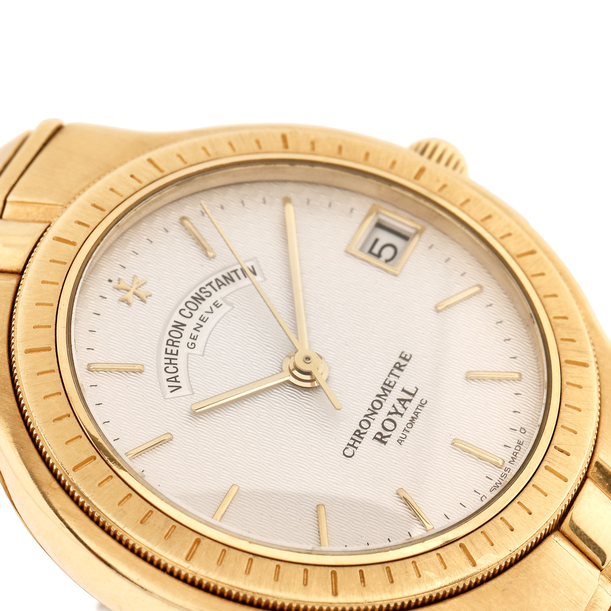 Ceas Vacheron Constantin Phidias Chronometer Royal, de mână, bărbătesc, referință 48020, mecanism automatic. Cadran de culoare alb, decorat în tehnica guilloché, cu indici orari din aur și registru pentru dată în locul orei 3. Curea cu sistem de închidere tip deployant, din aur, originale.