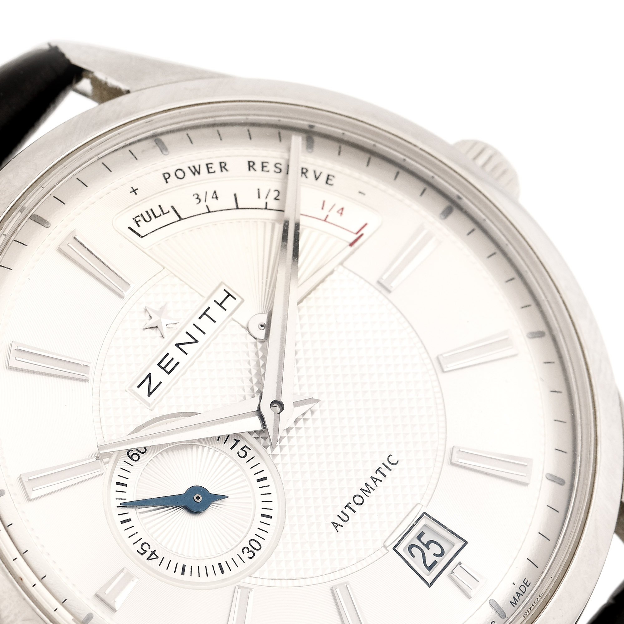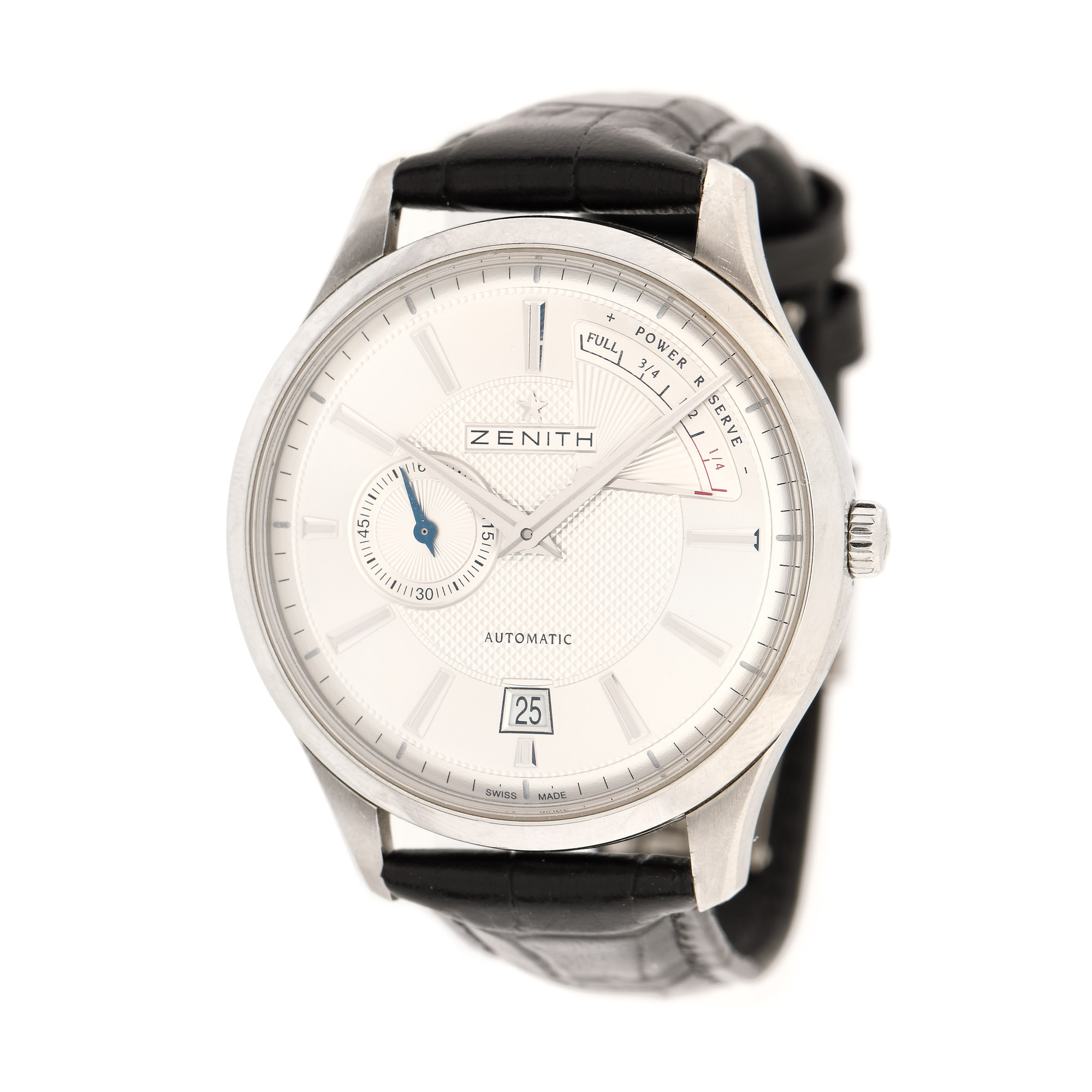Ceas Zenith Capitan Power Reserve, de mână, bărbătesc, referință 03.2120.685/02.C498, mecanism automatic, calibru Elite 685, anterior vitrat. Cadran de culoare argintiu, cu indici orari din oțel, registru pentru secunde în dreptul orei 9, registru pentru dată în dreptul orei 6 și registru pentru rezerva de timp în locul orelor 1 și 2. Curea din piele, de culoare neagră și sistem de închidere tip deployant, înlocuite aftermarket.