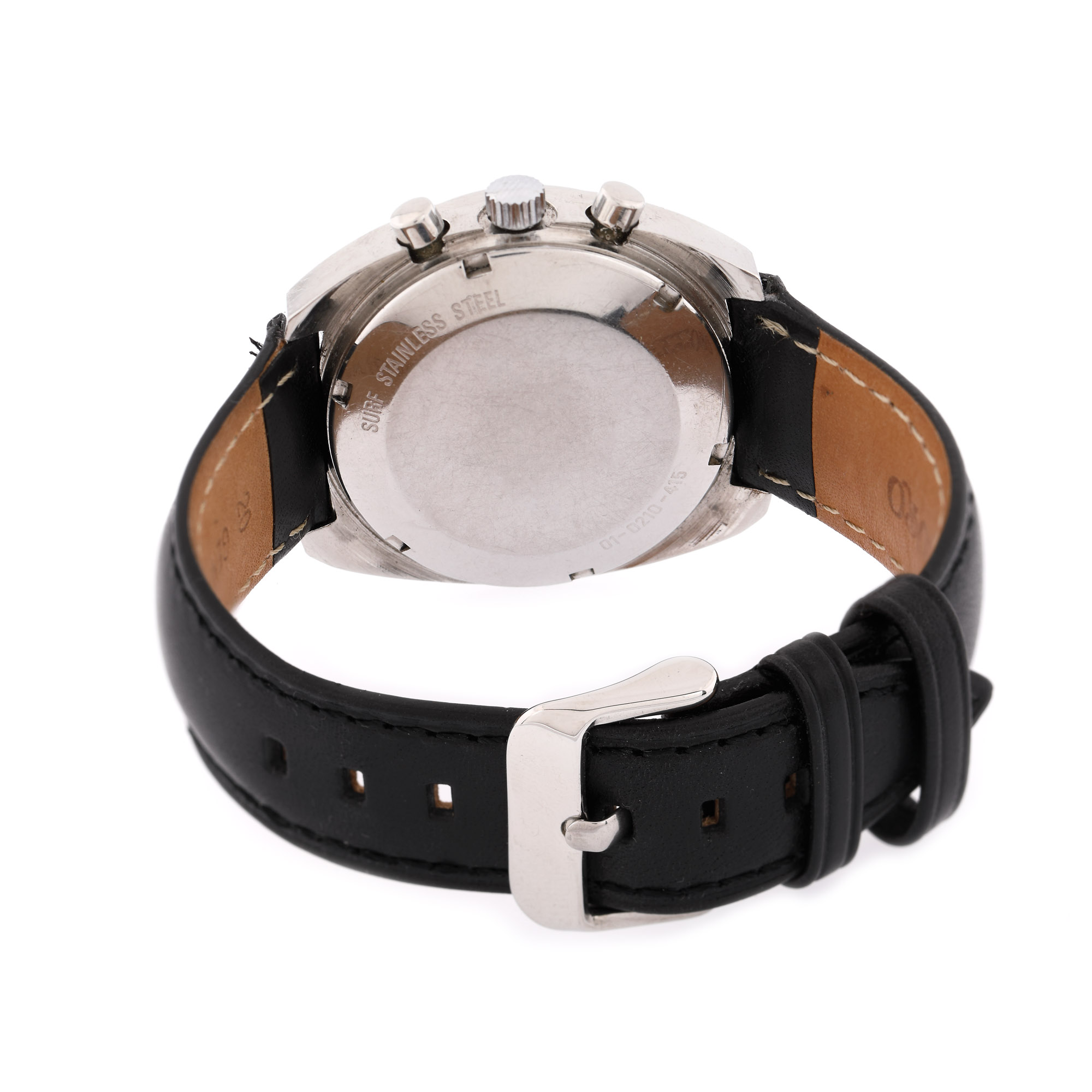 Ceas Zenith El Primero, de mână, bărbătesc, referință 01-0210-415, mecanism automatic. Cadran de culoare argintiu, trei registre și registru pentru dată între orele 4 și 5. Curea din piele, de culoare neagră și cataramă din oțel inoxidabil, adăugate aftermarket.