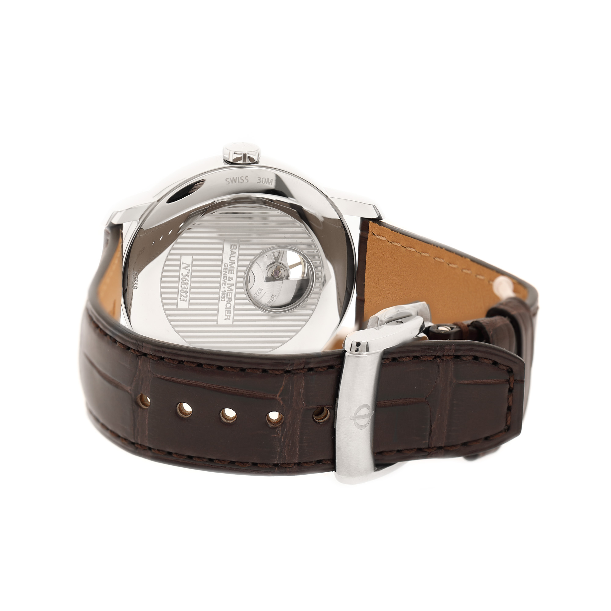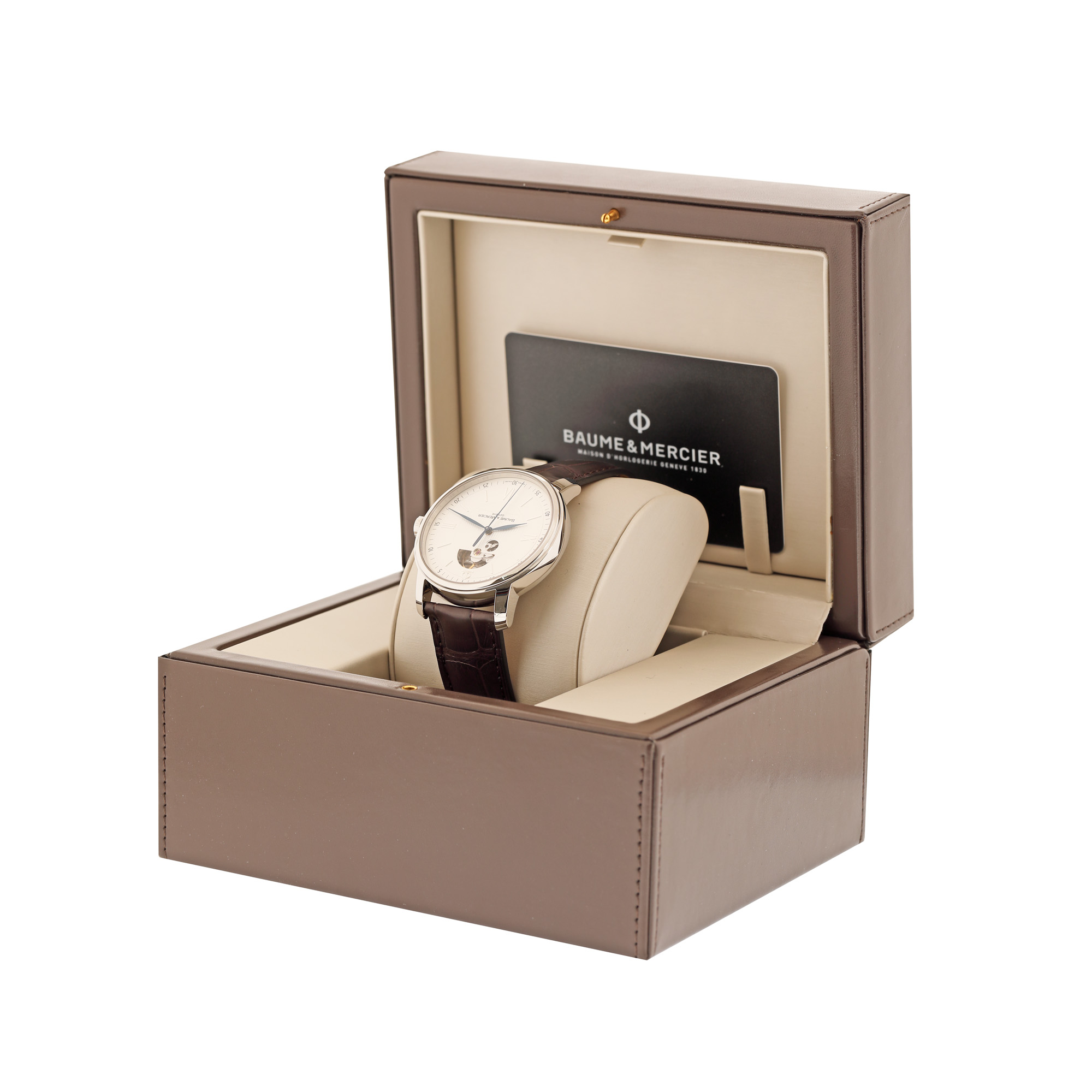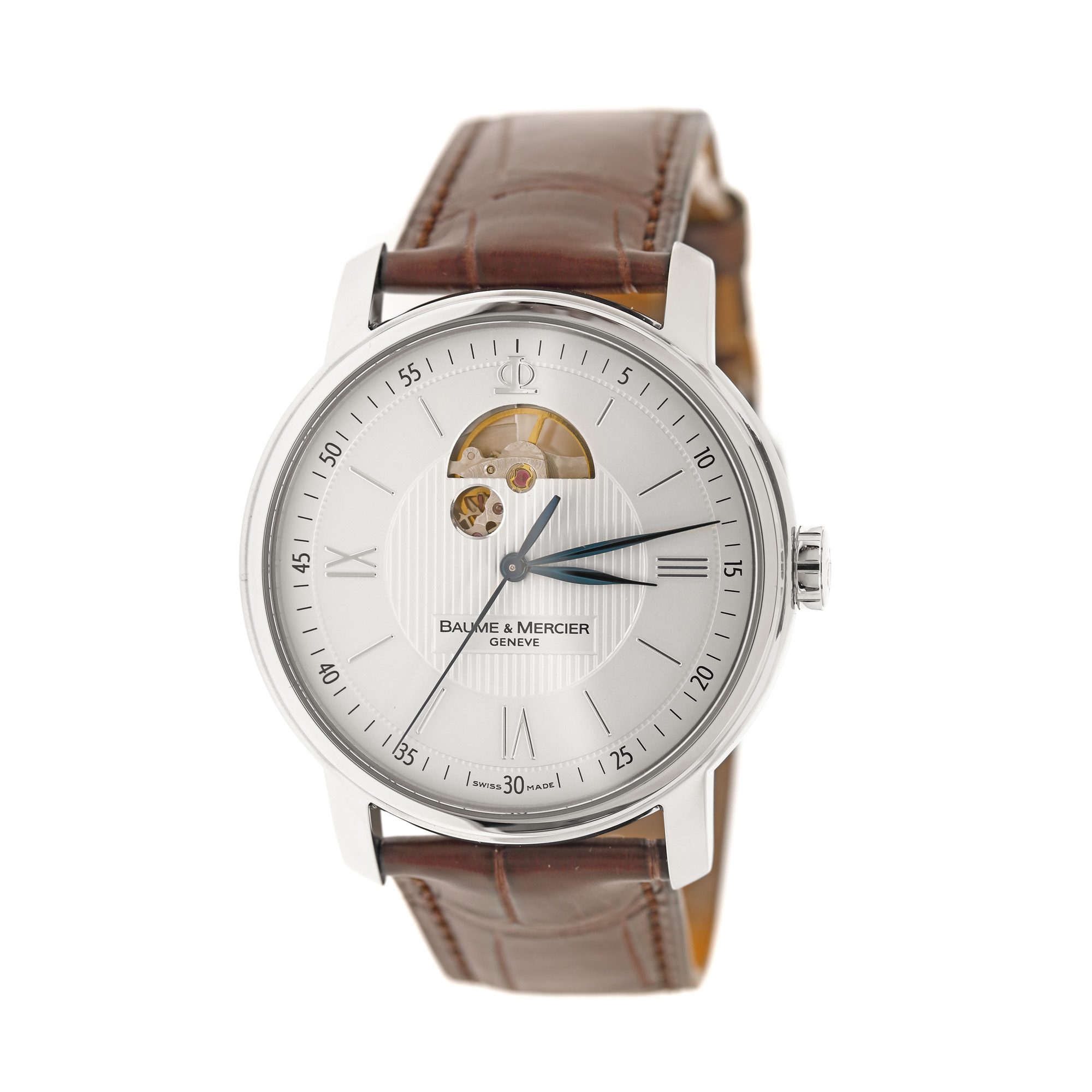 Ceas Baume & Mercier Classima, de mână, bărbătesc, nou, referință M0A08688. Mecanism automatic, calibrul BM110200, cu 26 de rubine, anterior parțial vitrat. Cadran de culoare gri deschis, indici numerale romane pentru ore și numerale arabe pentru minute, registru vitrat prin care se vede mecanismul. Curea originală, din piele, de culoare maro, cu sistem de închidere de tip deployant. Accesorii: cutia originală, card de garanție.