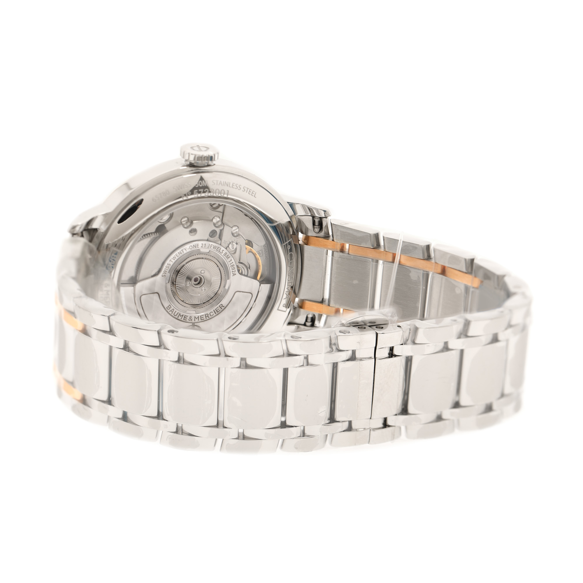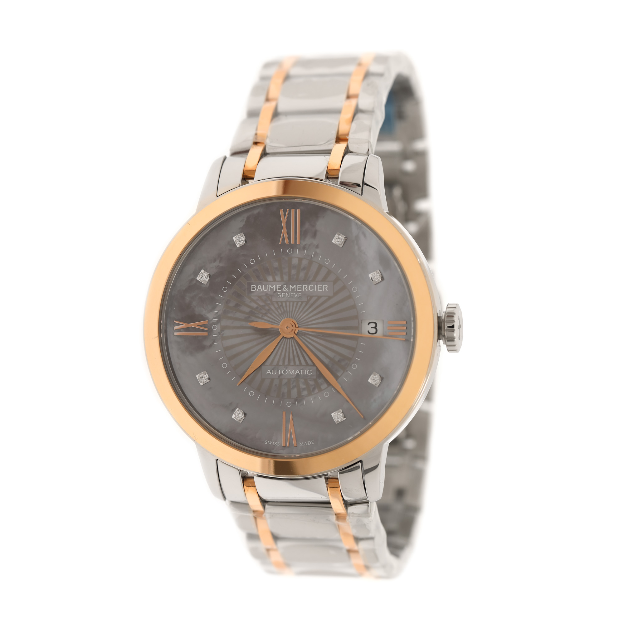 Ceas Baume & Mercier Classima, din aur și oțel, cu diamante, de mână, de damă, nou, referință M0A10297. Mecanism automatic, calibrul BM11829A, cu 21 de rubine, anterior vitrat. Cadran din sidef de culoare brun, indici numerale romane pentru orele 3, 6, 9, 12 și diamante pentru restul orelor. Brățară originală, cu sistem de închidere de tip deployant. Accesorii: cutia originală, card de garanție.