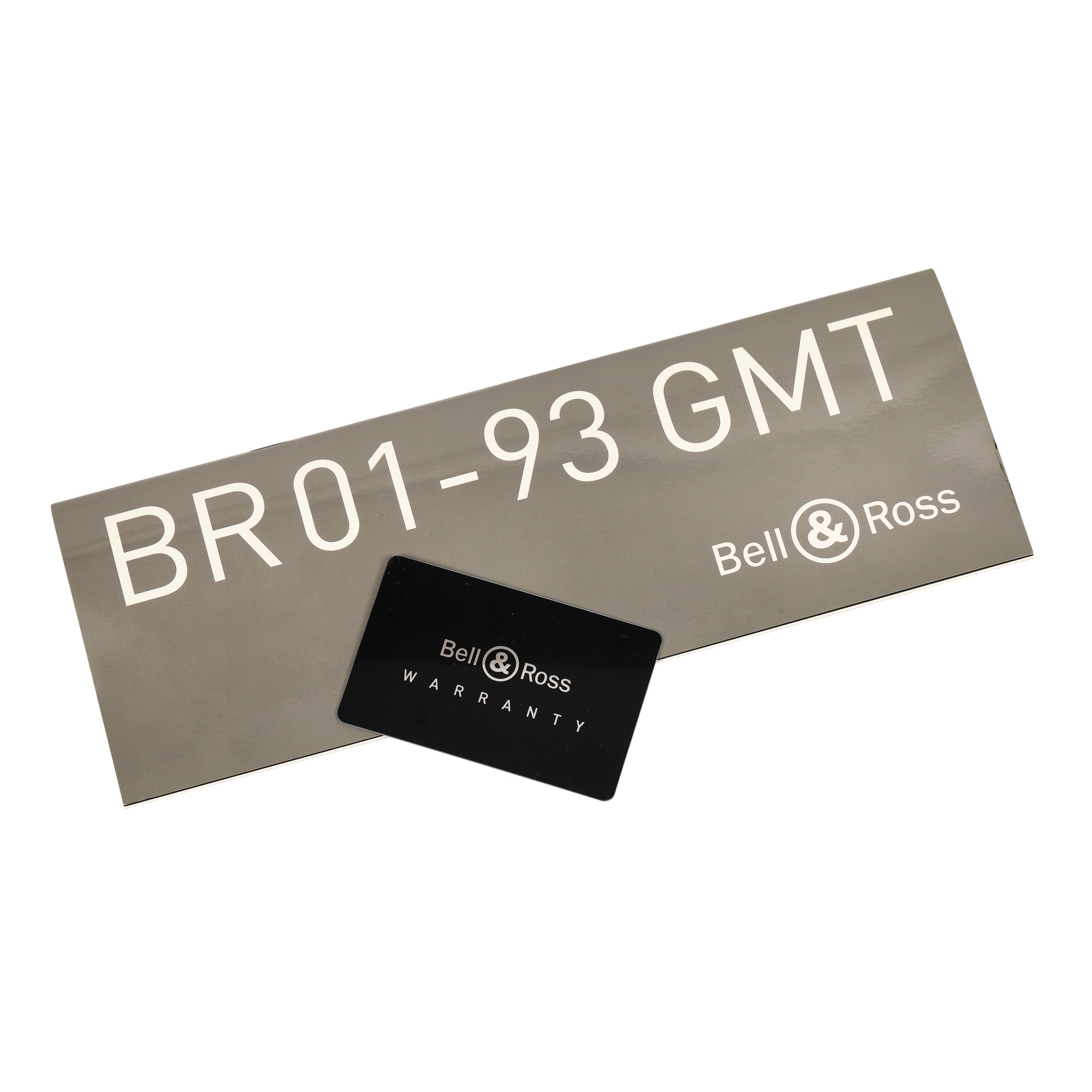 Ceas Bell&Ross BR01-93-GMT, de mână, bărbătesc, referință BR 01-93-SO-00186. Mecanism automatic cu funcție de fus orar. Cadran de culoare negru, cu indici cifre arabe pentru orele 3, 6, 9, 12, cu registru pentru dată poziționat între orele 4 și 5. Curea originală, din cauciuc, de culoare neagră, cu sistem de închidere clasic. Accesorii: cutia originală, două curele de schimb, două huse, scule originale pentru schimbarea curelelor, card de garanție și instrucțiuni.
