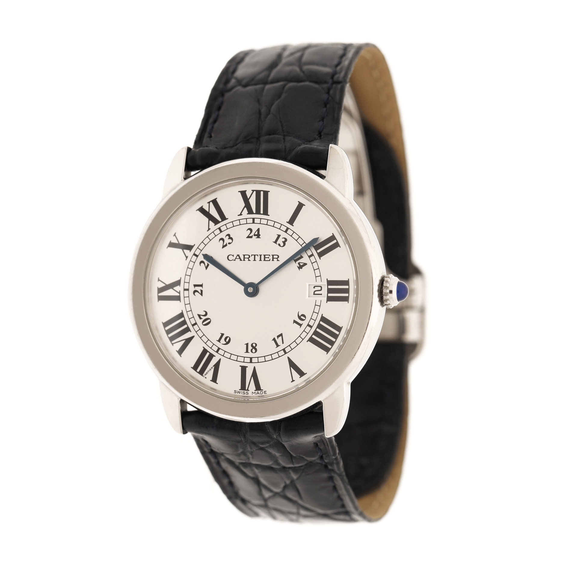 Ceas Cartier, de mână, bărbătesc. Mecanism quartz. Cadran de culoare gri, indici numerale romane pentru 12h, dublate de numerale arabe pentru 24h, registru pentru dată în dreptul orei 3. Curea originală, din piele, de culoare albastră, cu sistem de închidere de tip deployant.