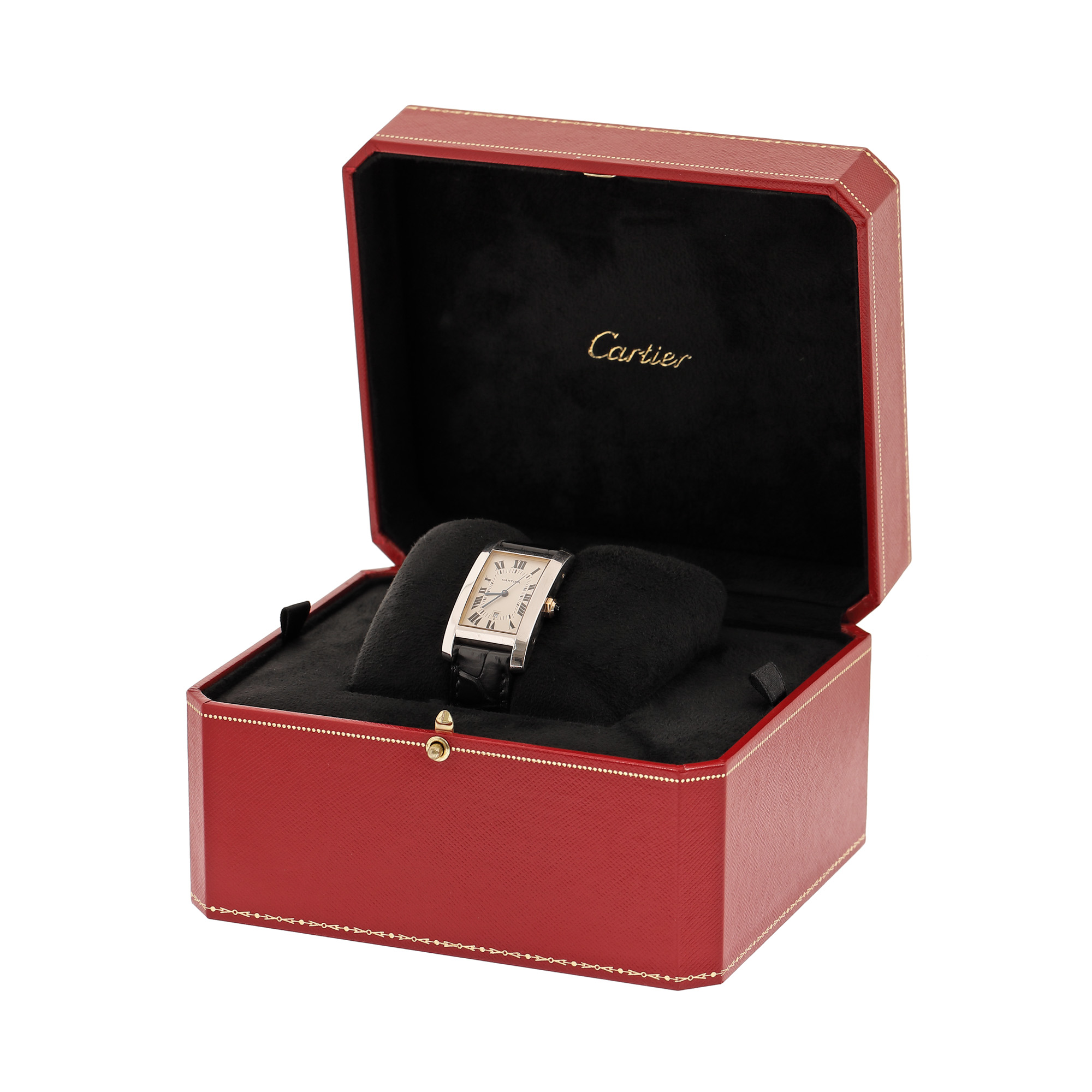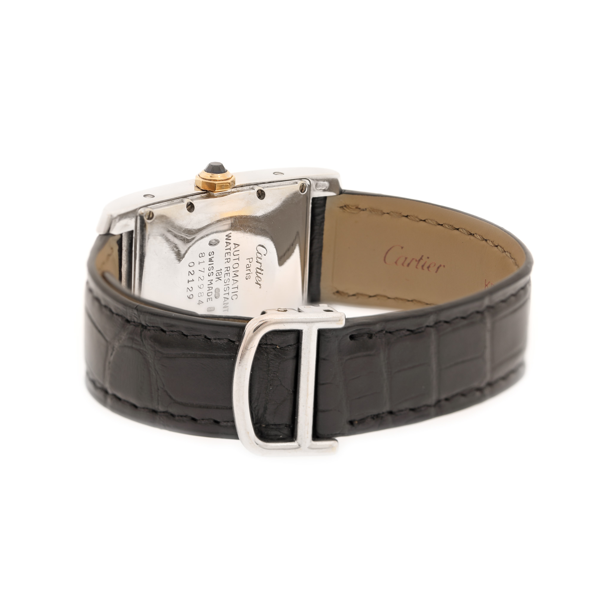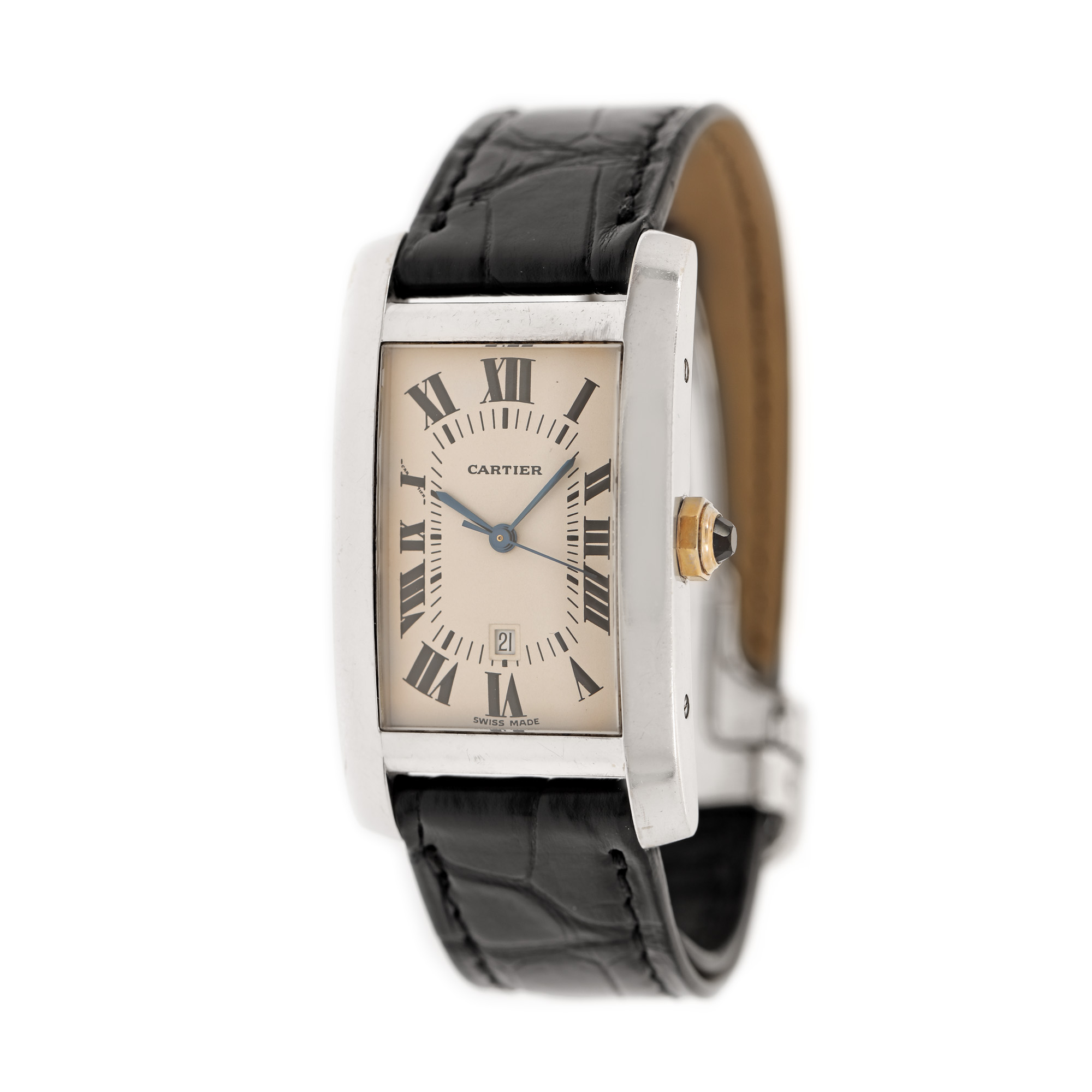 Ceas Cartier, din aur, de mână, unisex. Cadran de culoare alb, cu indici numerale romane. Curea originală, din piele, de culoare neagră, cu sistem de închidere de tip deployant.
