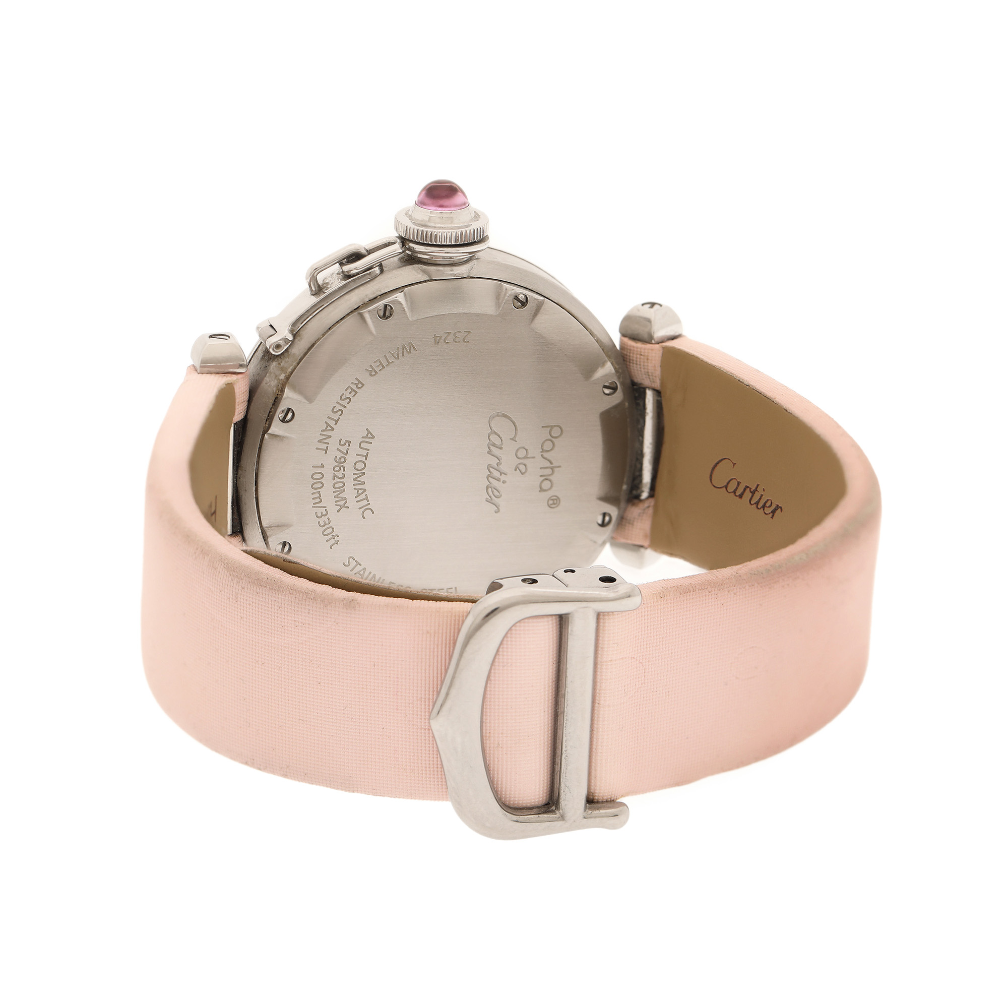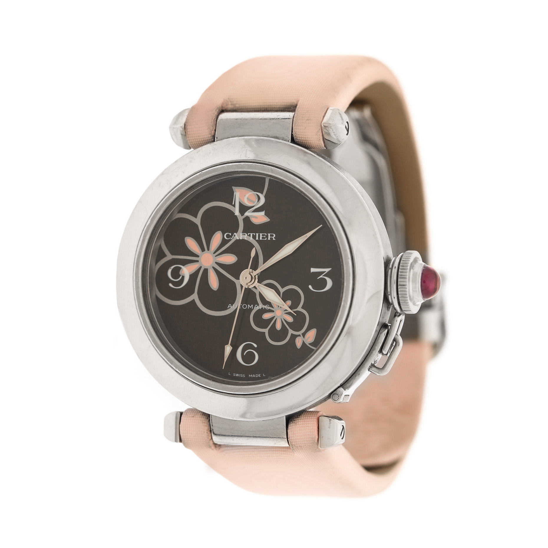 Ceas Cartier Pasha, de mână, de damă, referință 2324. Cadran de culoare negru, imprimat cu motiv floral, cu indici numerale arabe pentru orele 3, 6, 9 și 12. Curea originală, din piele și satin, de culoare roz, cu sistem de închidere de tip deployant.