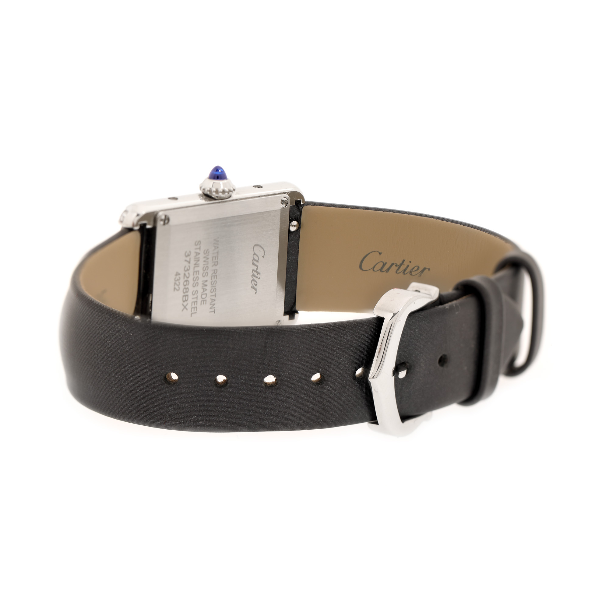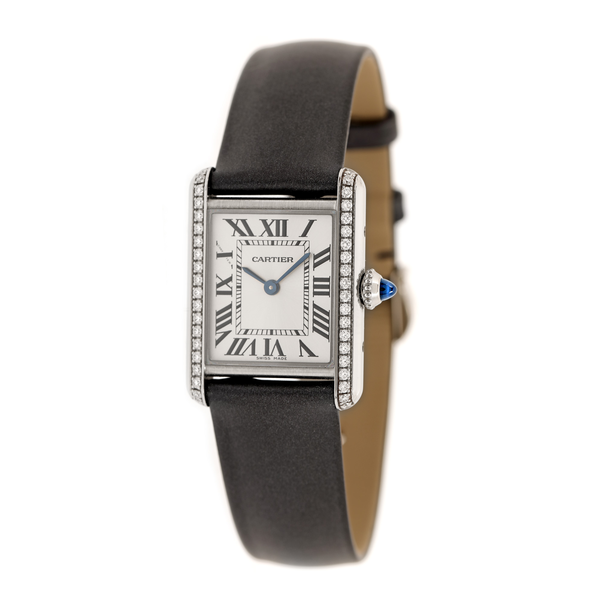 Ceas Cartier Tank cu diamante, de mână, de damă, referință W4TA0016. Mecanism quartz. Cadran de culoare argintiu, indici numerale romane. Curea riginală, din piele finisată cu satin, de culoare neagră, cu sistem de închidere clasic, cu catarama originală. Accesorii: borseta originală.