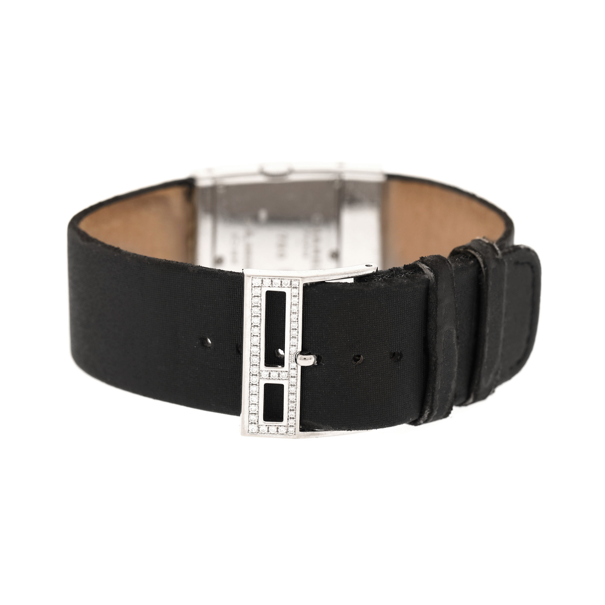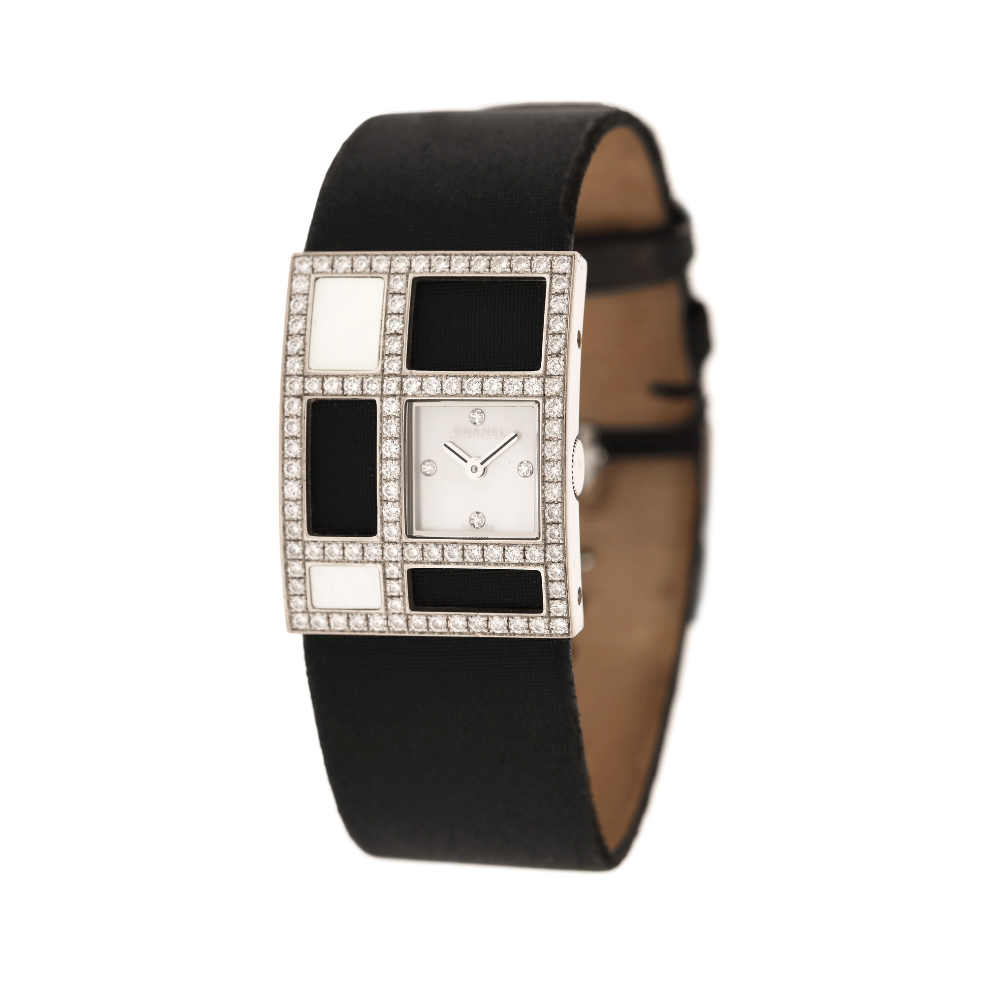 Ceas Chanel, din aur, cu diamante, de mână, de damă, referință H1184. Mecanism quartz, calibrul ETA 280.002. Cadran din sidef, indici diamante. Curea originală din piele și satin, de culoare neagră, cu sistem de prindere clasic, cu catarama originală.