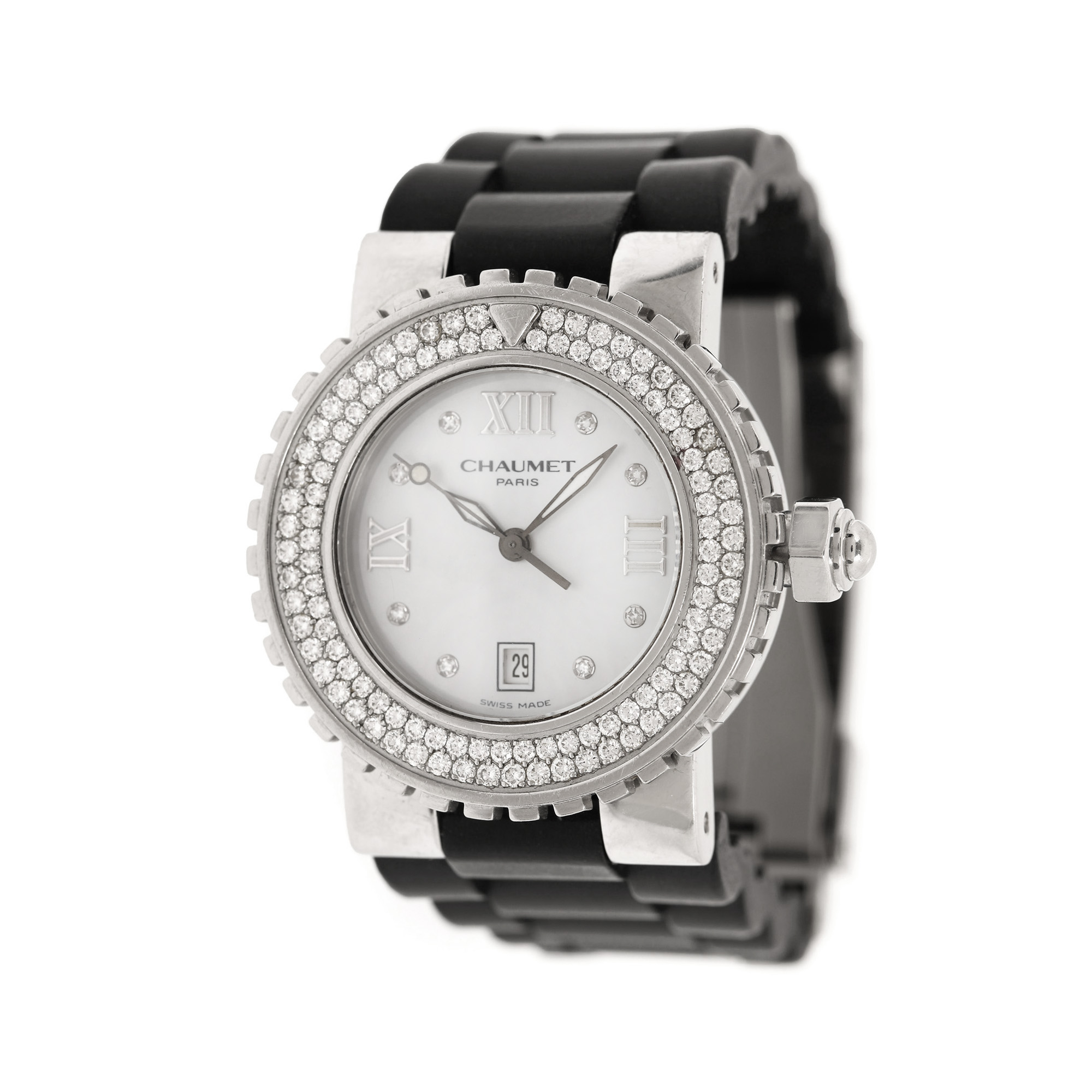Ceas Chaumet Class One, de mână, de damă, referință 622-12156, mecanism quartz. Cadran din sidef, indici numerale romane doar pentru orele 3, 9 și 12, registru pentru dată în dreptul orei 6. Bezel circular, fix, decorat integral cu diamante. Curea originală, din cauciuc, cu sistem de prindere de tip deployant.