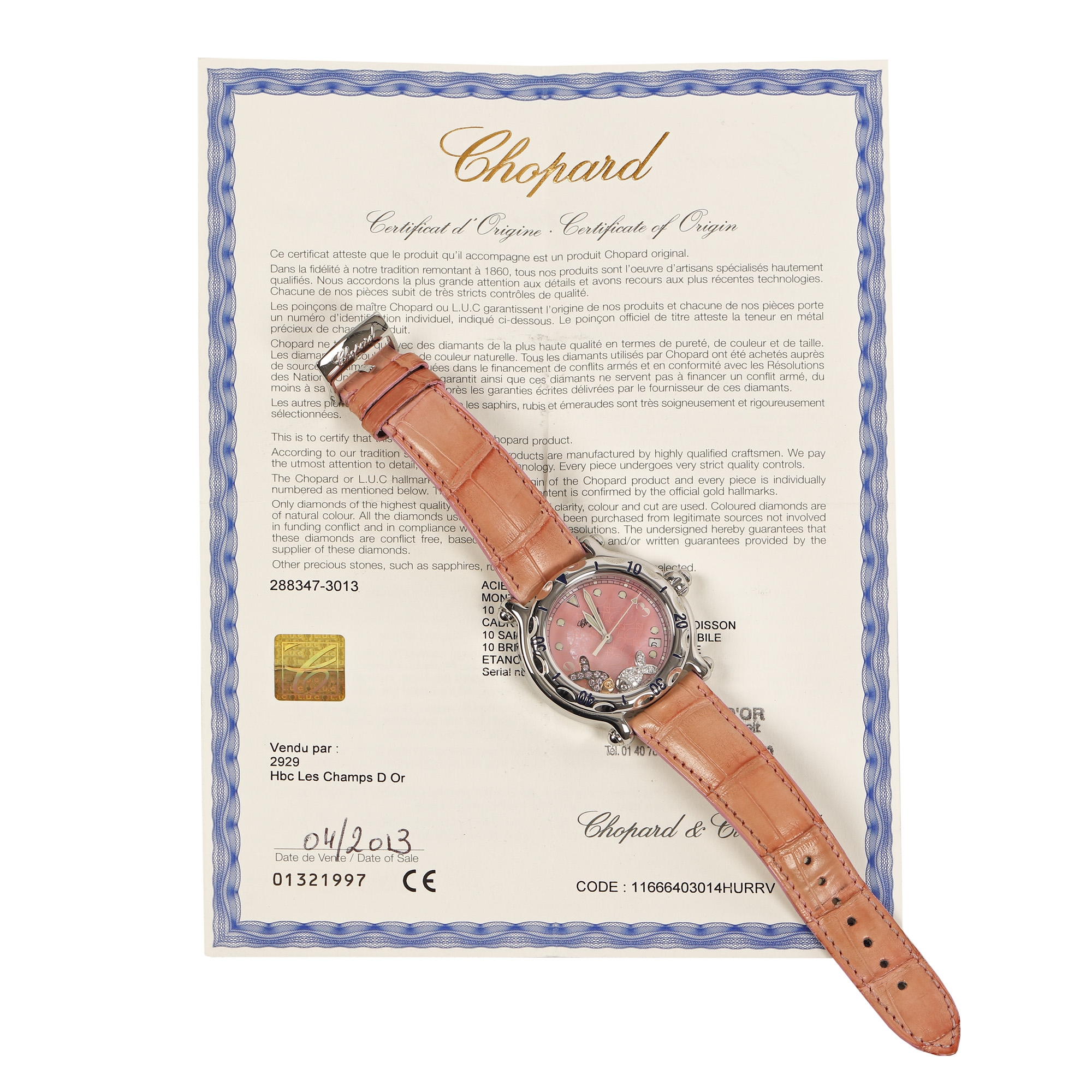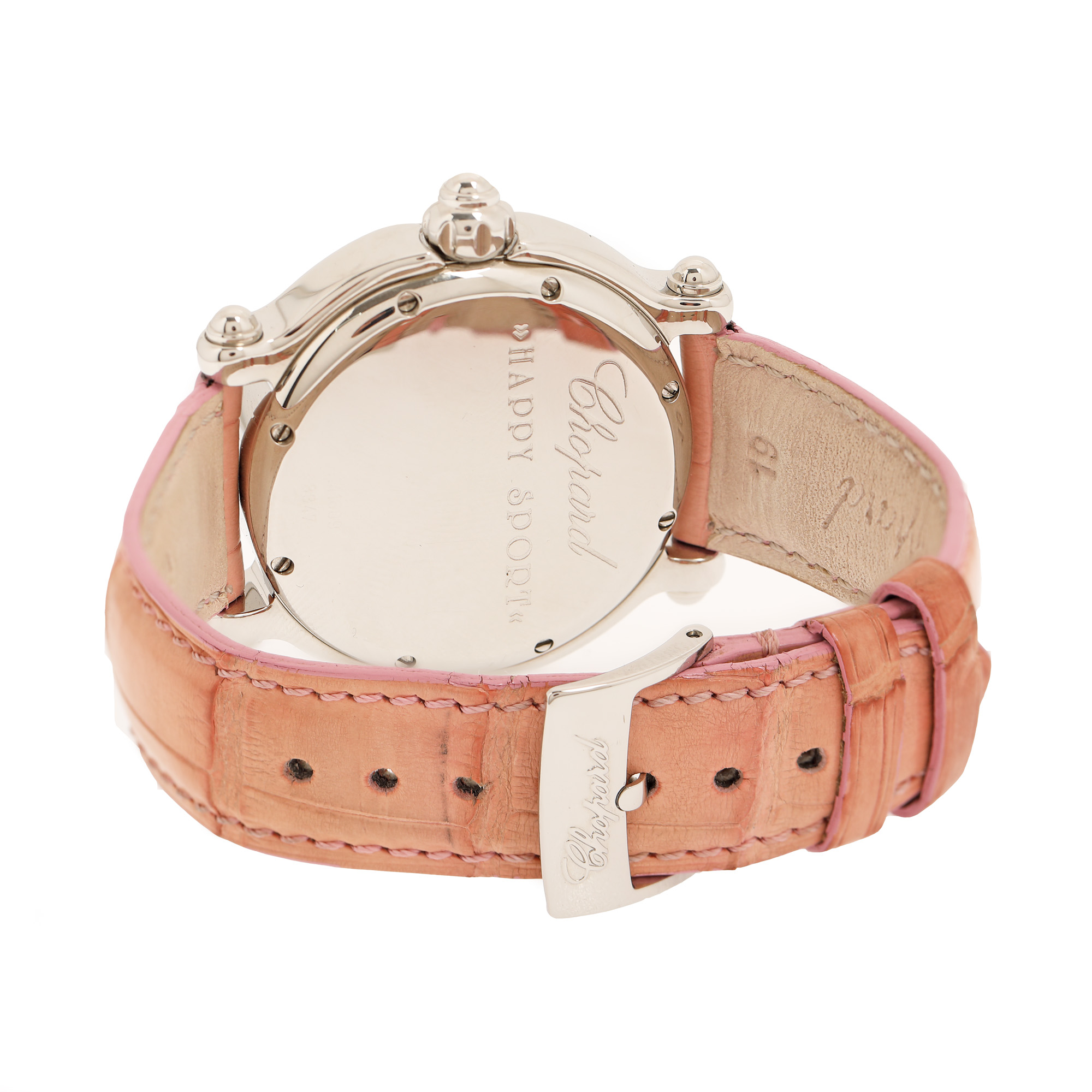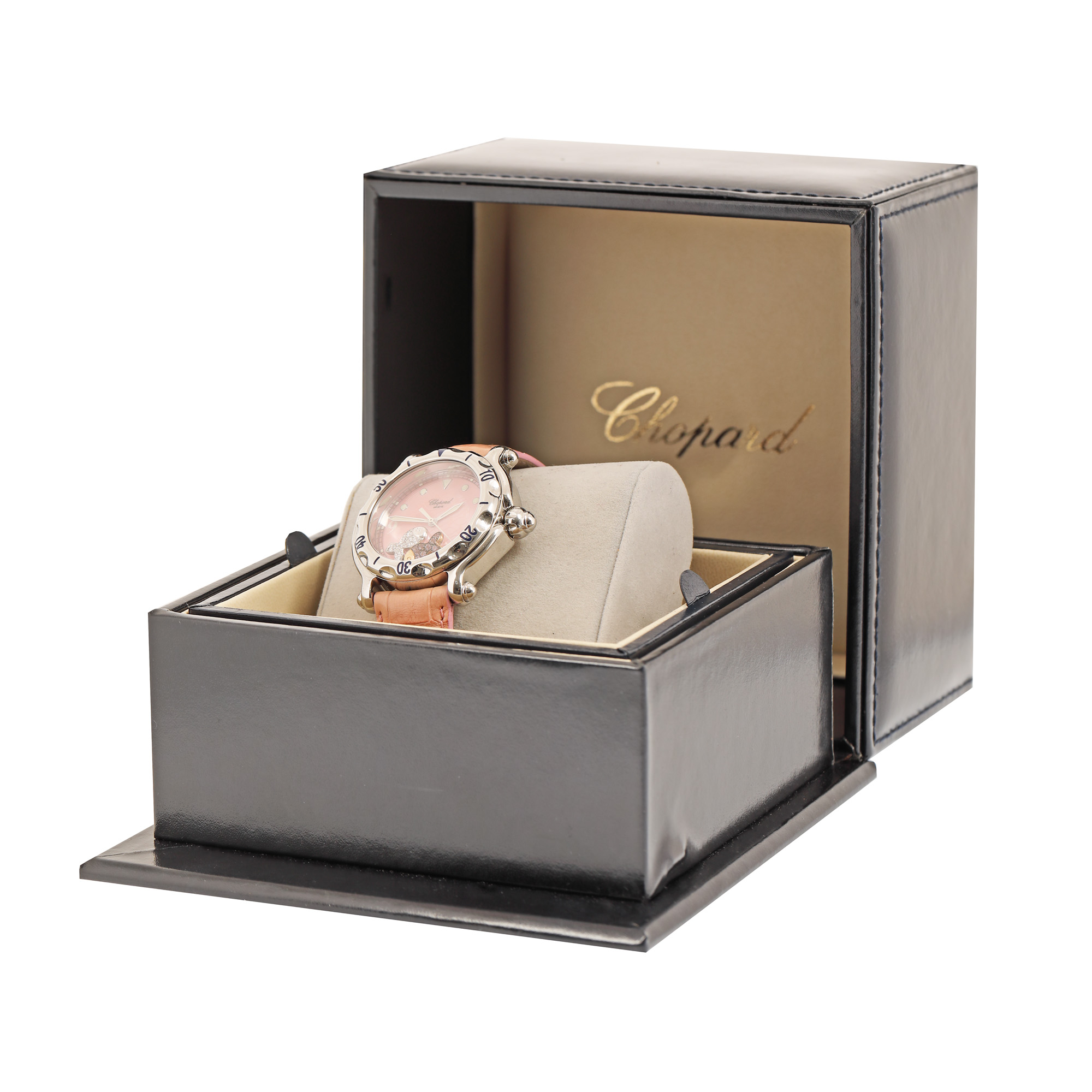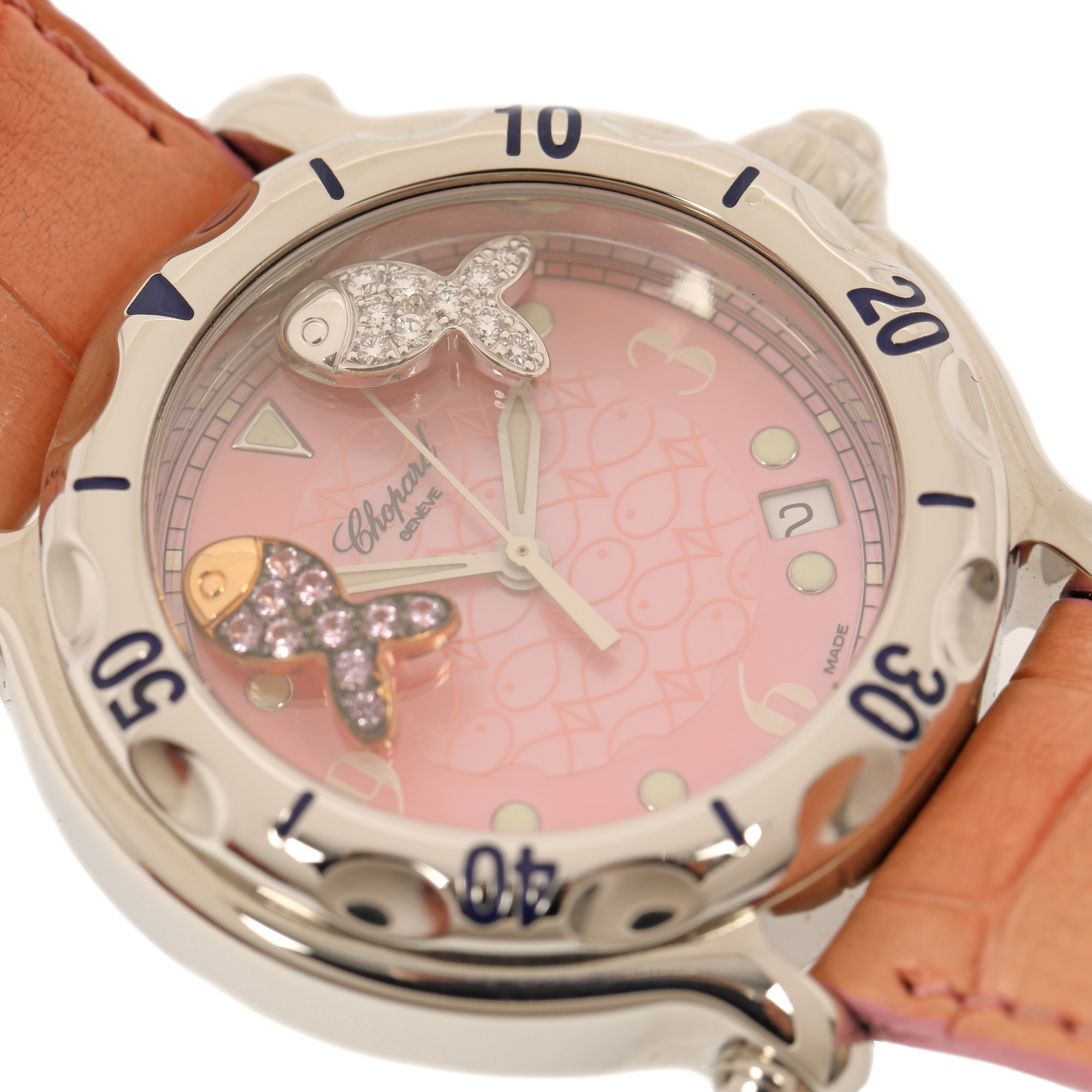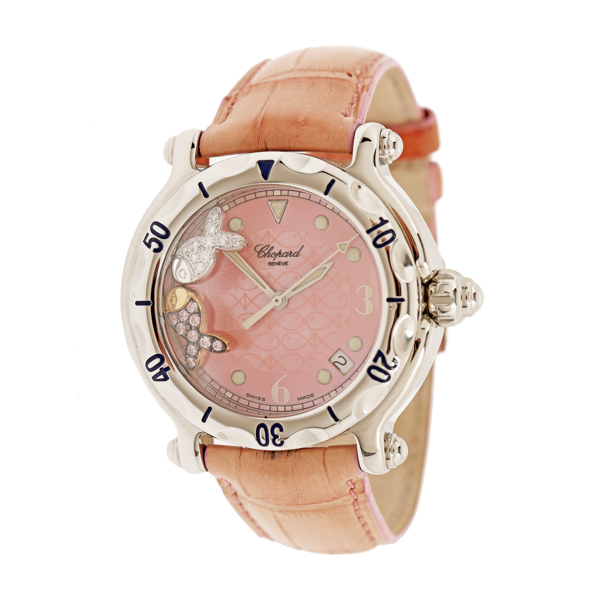 Ceas Chopard Happy Sport, cu diamante, de mână, de damă, referință 28/8347/8-402. Mecanism quartz, bezel rotativ, unidirecțional. Cadran din sidef de culoare roz, decorat cu pești stilizați, cu indici numerale arabe doar pentru orele 3, 6 și 9, cu registru pentru dată poziționat între orele 4 și 5. Decorat cu doi pești mobili acoperiți cu diamante. Curea originală, din piele de crocodil, de culoare roz, cu sistem de închidere clasic, cu catarama originală. Accesorii: cutia originală, certificat de autenticitate și certificat de garanție.