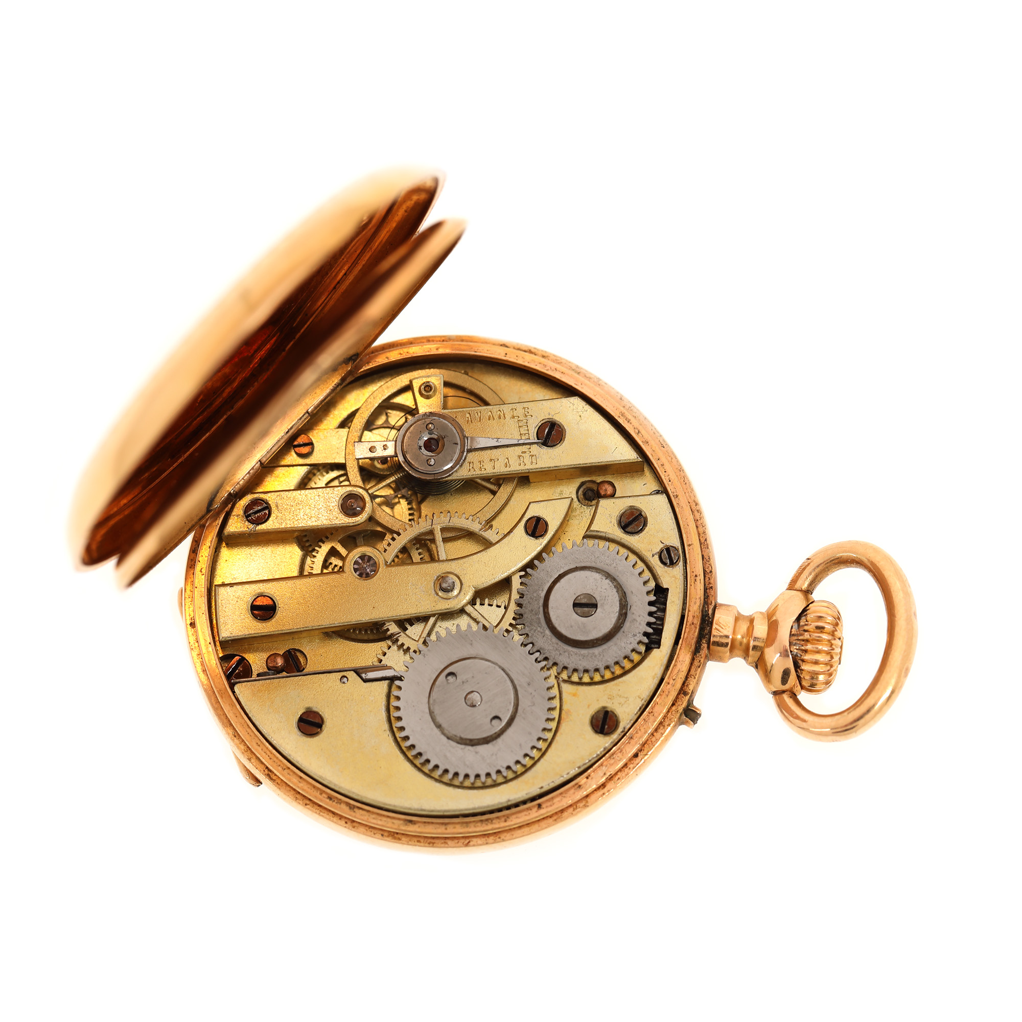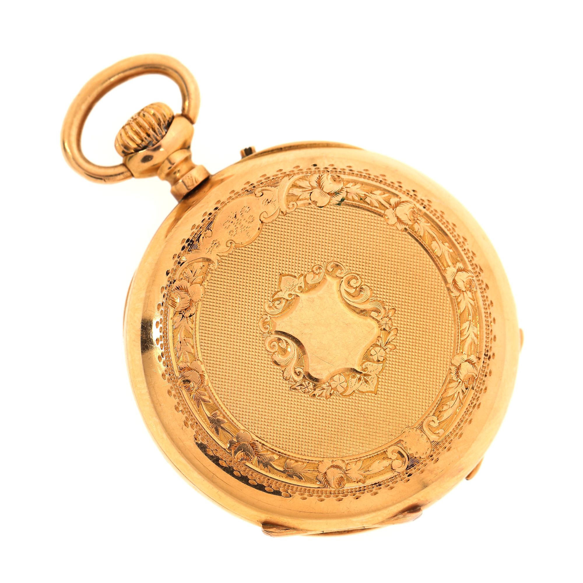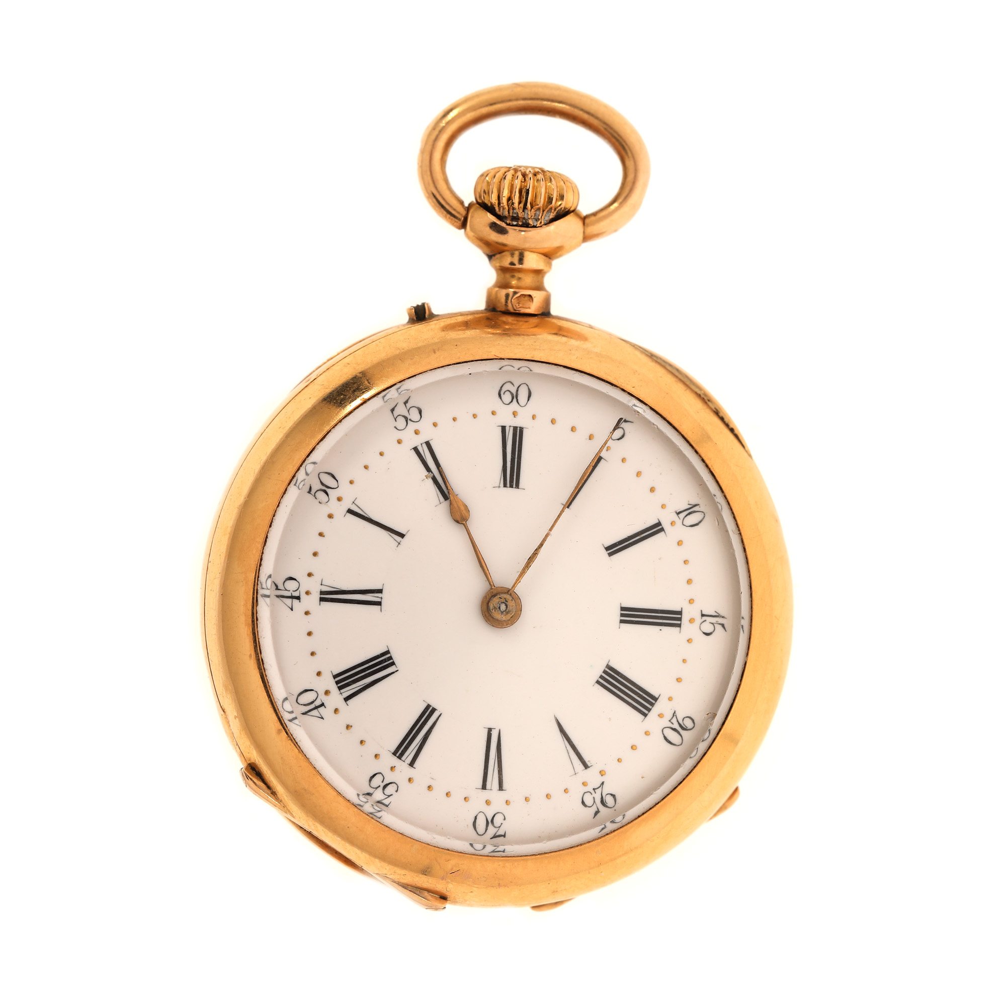 Ceas din aur, de buzunar, de damă. Mecanism cu armare manuală. Cadran de culoare alb, indici numerale romane pentru ore dublați de numerale arabe pentru minute.
