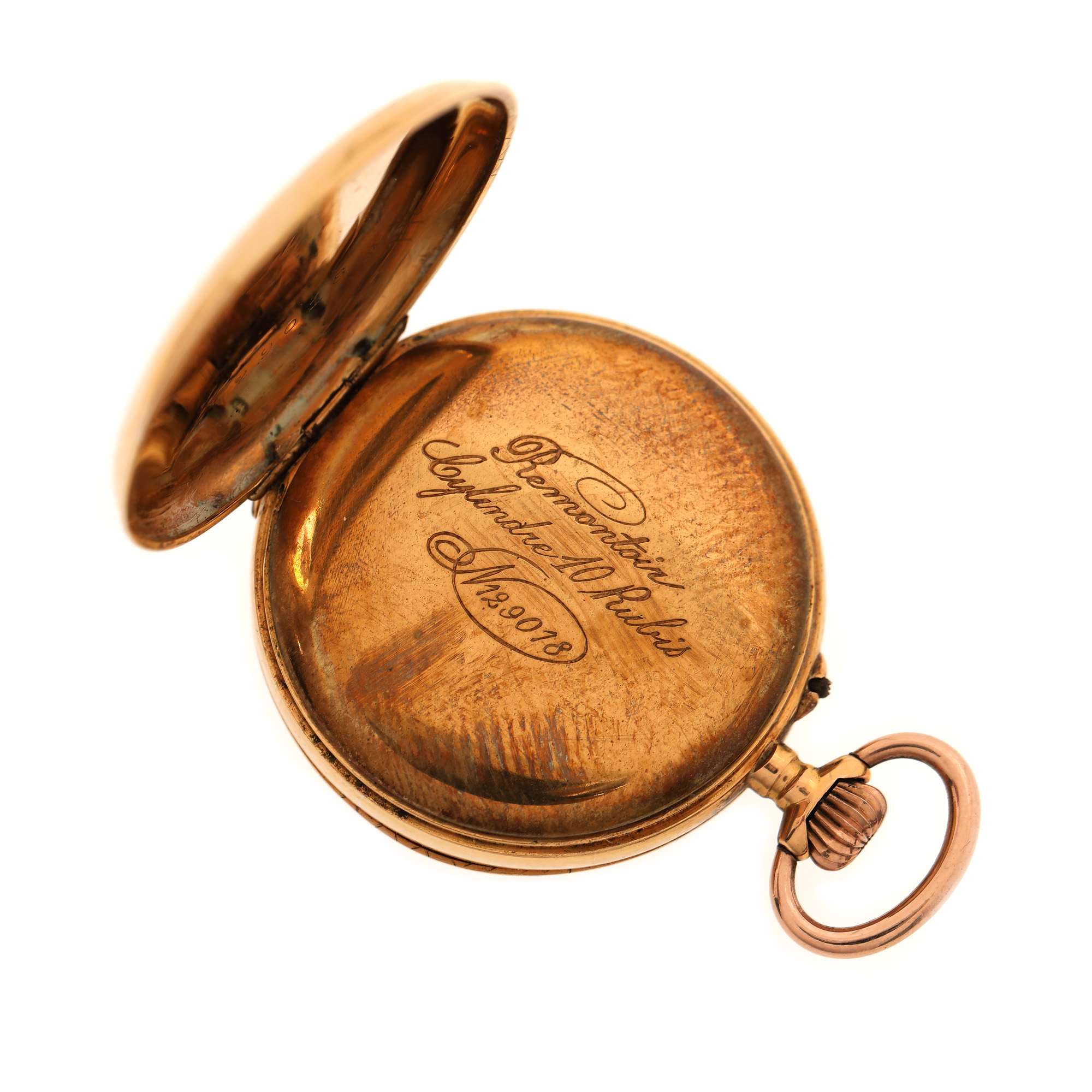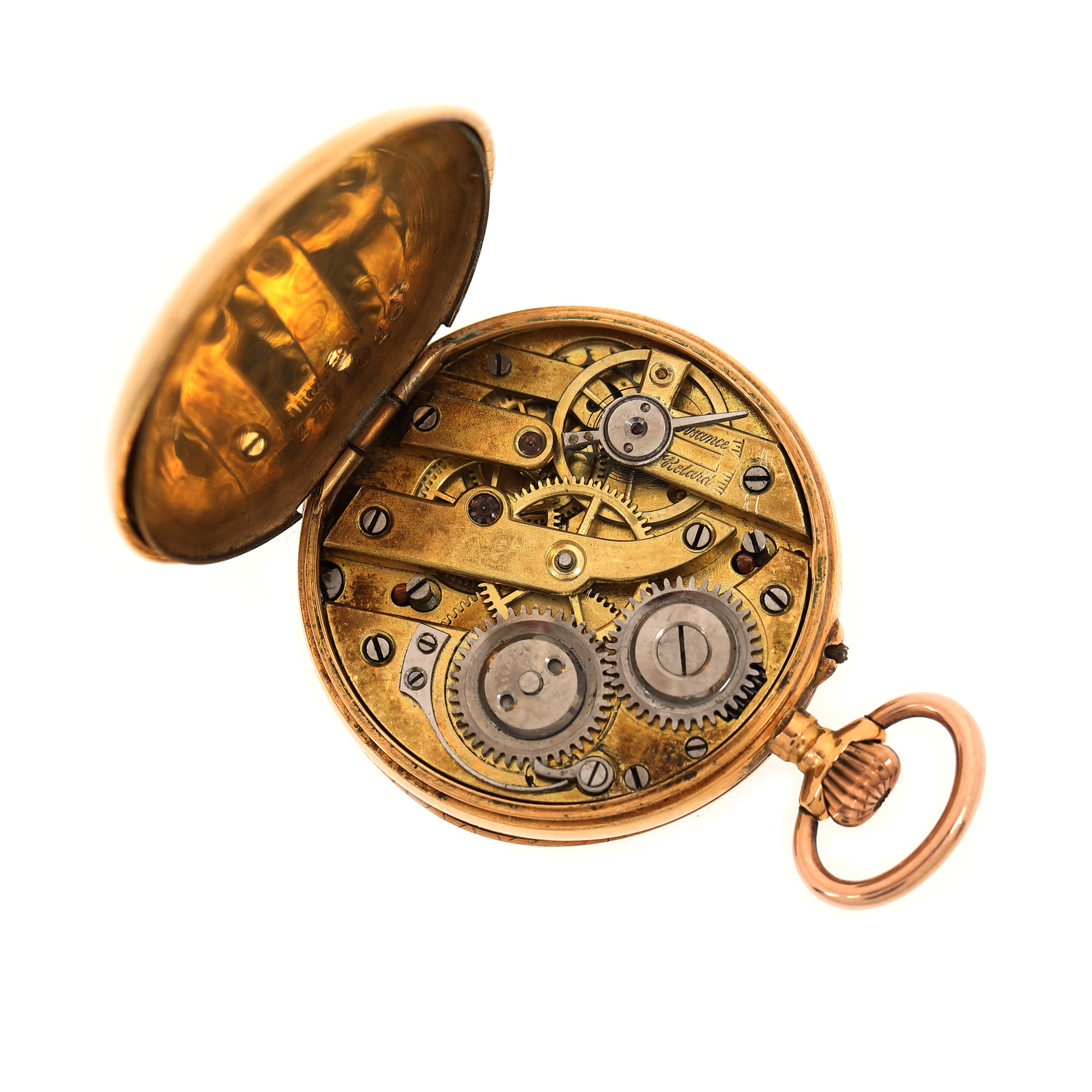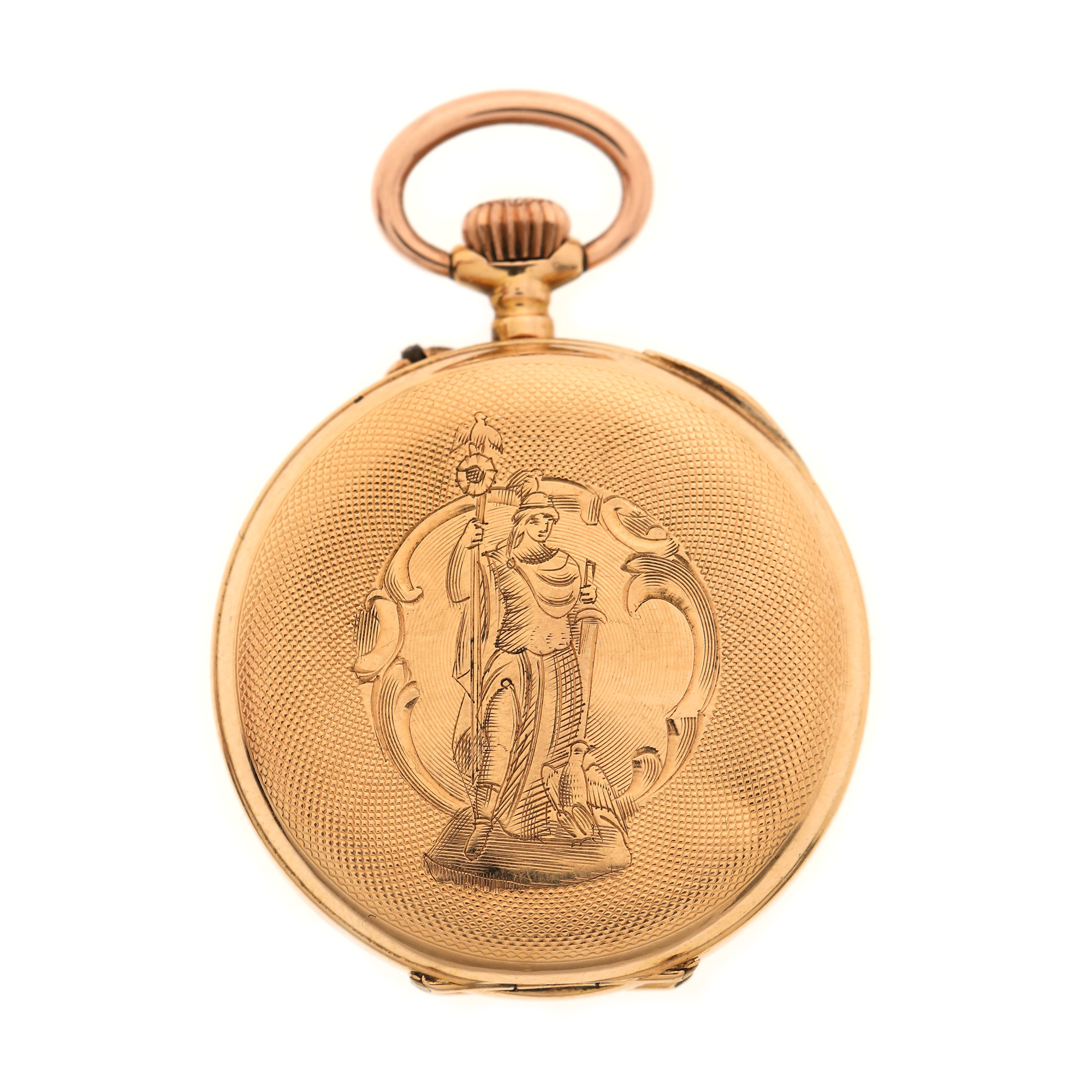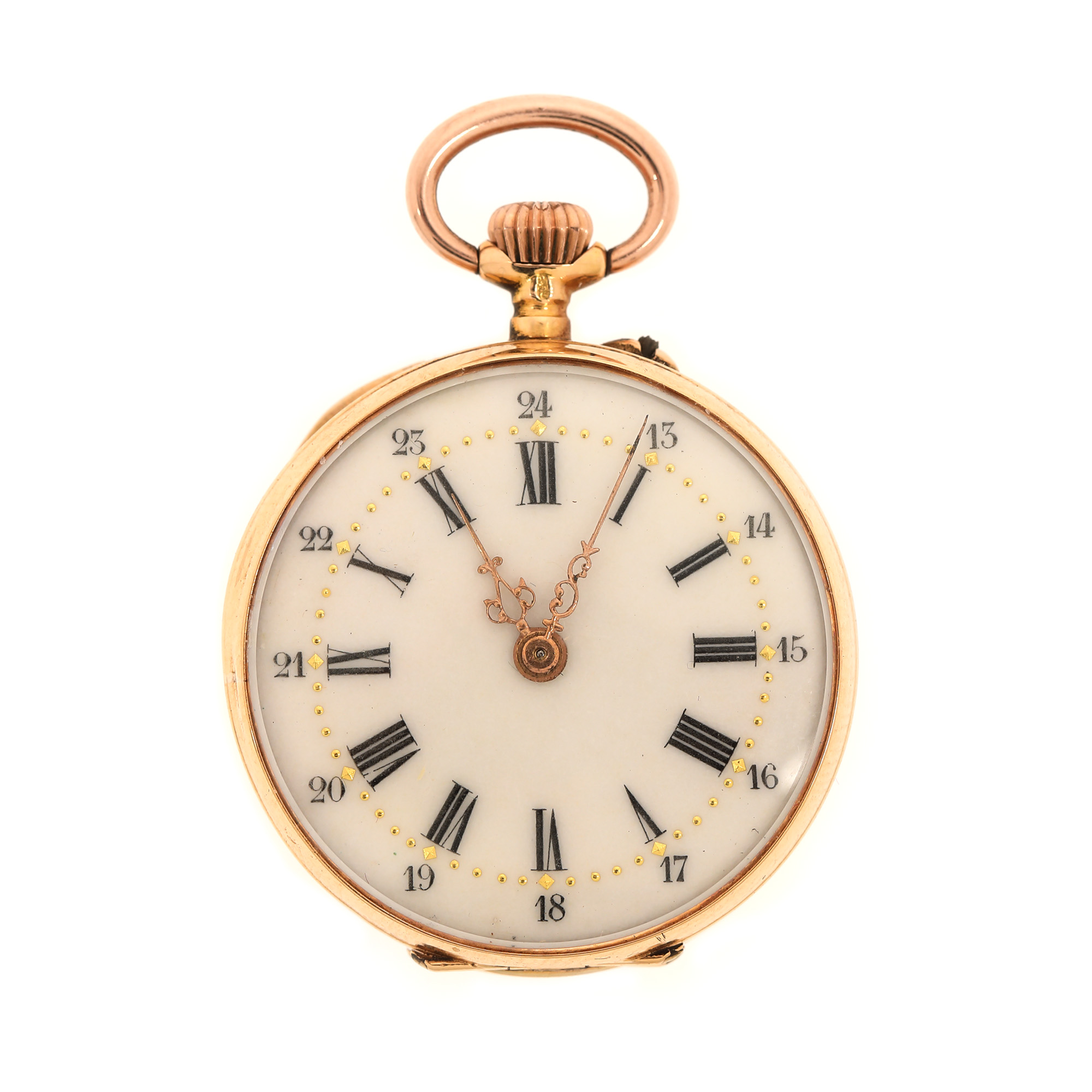 Ceas din aur, de buzunar, de damă. Mecanism cu armare manuală. Cadran de culoare alb cu indici numerale romane pentru 12 h dublate de numerale arabe pentru 24 h.