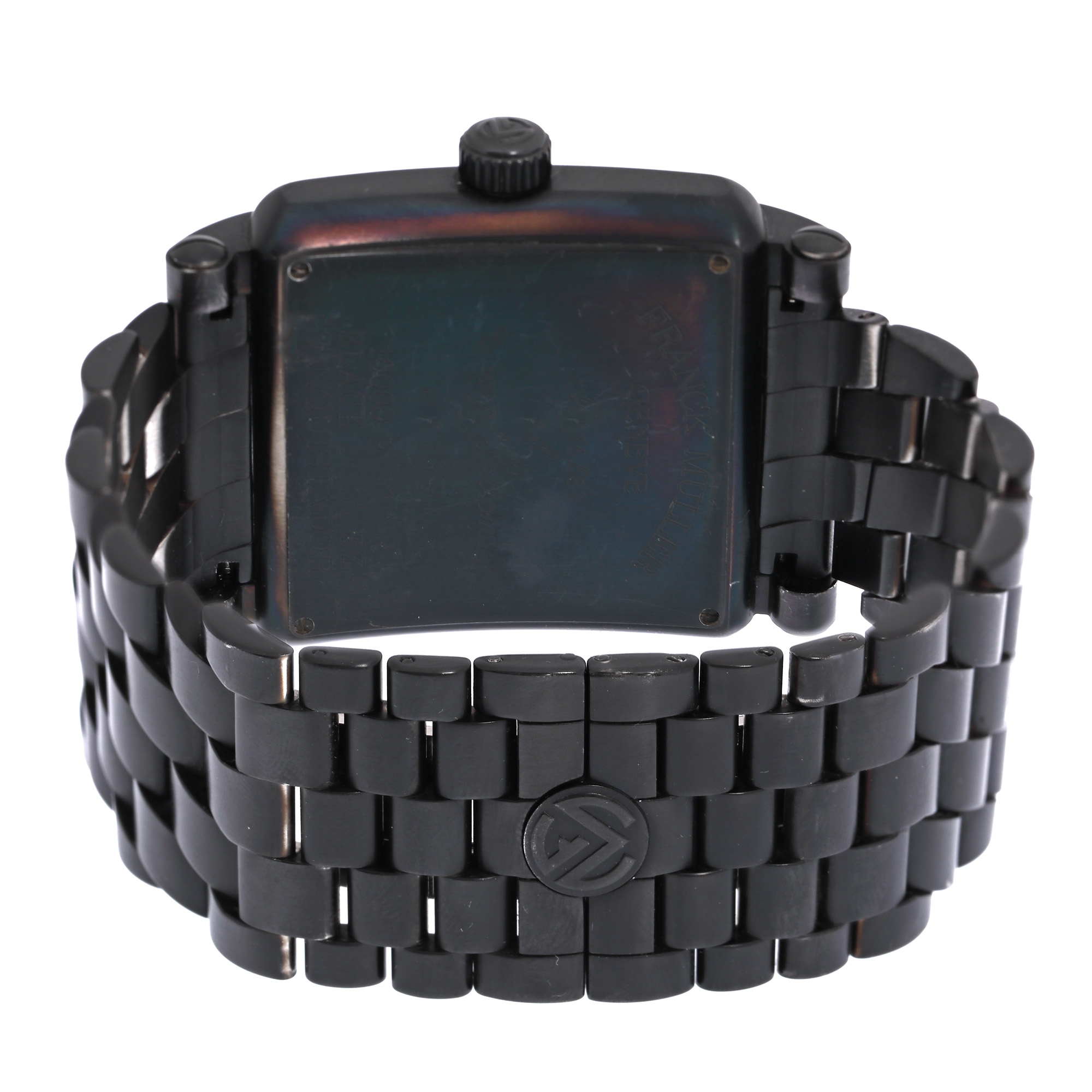 Ceas Franck Muller Black Cortez Conquistador, de mână, bărbătesc, referință 10000 H SC NR. Mecanism automatic. Cadran curbat, de culoare negru cu indici numerale arabe și registru pentru dată în dreptul orei 6. Carcasa și brățara placate cu PVD negru. Brățara originală, din oțel, cu sistem de închidere de tip deployant.