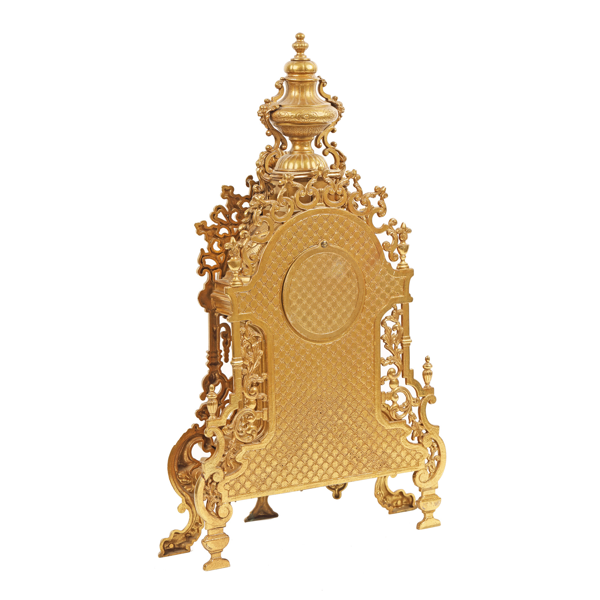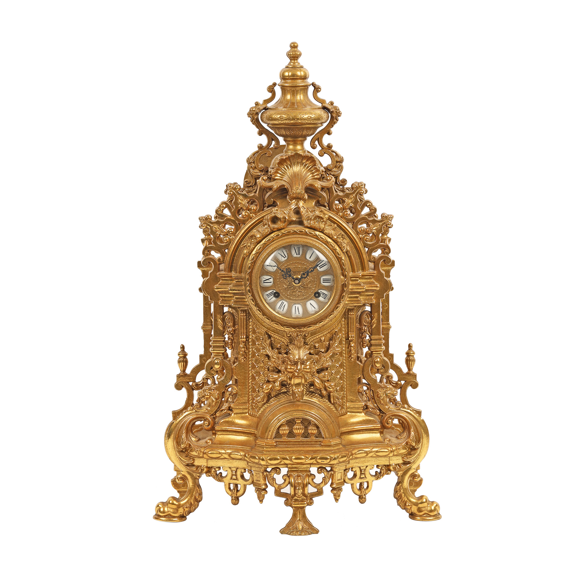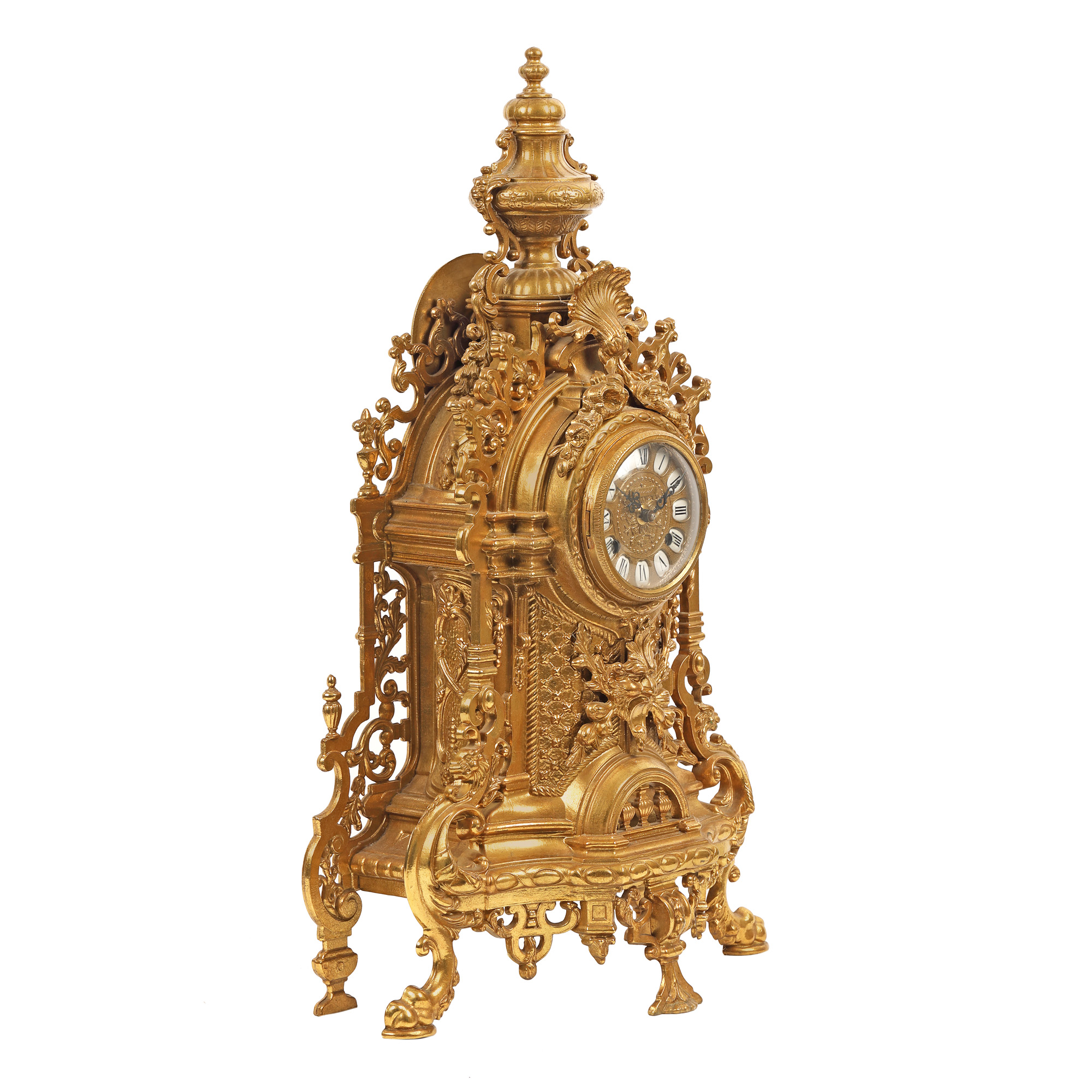 Ceas Imperial, de birou. Mecanism Franz Hermle & Sons, cu armare manuală, cu funcție de alarmă. Carcasă decorată în stil Neo-Rococo.Ceas, bogat decorat cu grifoni și mascaroni, din bronz dore.